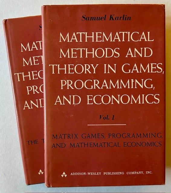 New York: Addison-Wesley, 1959. Cloth. Very Good +/Near Fine. Very sharp copies of the 1959 1st editions, complete in 2 volumes. Vol. I: Matrix Games, Programming and Mathematical Economics; Vol. II: The Theory of Infinite Games. Both volumes solid and VG+ (light offsetting at the endsheets and Vol. II's front pastedown, small, neat former owner name at both front free endpapers) in unusually crisp, easily Near Fine dustjackets. Octavos, "presenting the concepts of game theory and programming theory, together with the related concepts of mathematical economics