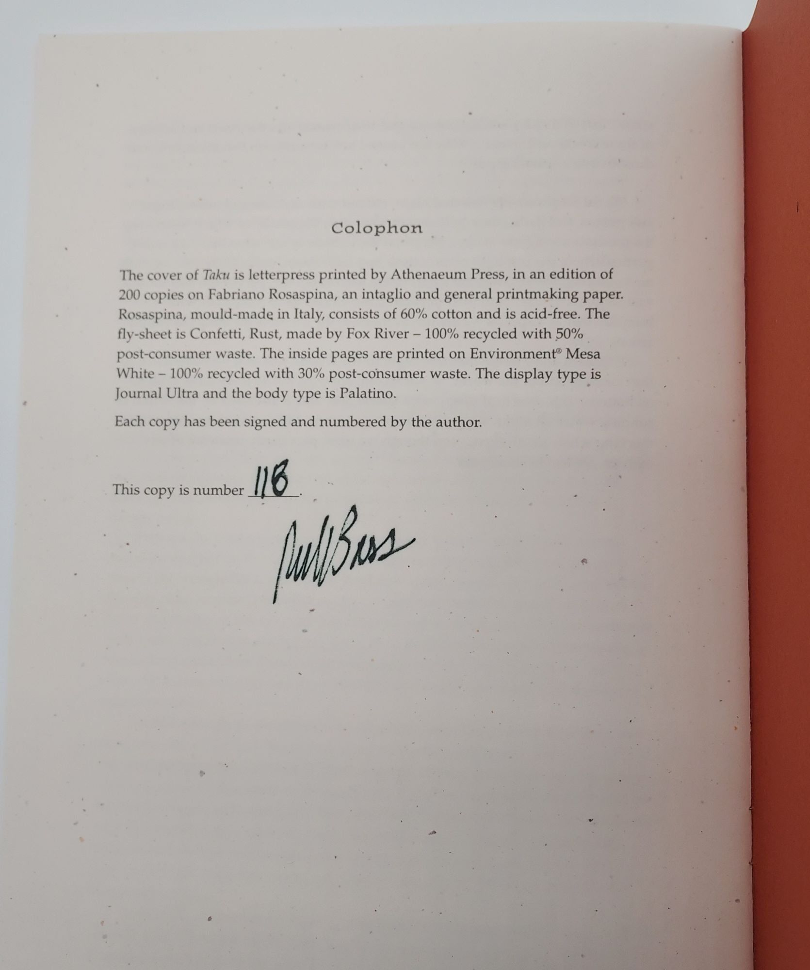 Salt Lake City, UT: Round River Press, 2005. First edition. Paperback. Near Fine. SIGNED. Limited edition chapbook. 23pp. Slim quarto [25 cm] Printed on recycled paper stapled in attractive letterpress wrappers printed by Athenaeum Press. Published for the benefit of Round River Conservation Studies. Signed and numbered by the author on the colophon at rear. Number 118 in an edition limited to 200.
