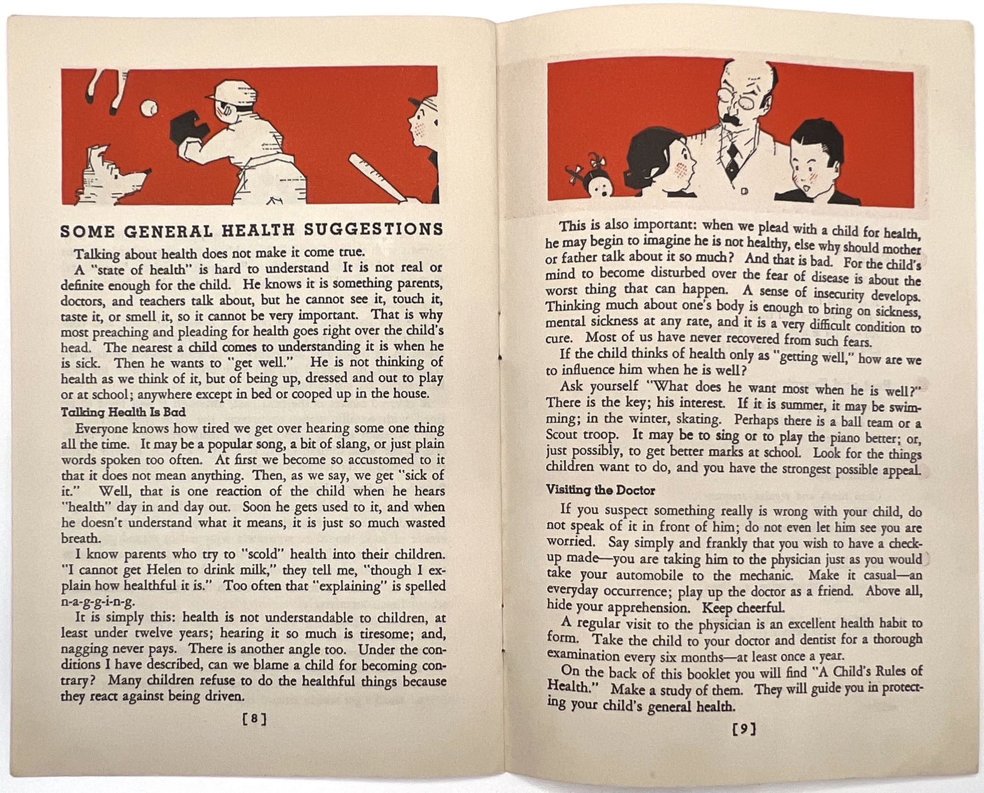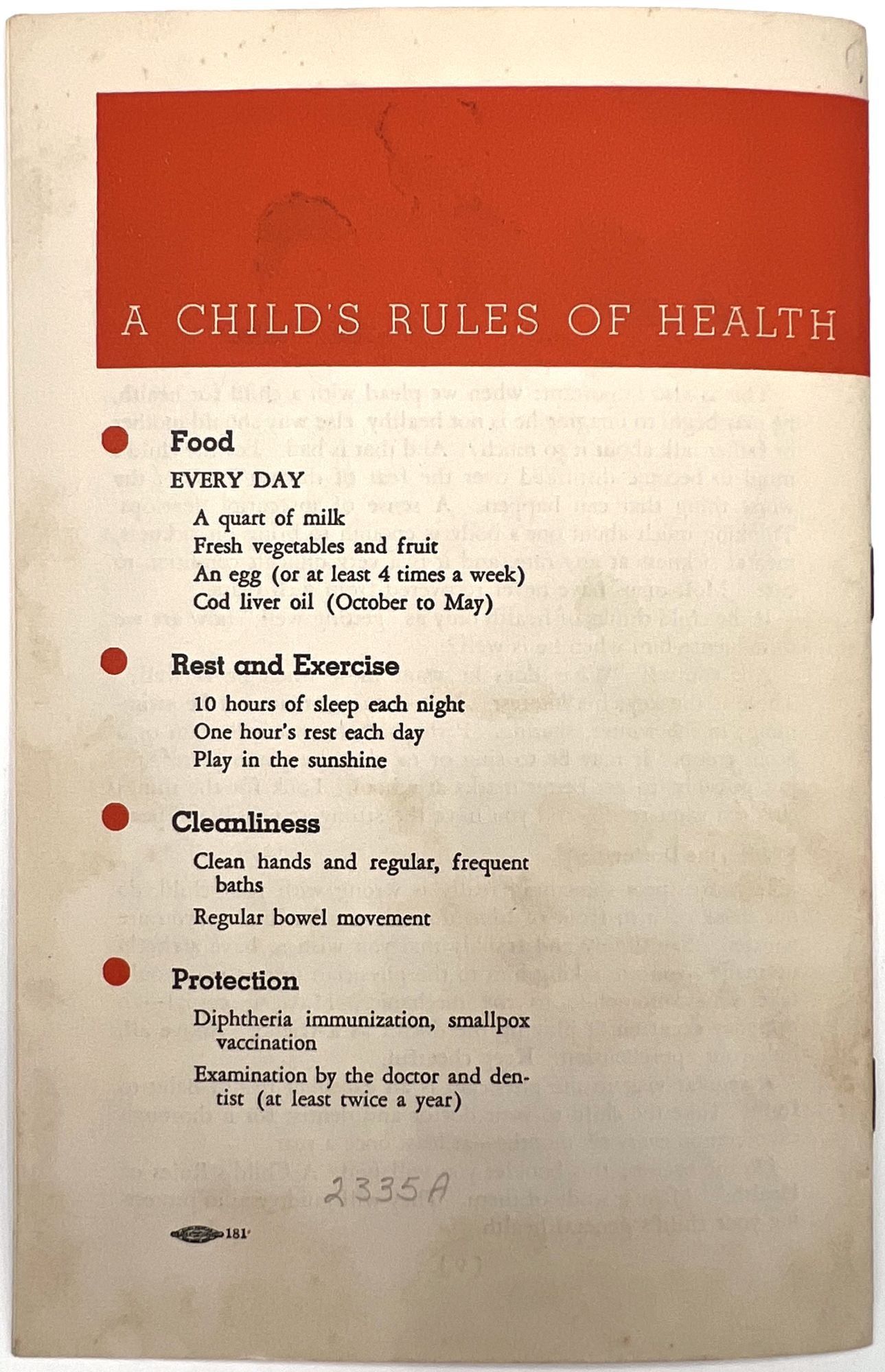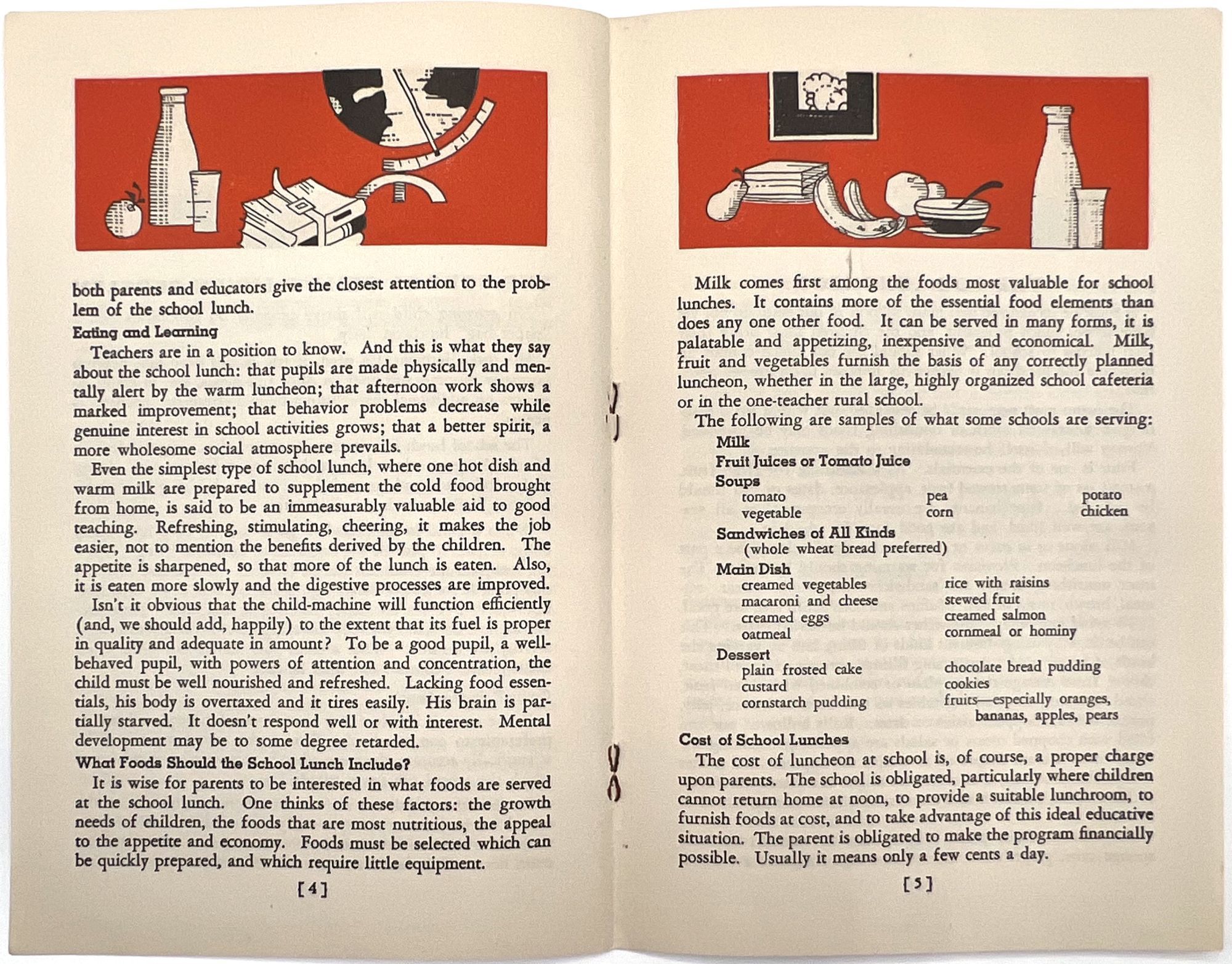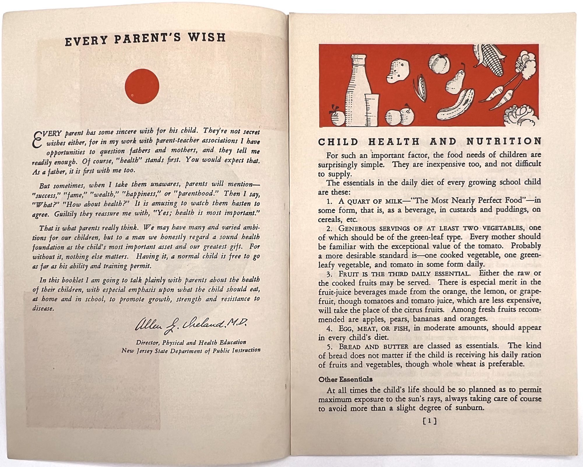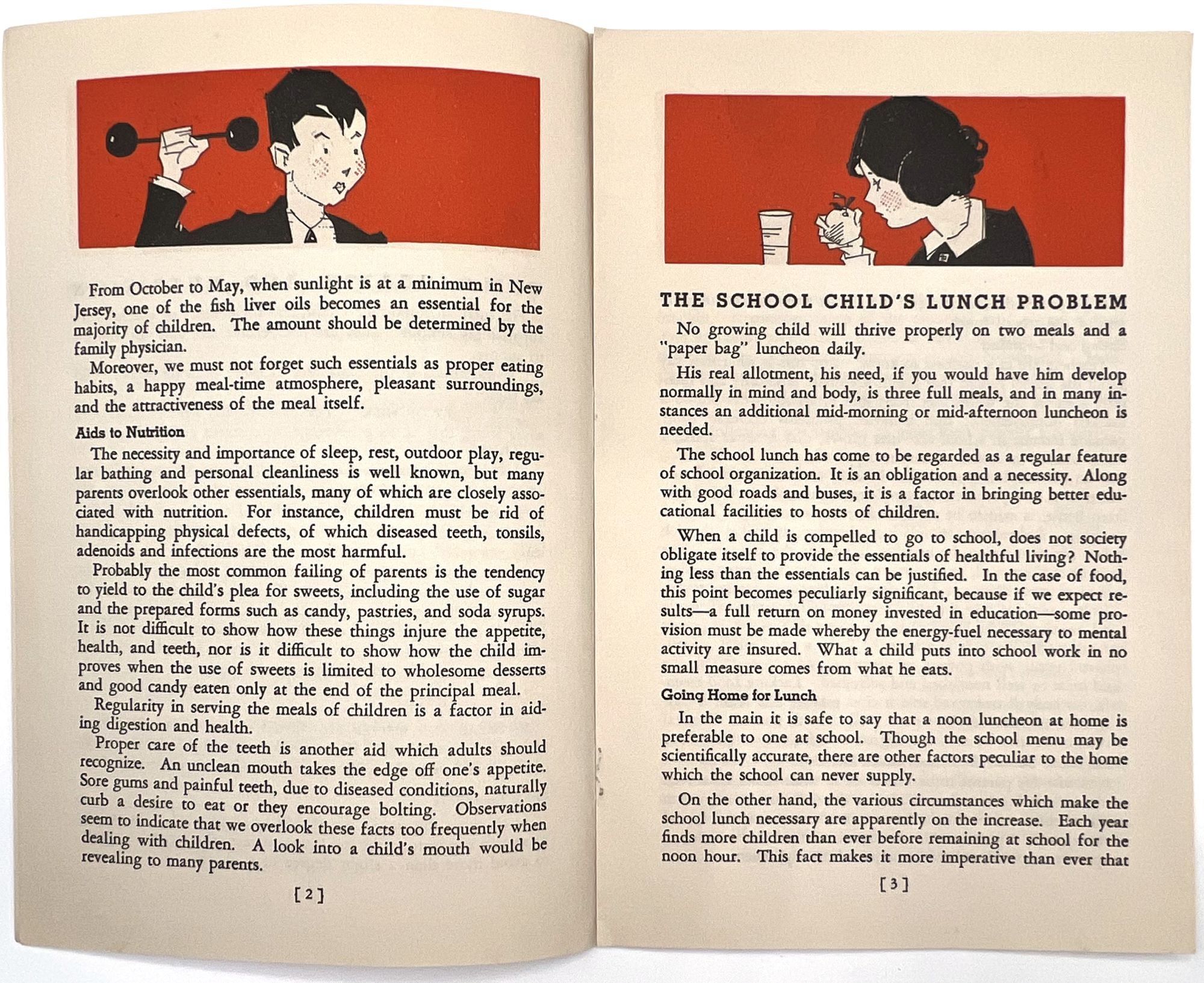 Trenton, New Jersey: N.J. Department of Public Instruction, 1930. Near-fine. Minor staining from stapled.. A guide to proper nutrition in childhood for parents, published by the New Jersey Department of Public Instruction. Written by a doctor in a friendly, informational tone for the general public. Emphasizes the importance of healthy school lunches to proper growth and learning. Includes directions/suggestions for packing a healthy school lunch. Includes a bullet point list on lower wrapper for success: healthy food, rest and exercise, cleanliness, and protection (i.e. immunization).