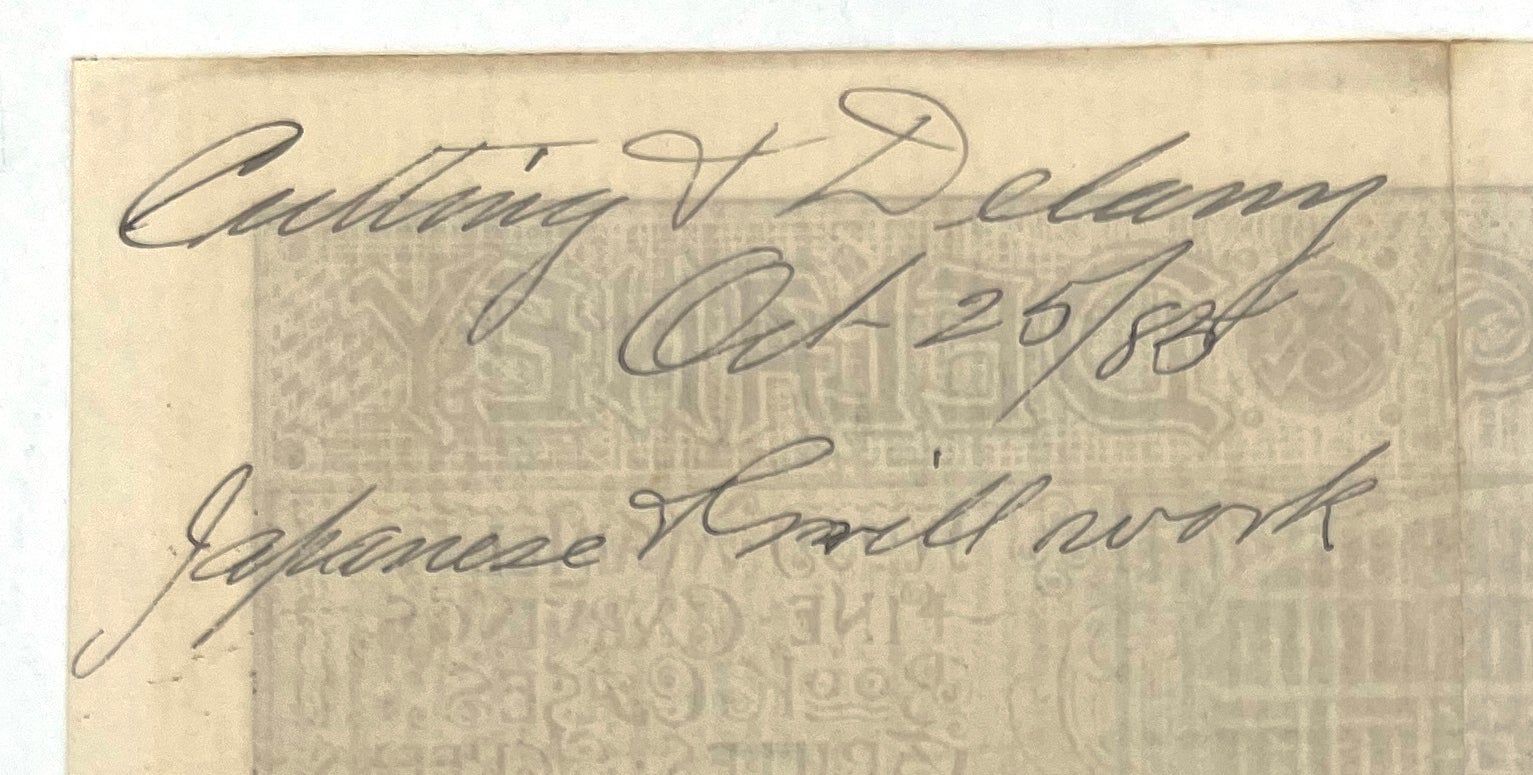 Buffalo, New York: Cutting & Delaney, 1885. Very good. Letter folds.. Handwritten letter on illustrated letterhead from Cutting & Delaney, discussing pricing with a potential client for the firm's specialty Japonisme-inspired woodwork, including fret work, grilles, and fine carvings, screens. The letterhead illustration and typography both showcase the company's distinct Eastern-inspired style, which was highly popular in the United States from the 1880s onward. Measures approx. 9.5" by 5.75", illustrated at head. Contemporary ink ms. to verso. Japonisme is the term for the West's renewed interest in Japanese art and design following the Meiji Restoration in 1868, when Japan ended its period of national isolation from the rest of the world.