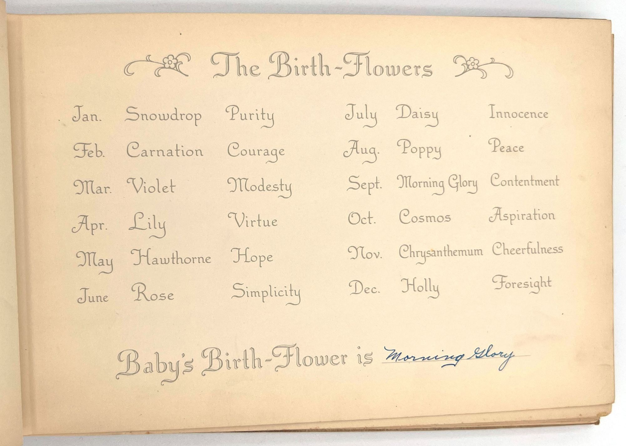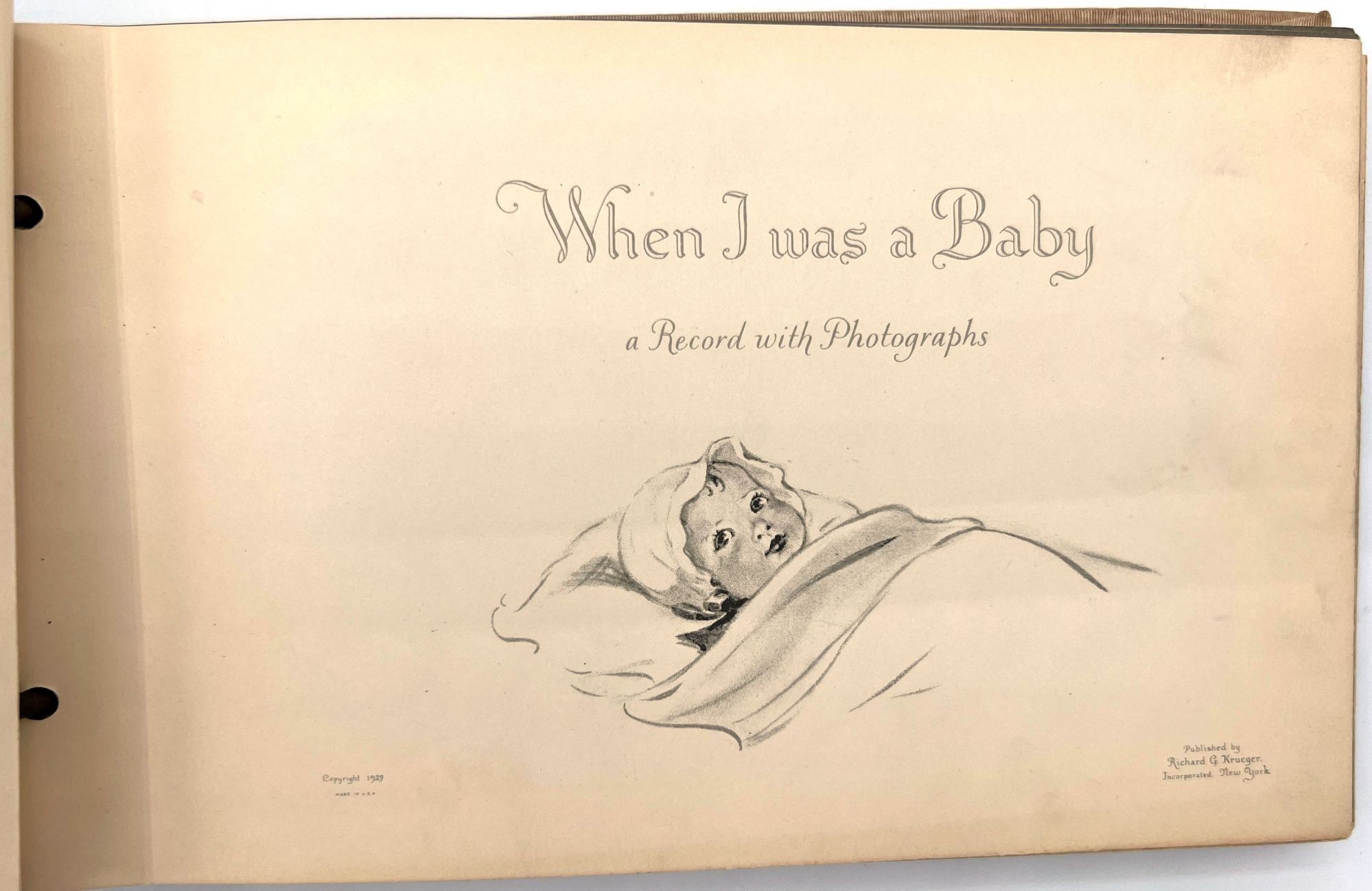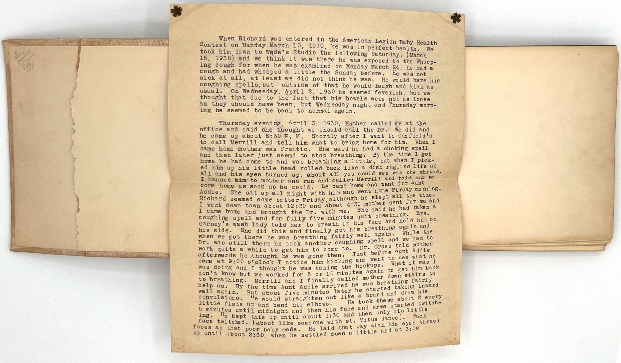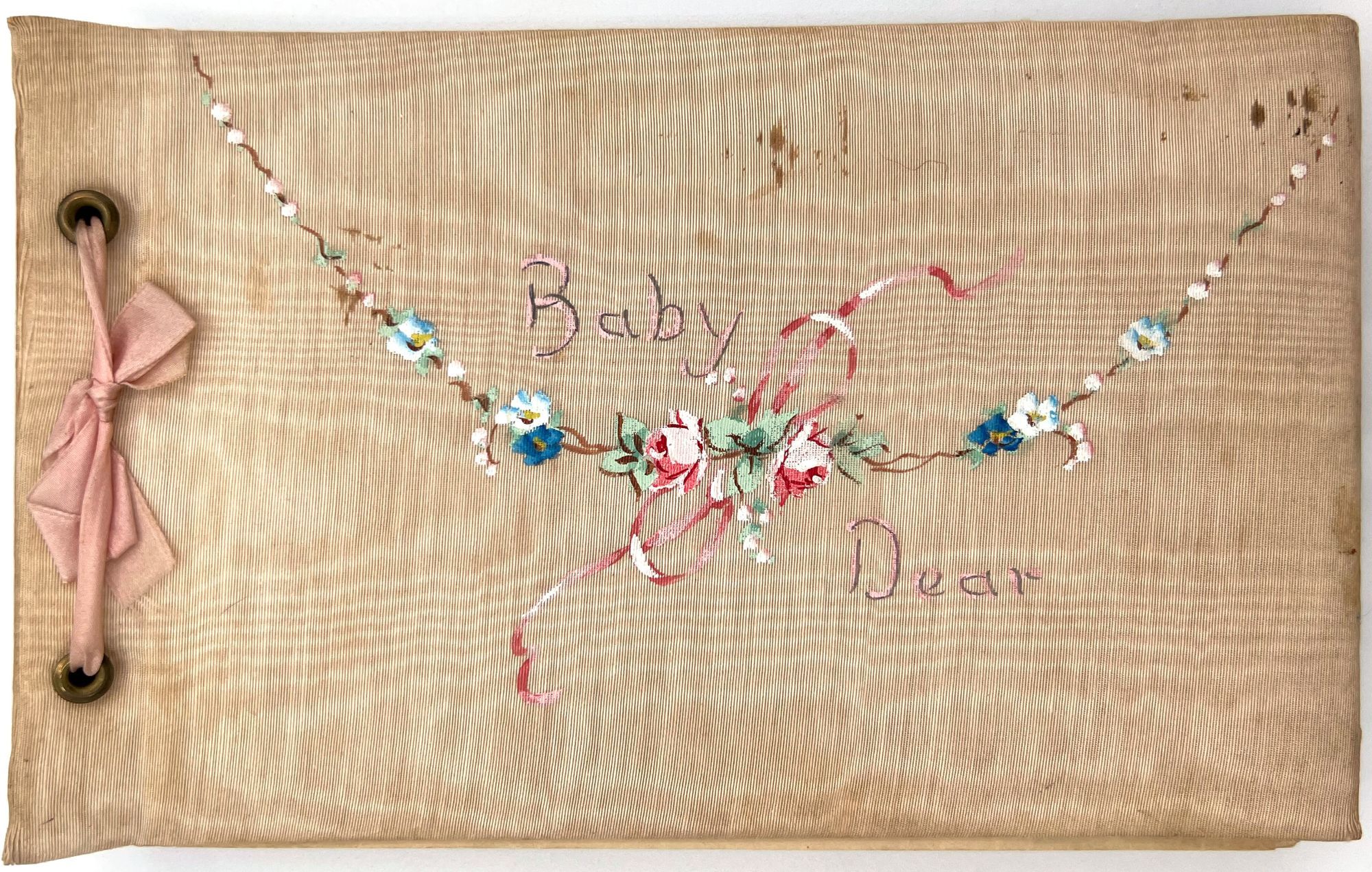 United States, 1929. Very good. Upper board split. Minor stains, wear to silk.. A lovingly produced and heartbreaking baby book with hand-painted silk album cover for Richard Elton Chalker (1929-1930), a baby who died at the age of 7 months of bronchial pneumonia and whooping cough. The book includes: a two-page typewritten account of the baby's illness and subsequent death, in emotional and visceral detail; a family tree; height and weight measurements; a list of baby gifts; his birth flower and stone (Morning Glory, Sapphire); date of first automobile ride (at Landsdowne Airport); date of firth tooth; newspaper clippings with death announcements; a handwritten account of his ill health and death; a list of first Christmas gifts; and two photos of the infant, including a post-mortem image of him in his casket. Oblong 12mo album measures approx. 6" by 9.25"; approx. 50 unnumbered leaves, interleaves, most unused, secured in an album with watered silk cover, hand painted with floral design and the title "Baby Dear