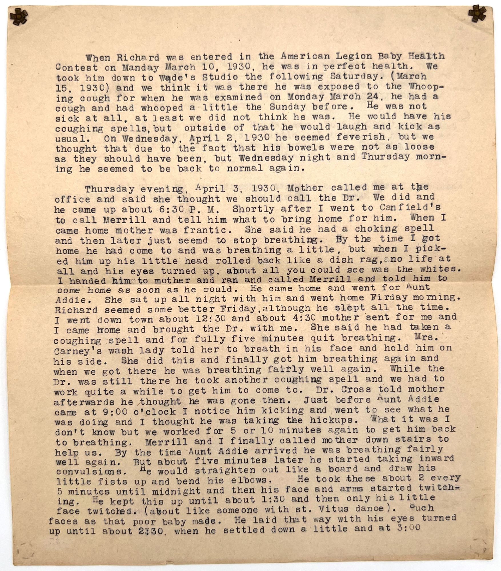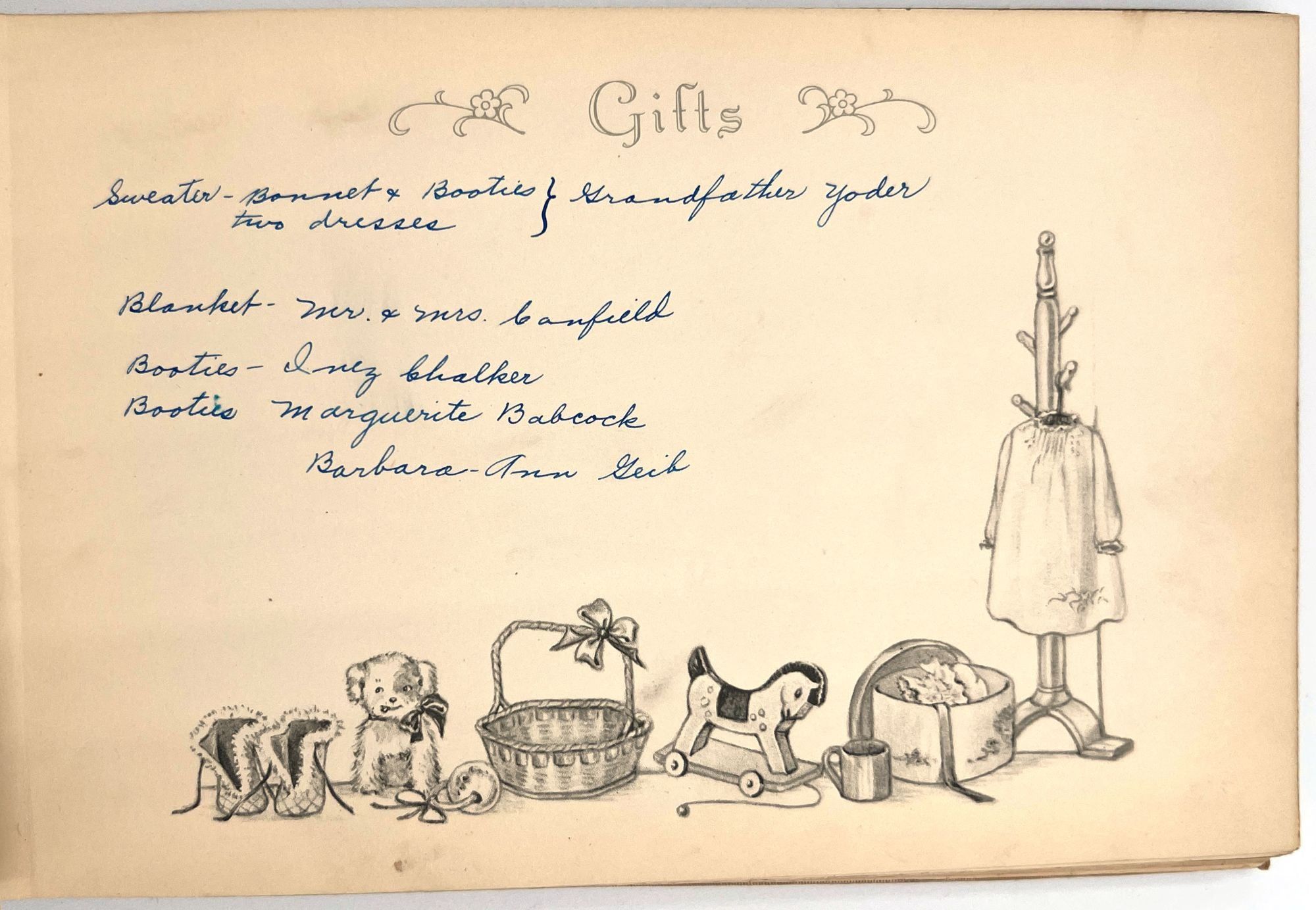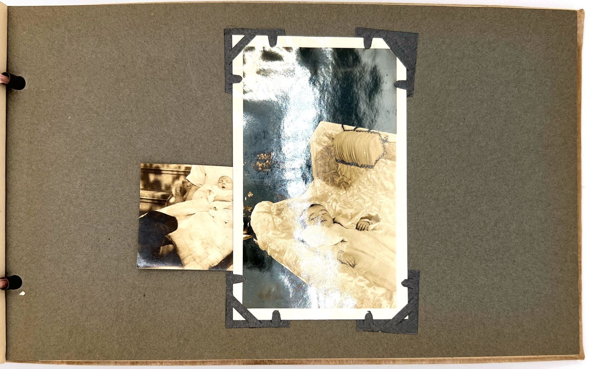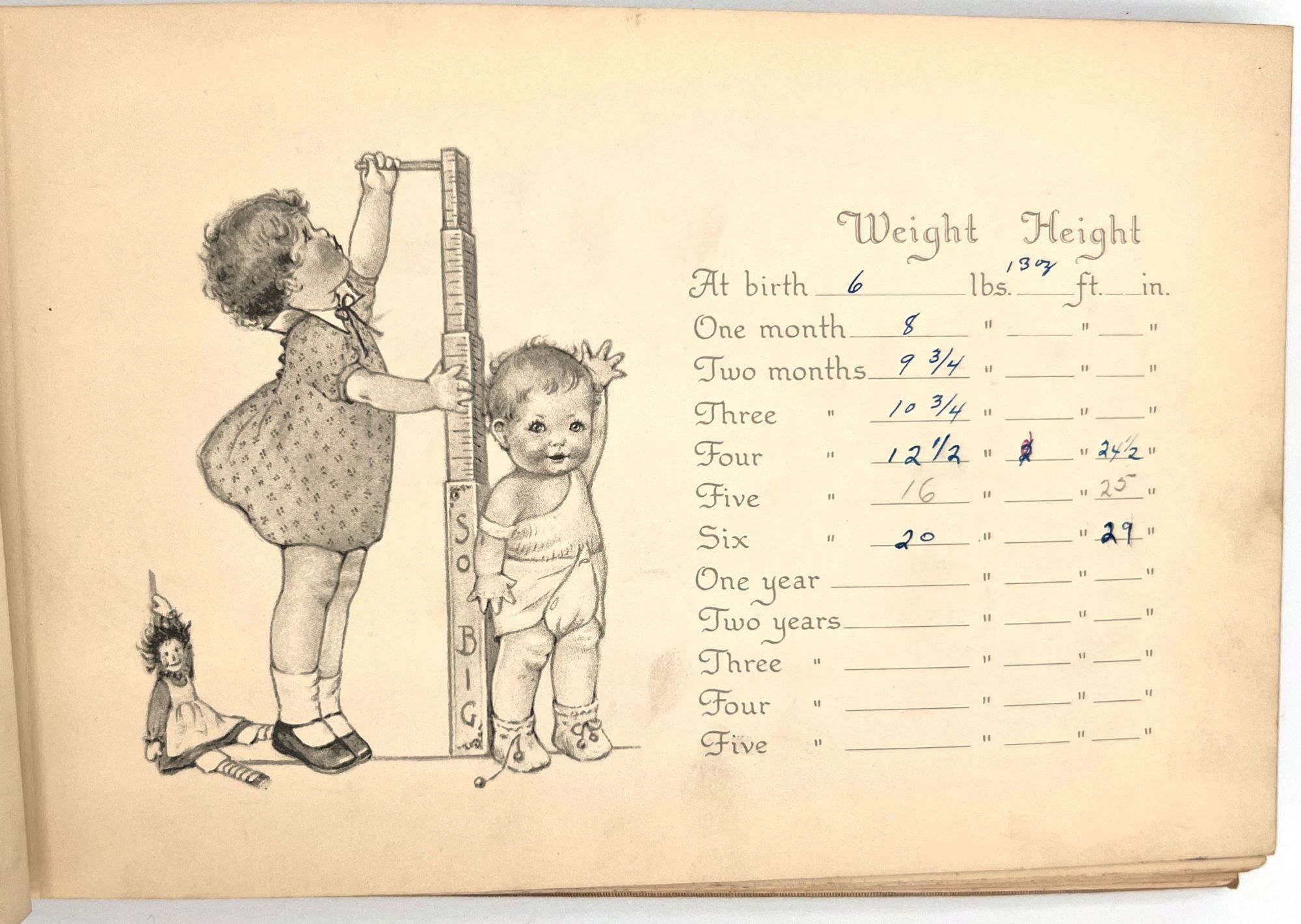 United States, 1929. Very good. Upper board split. Minor stains, wear to silk.. A lovingly produced and heartbreaking baby book with hand-painted silk album cover for Richard Elton Chalker (1929-1930), a baby who died at the age of 7 months of bronchial pneumonia and whooping cough. The book includes: a two-page typewritten account of the baby's illness and subsequent death, in emotional and visceral detail; a family tree; height and weight measurements; a list of baby gifts; his birth flower and stone (Morning Glory, Sapphire); date of first automobile ride (at Landsdowne Airport); date of firth tooth; newspaper clippings with death announcements; a handwritten account of his ill health and death; a list of first Christmas gifts; and two photos of the infant, including a post-mortem image of him in his casket. Oblong 12mo album measures approx. 6" by 9.25"; approx. 50 unnumbered leaves, interleaves, most unused, secured in an album with watered silk cover, hand painted with floral design and the title "Baby Dear