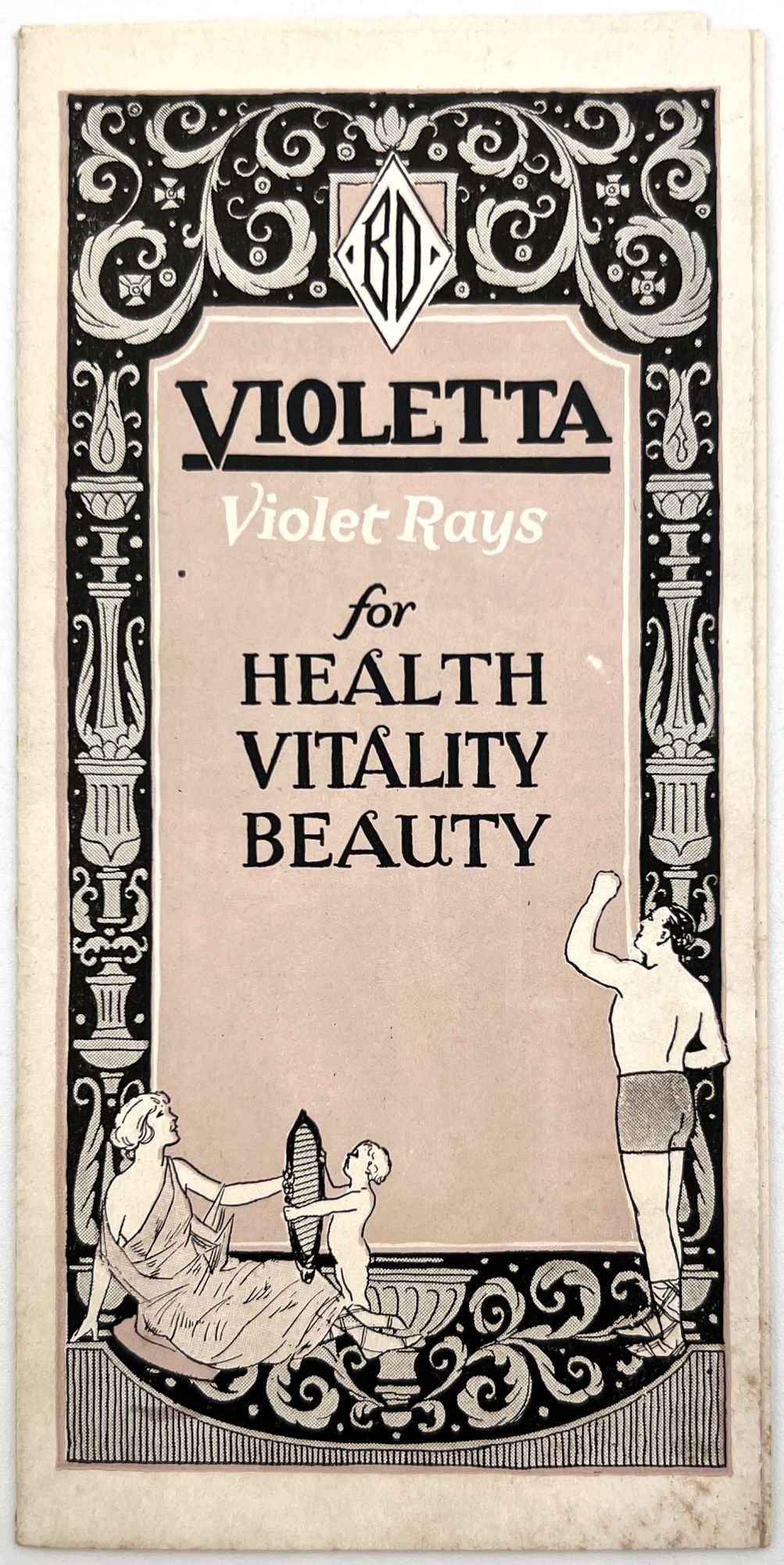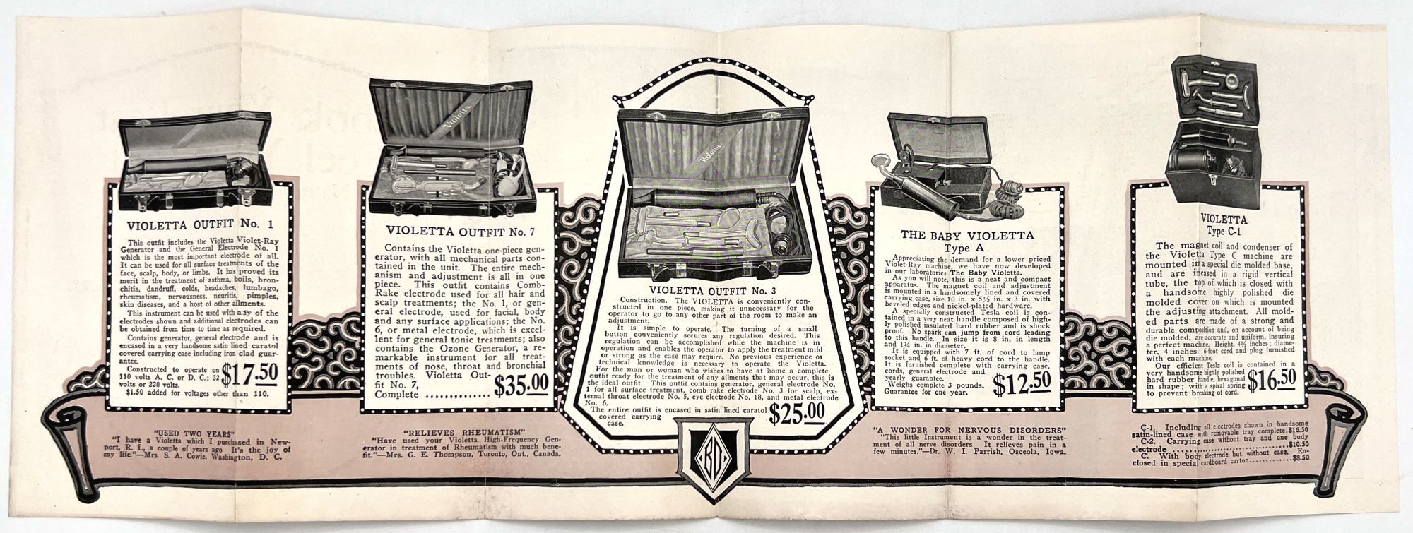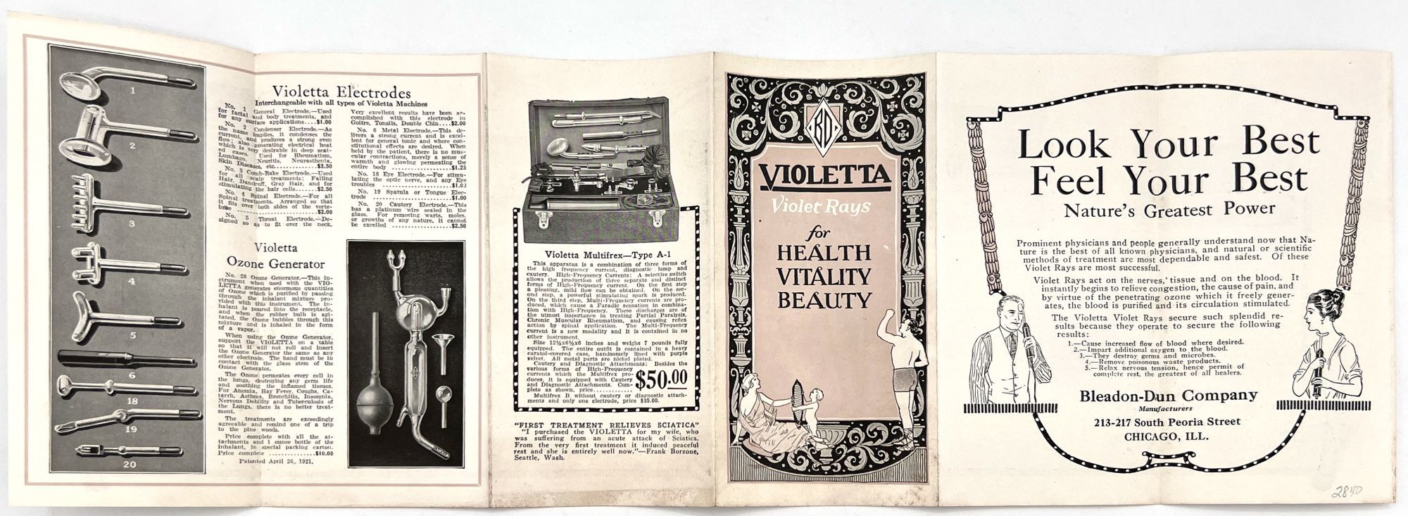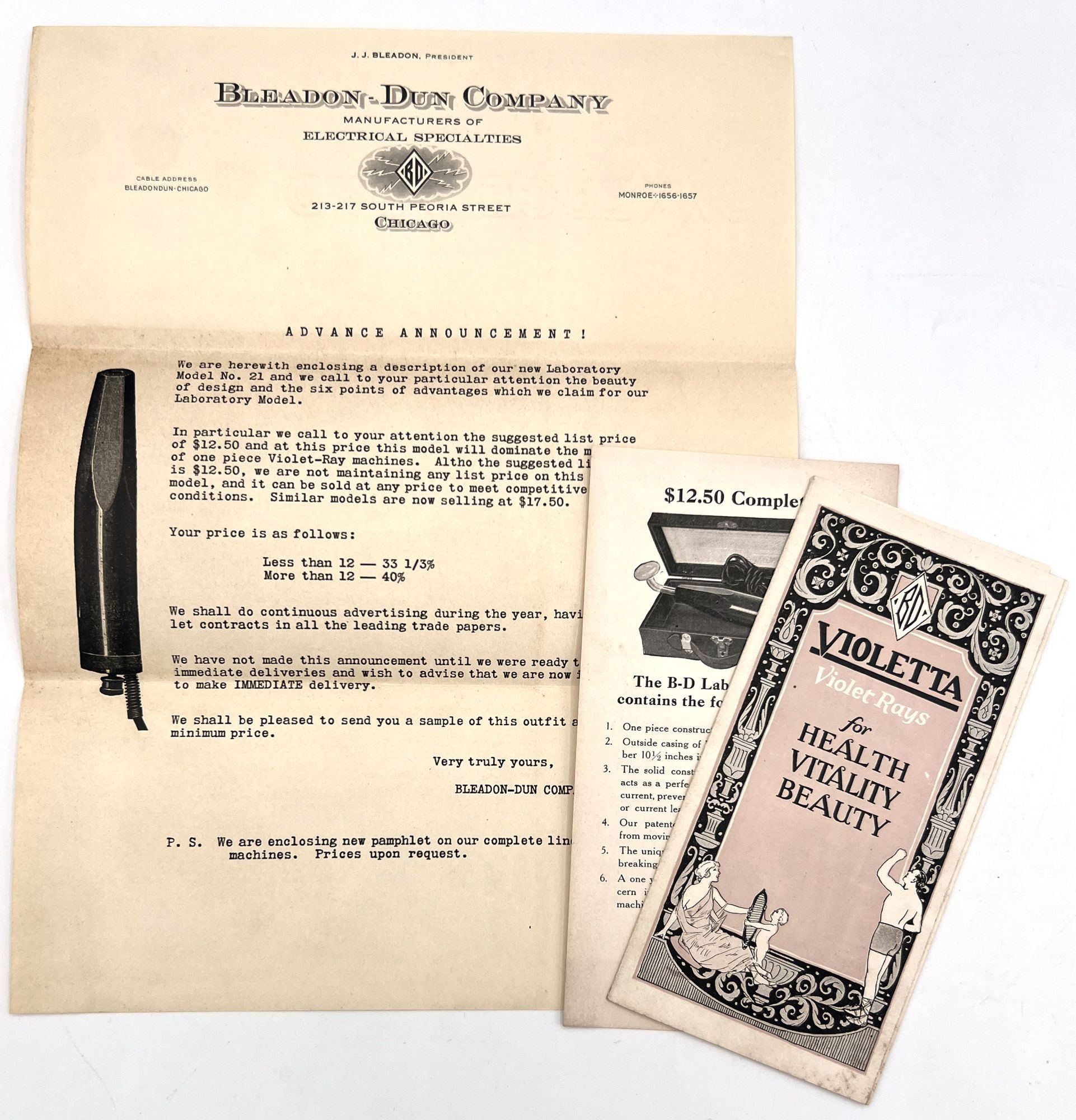 Chicago, Illinois: Bleadon-Dun Co. Very good. Light toning and dust soiling.. Advertising ephemera promoting "Violetta Violet Rays for Health Vitality and Beauty", a light-emitting device with different attachments. For modern viewers, it resembles a kind of hybrid of Gua Sha and LED light therapy, two beauty treatment practices popular with today's beauty influencers on TikTok (a nice example of how companies have been, are, and always will market questionable products to women seeking the fountain of youth). The "Violetta" was also marketed in some sources to families with babies in need of Vitamin D. There are three items here, including: a sales pitch letter printed on company letterhead promoting the product in wholesale to retailers (10.75" by 8.5"; a loose flyer advertising two of the company's products with illustrations, pricing, and model numbers (6.25" by 3.5"); and an illustrated folding pamphlet outlining the "Violetta", its different attachments and models (6.25" by 3" folded).