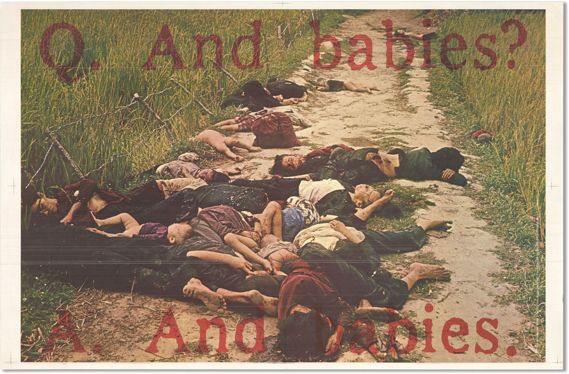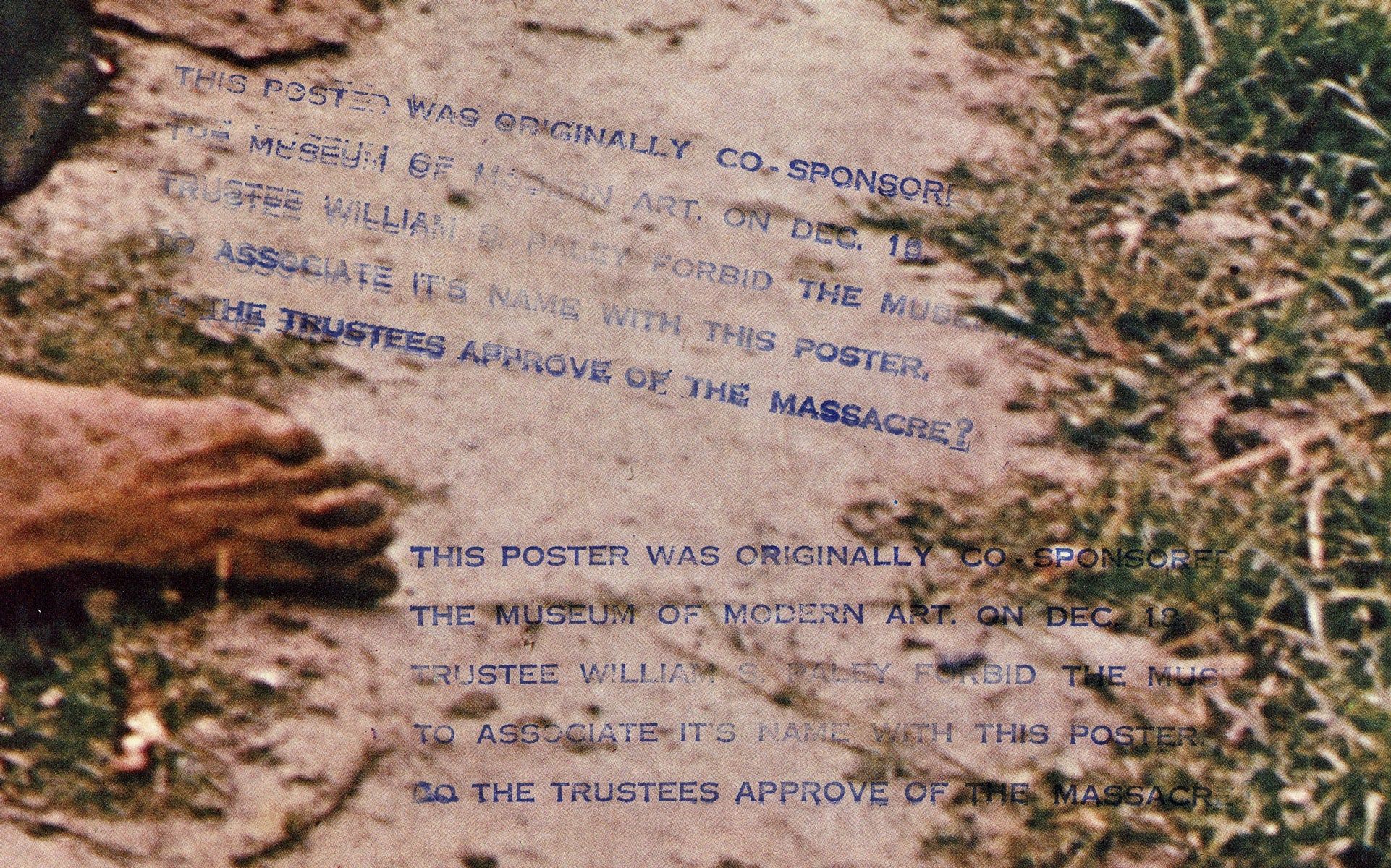 New York: Art Workers Coalition, [1970]. Offset lithograph in colors; 64cm x 97cm (25" x 38"). Mild creasing to extremities, else a fine, clean copy; unbacked. This one of a presumably small number of copies bearing a rubber-stamped message which reads: "This poster was originally co-sponsored by the Museum of Modern Art. On Dec. 19, trustee William S. Paley forbid the Museum to associate its name with this poster. Do the Trustees approve of the massacre?" (stamped twice in the image, lower right).