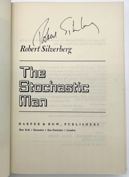 New York: Harper & Row, Publishers, 1975. Review copy. Hardcover. Very Good/Very Good. SIGNED. 229pp. Octavo [21cm]. 1/4 black cloth with turquoise boards. Title stamped in silver ink on spine. Spine ends gently bumped. Extremities a touch sun toned. Mild dampstaining to fore edge of textblock. In a price clipped dust jacket with light soiling to rear panel. Publisher's review copy, with slip laid in. Signed by Robert Silverberg on the title page.