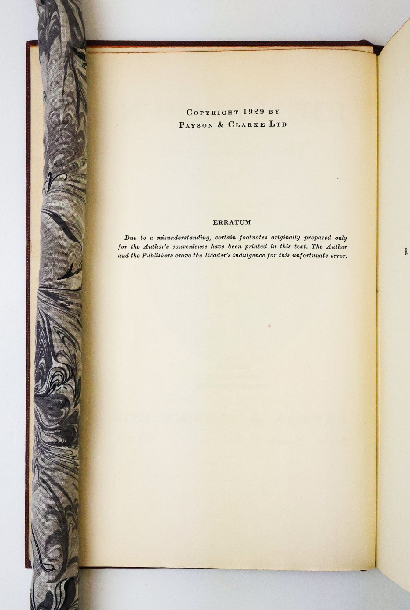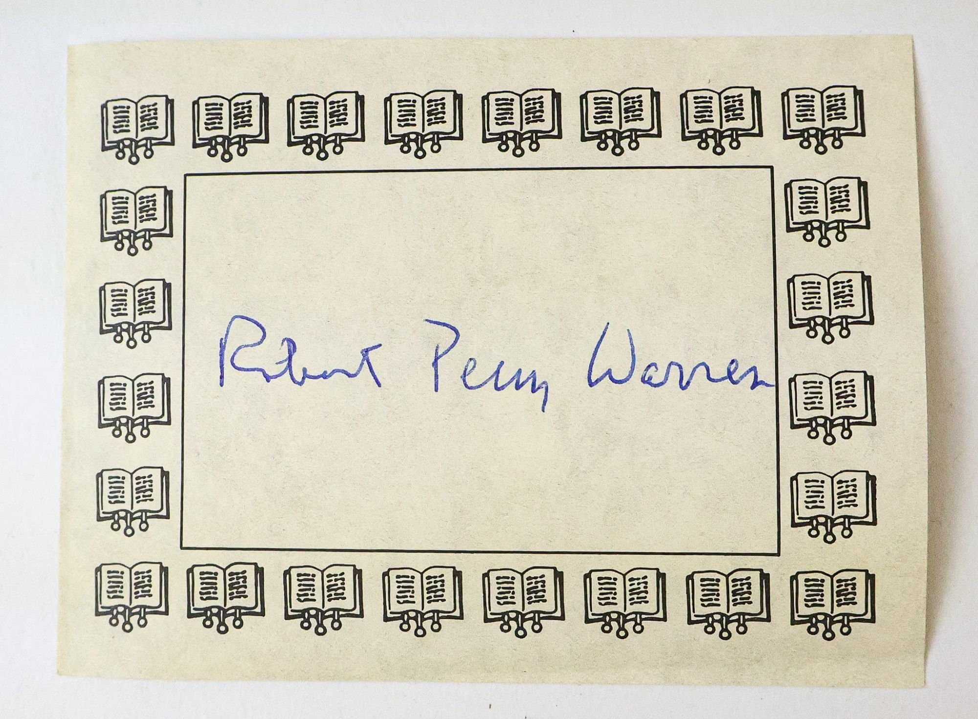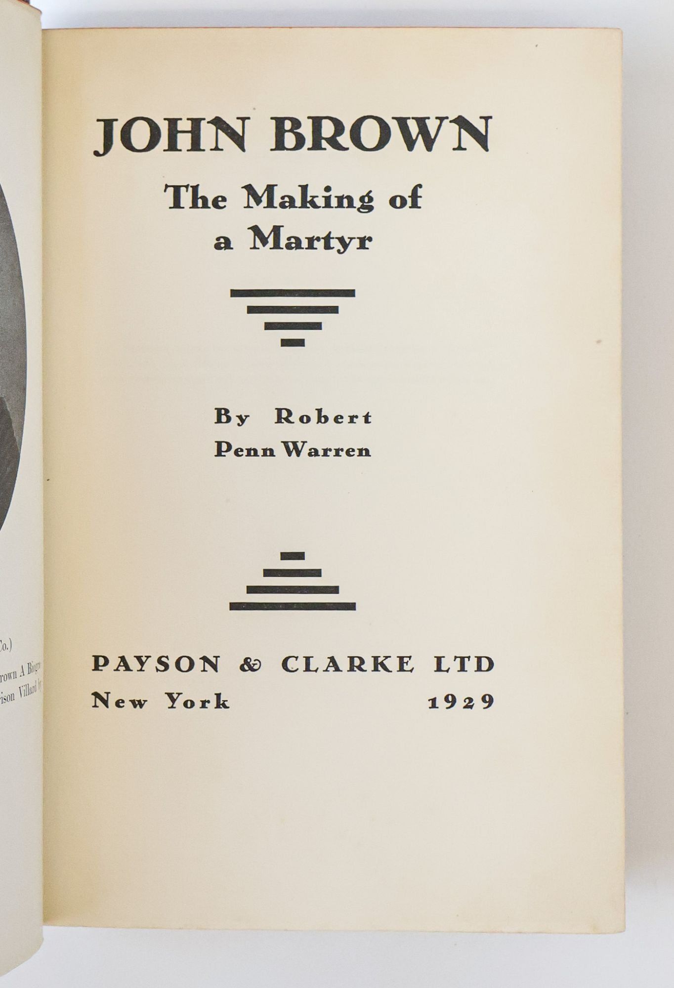 New York, NY: Payson & Clarke Ltd, 1929. First Edition. Hardcover. Octavo, 474 pages. In Good condition lacking the issued dust jacket. Boards have rubbing wear along the edges, and bending wear along the spine head/tail and fore corners. Textblock has a tear on pages 355/356, a light stain on page 186, splitting along the gutter between the half-title page and frontispiece and along the hinge of the rear pastedown page and end-page, and age toning and minor wear along the edges. Contains a loose signed bookplate by Robert Penn Warren. DL consignment. Shelved in Room C. Warren's first book, John Brown: The Making of a Martyr (1929) was reportedly issued in an edition of only 500 copies. 1395011. Special Collections.