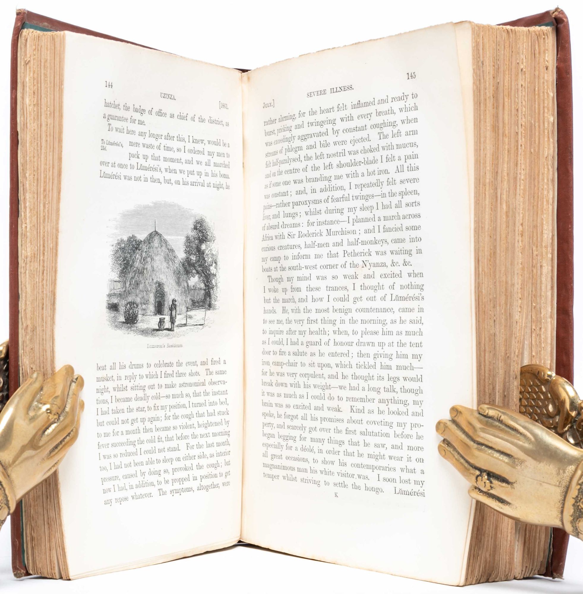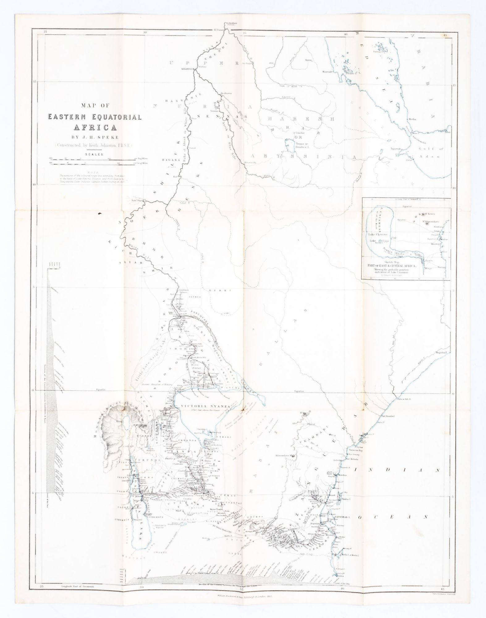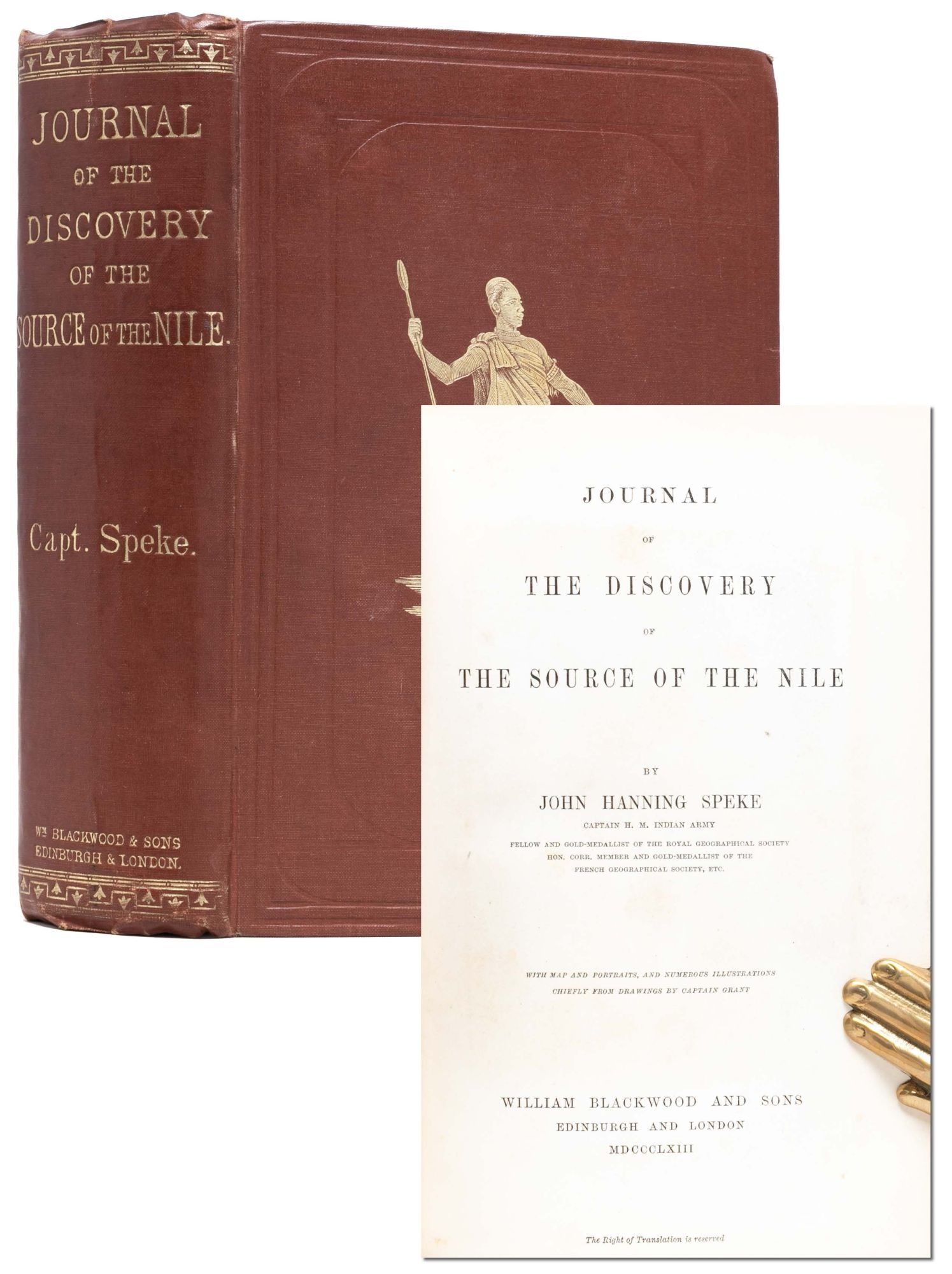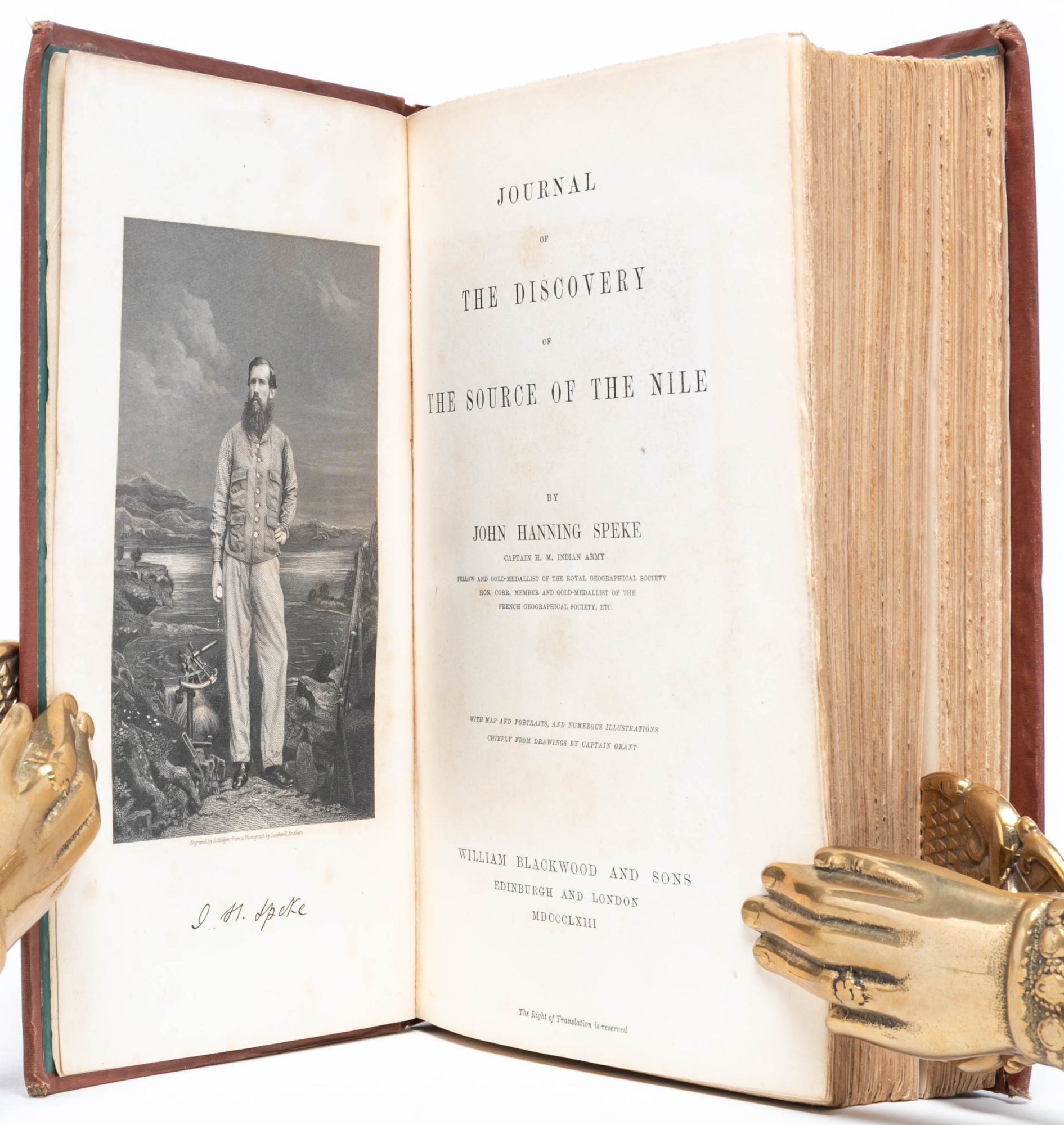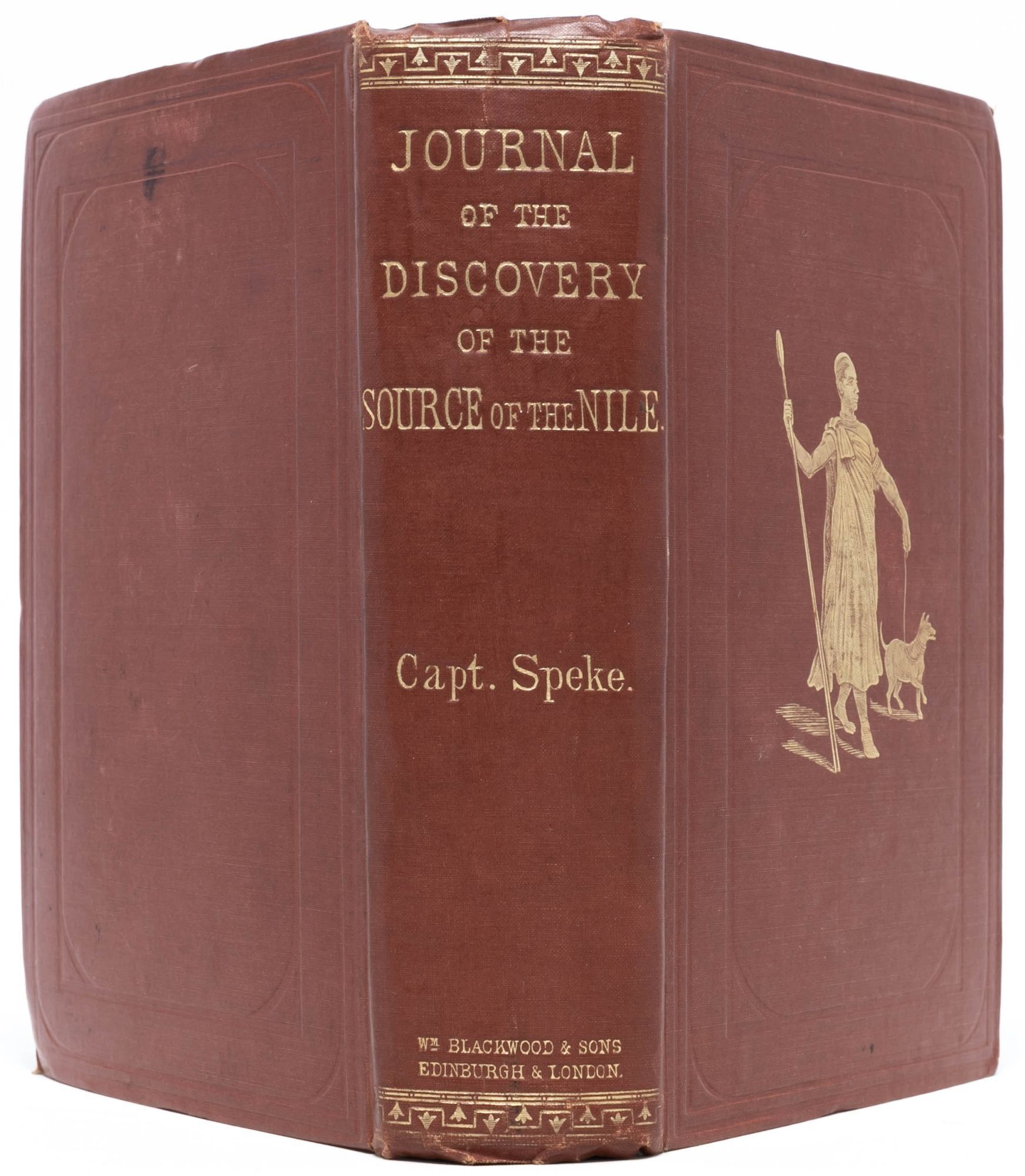 Edinburgh and London: William Blackwood and Sons, 1863. First edition. Near Fine. Publisher's orange cloth with gilt figure. Octavo. xxxi, [1], 658, [34, ads] pp. Collating complete with twenty-seven plates (including frontisportrait of Speke) and the large fold-out map (445 x 570 mm) of Eastern Equatorial Africa tucked into the pocket beneath lower pastedown (as issued). Binding is clean and attractive despite some bumping to corners. Teal endpapers, somewhat rubbed, with some splitting to lower gutter. Occasional slight foxing to versos of plates. Fold-out map with some wear to creases. A bright, Near Fine copy.