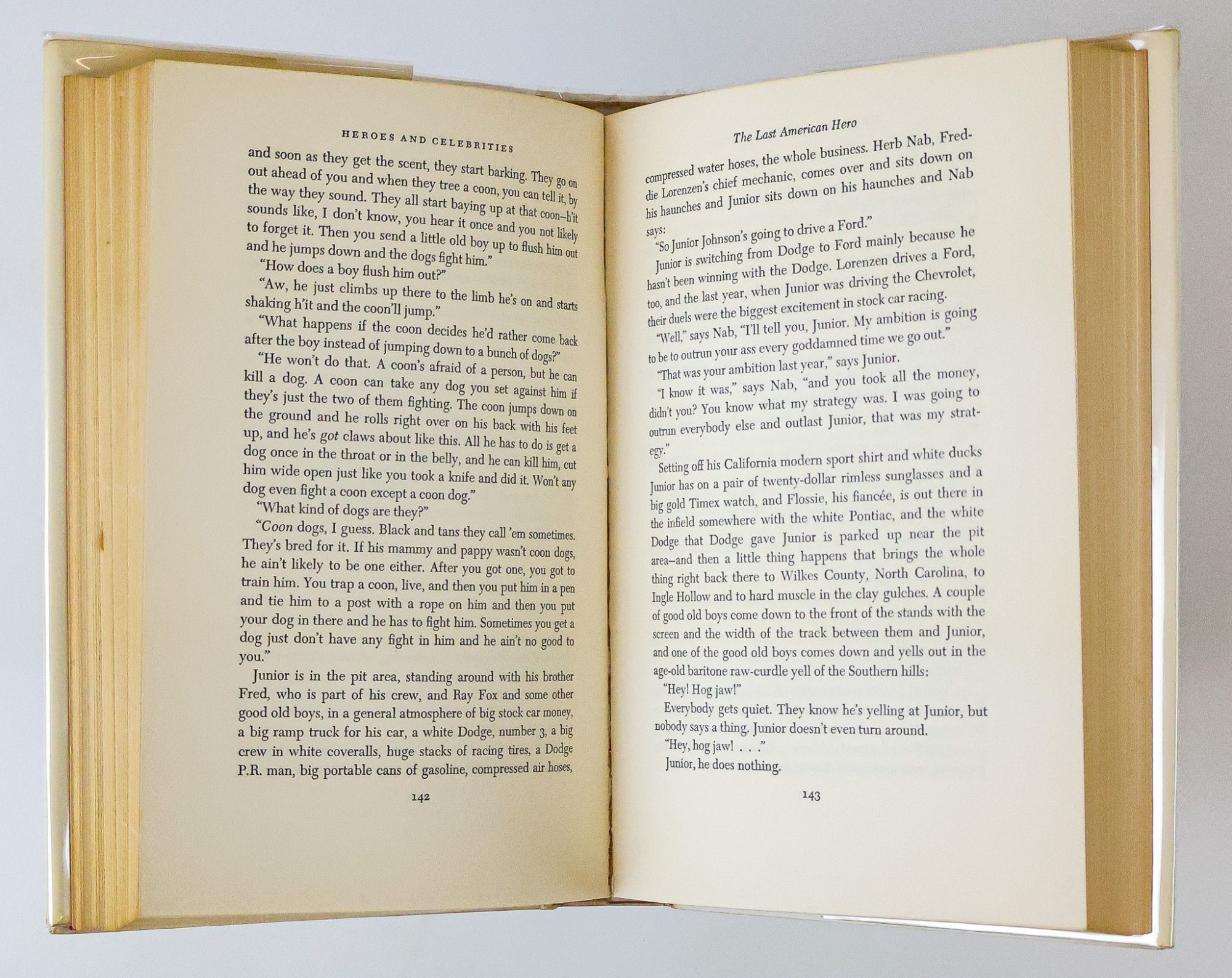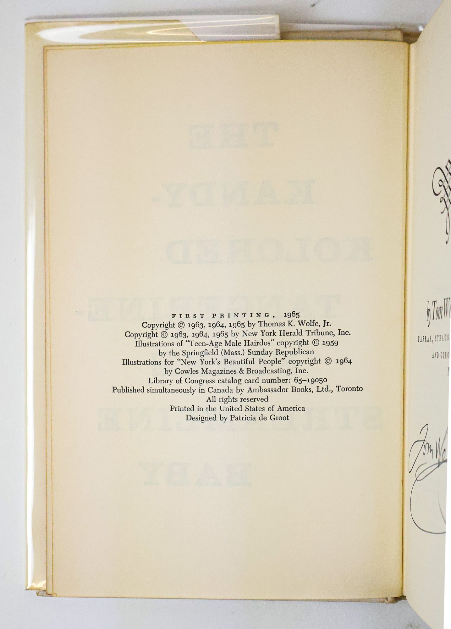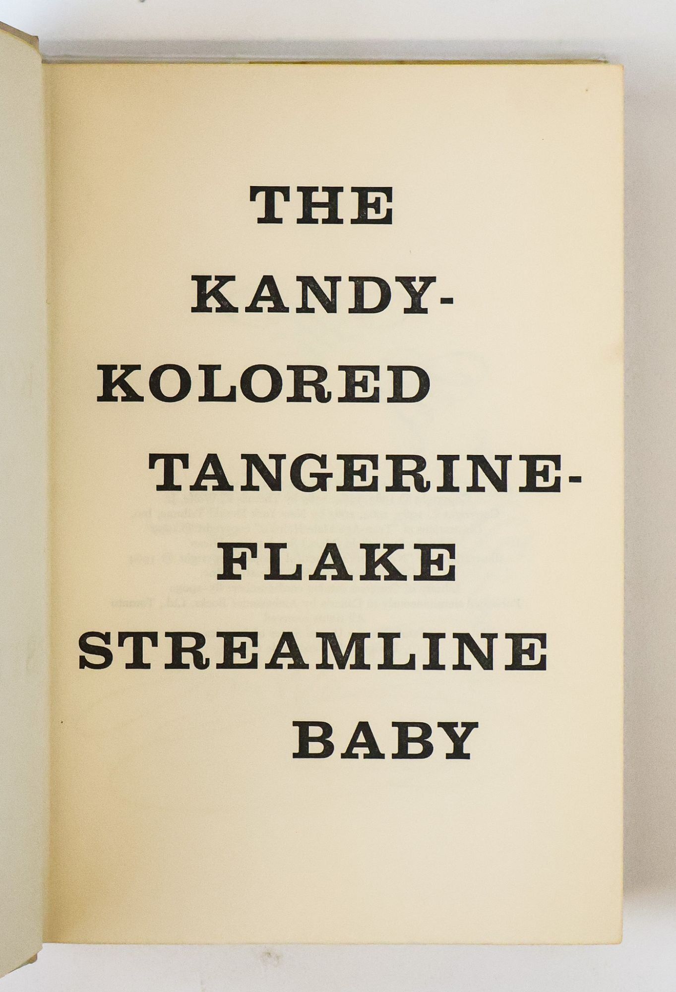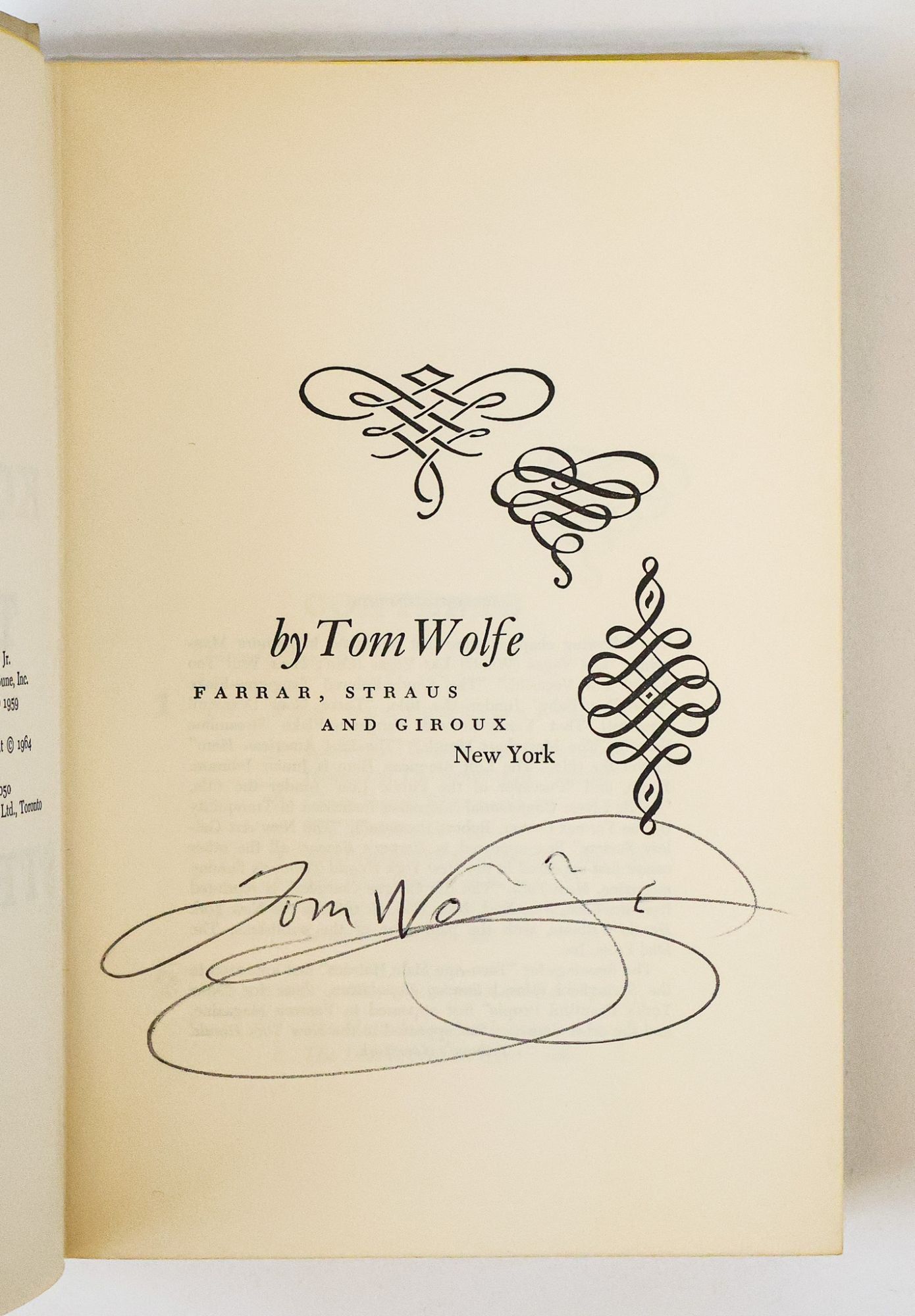 New York, NY: Farrar, Straus and Giroux, 1965. First Edition, First Printing. Hardcover. Octavo, xvii, 339 pages. In Very Good minus condition with a Very Good condition dust jacket. Black spine with white, pink, and yellow lettering. Dust jacket is wrapped in a mylar covering, price clipped, has general shelving wear. Boards are slightly cocked, has age toning along the head/tail edges, stains and soiling along the head edges, and bending wear along the spine head/tail. Textblock has a sticker and pen marks on the front end-page, splitting along the gutter between pages 142-143, stains on pages 148, and 150-152, and minor age toning and stains along the edges. Signed flat by Tom Wolfe on the publisher's page. 1395024. Special Collections.