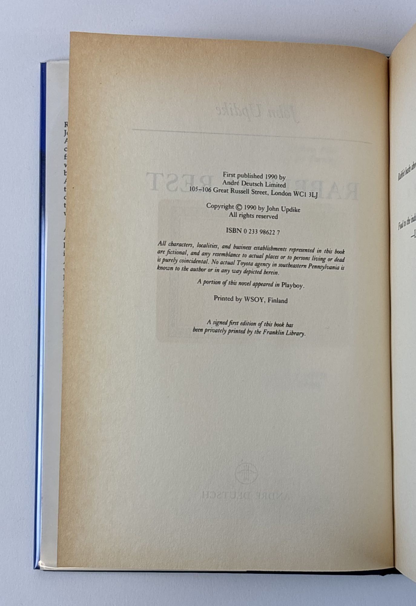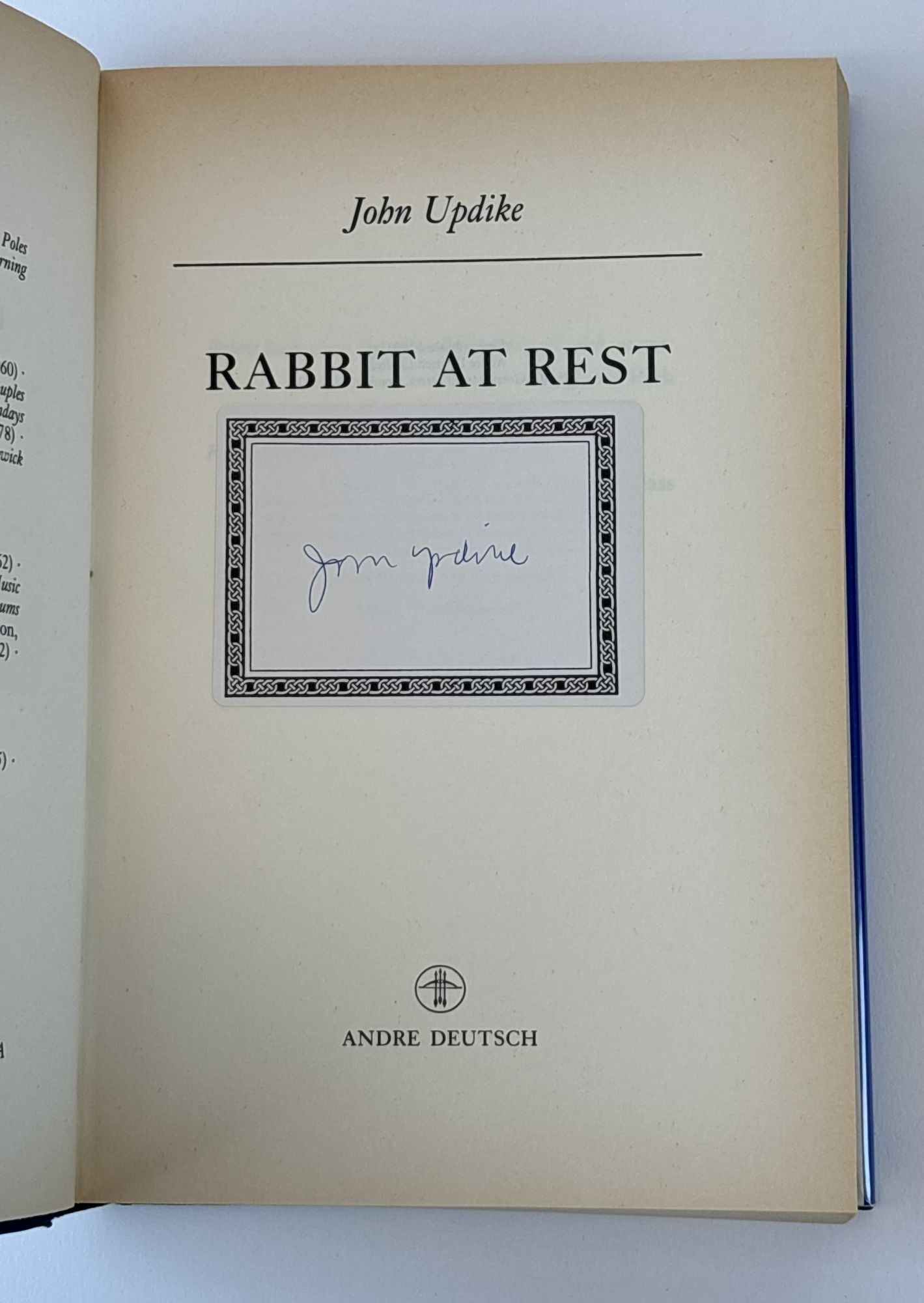 London, UK: Andre Deutsch, 1990. First Edition, First Printing. Hardcover. Octavo, 505 pages. In Very Good condition with Very Good condition dust jacket. Spine is blue with silver and white lettering. Dust jacket protected by mylar covering, price uncut: "£14.99" on front flap, and has mild shelving wear along extremities. Boards have mild shelving wear along extremities. Text block moderately age-toned along head edge, mildly age toned throughout, and has mild dust burning along tail and fore edges. Signed flat by John Updike on a bookplate adhesively affixed to title page. Shelved in hallway. 1394825. Special Collections.