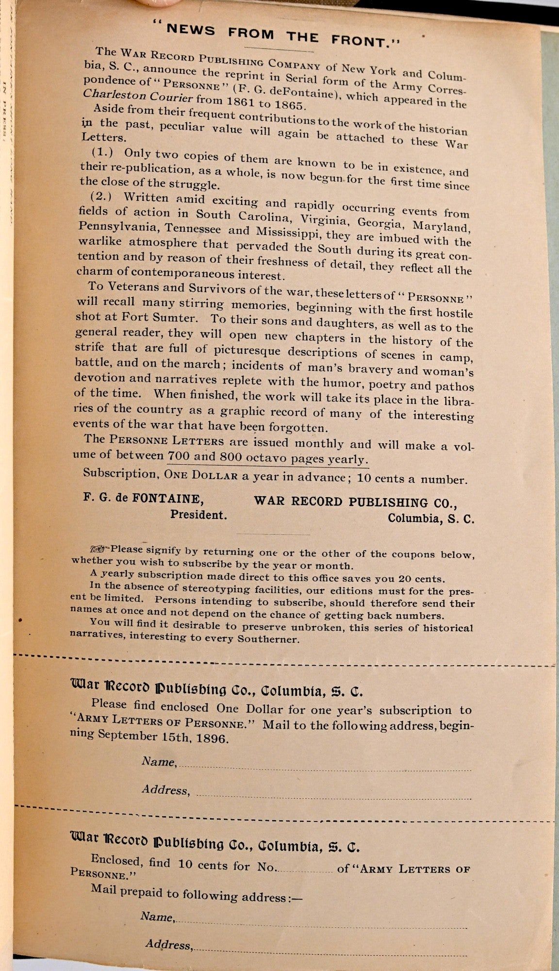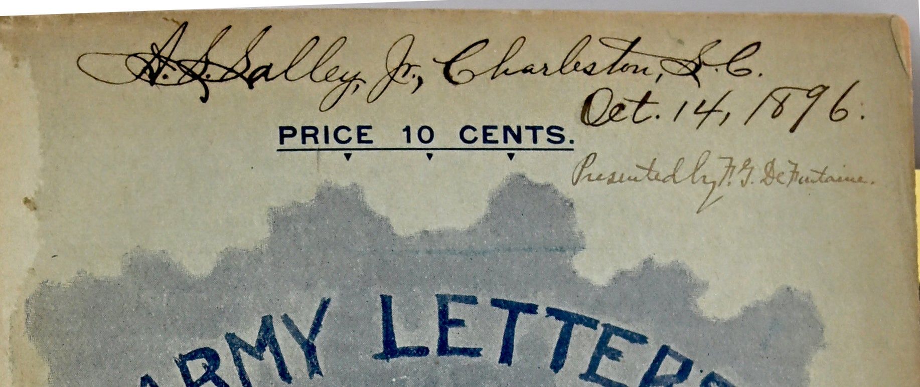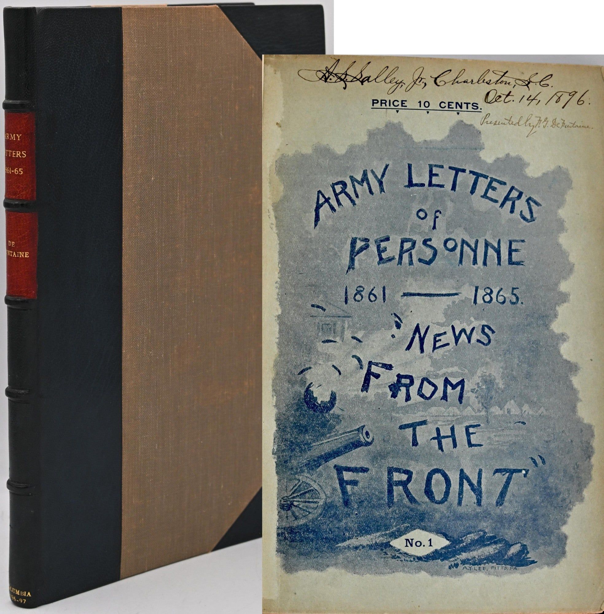 Columbia, S. C.: War Record Publishing Company, 1896. First Edition. Three Quarters Leather. Very Good binding. Signed. 8vo.; in three quarter blue morocco over taupe cloth; two issues bound in with both wrappers present; 51 pages followed by [7] ads; [59, 60], 61-113; the boards are a bit bowed; this copy bound by Sangorski & Sutcliffe, and signed by the firm on the bottom of the pastedown; they added that the binding was done for Charles R Sanders, Jr; Mr. Sanders was a noted bibliophile and Civil War collector.~~Signed by A. S.[Alexander Samuel} Salley who was an historian of South Carolina and archivist with Historical Commission of South Carolina. The signature is on the front cover of Number 1, and underneath is tipped in “Presented by F. G. De Fontaine”. There is also a TLS from the author to Mr. Salley soliciting his help in obtaining subscribers to his Letters periodical in Charleston. It appears that the two issues bound here are the only two printed. Tipped in as well is a blank order form for the book.~~The two issues are uncommon; a nice association both with A. S. Salley and collector Charles R. Sanders. Very Good binding.