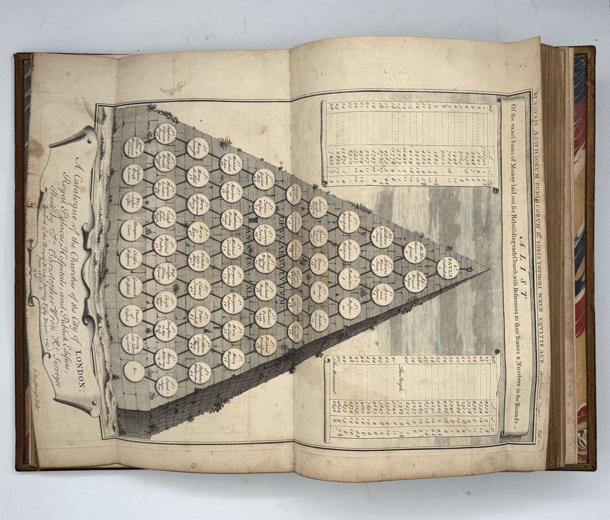 London: Printed for T. Osborn and R. Dodsley, 1750. First edition. Titled in red and black. Mezzotint portrait frontispiece, engraved dedication, 3 engraved portraits and 7 engraved plates. Engraved illustrations and engraved head and tail pieces. [4, including engraved dedication], xii, [4], 1-159, 181-368, [4]pp. Errors in pagination as issued. Extra-illustrated with an additional folding plate after page 308. Folio. Nineteenth century brown morocco, by Mackenzie, marbled endpapers, gilt edges, worn at extremities, restoration at joints and spine. Minor foxing. Provenance: Frances Mary Richardson Currer (armorial bookplate); Crewe Hall (armorial bookplate); General Theological Seminary (blindstamp, bookplate and other markings). First edition. Titled in red and black. Mezzotint portrait frontispiece, engraved dedication, 3 engraved portraits and 7 engraved plates. Engraved illustrations and engraved head and tail pieces. [4, including engraved dedication], xii, [4], 1-159, 181-368, [4]pp. Errors in pagination as issued. Extra-illustrated with an additional folding plate after page 308. Folio. Complete with the mezzotint portrait of Wren engraved by I. Faber (often missing) and extra illustrated with the "pyramid plate."