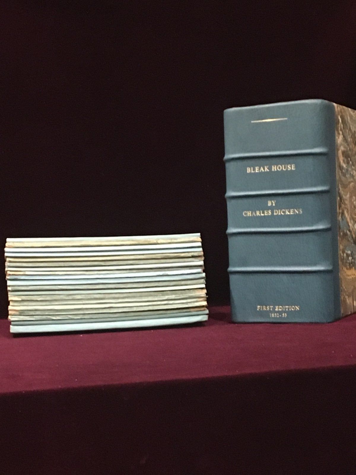 London (March 1852-September 1853): Bradbury and Evans. First Edition. H. K. Browne (Phiz). In the original monthly parts, 20 parts in 19, in the original green printed wrappers. ALL wrappers are correct. ALL the ads, slips and Advertisers called for by Hatton & Cleaver are present. FIRST ISSUE OF THE TEXT, uncorrected thus: in part I, page 19, line 6 with "elgble" - part VII, page 209, line 23 with "chair" - part IX, page 275, line 22 with "counsinship." ANNOTATED in part XVII, on the final page of text, as we have seen in other copies: "CNP" meaning "clean and perfect" and with the initials of bibliographer Thomas Hatton ("TH") on the same page. Additionally, laid into part XVII is an autograph note by Thomas Hatton, pertaining to this very part: "17 / Advertisers / Plates / Text" The text in part XVIII is UNOPENED, therefore unread. Please note that "The Village Pastor" a small booklet, present here, is often missing because it was removed to make use of the subscription form, which appears on the inside of rear wrapper. Several plates are tanned at edges, not affecting illustrations; all other plates are very good to fine. Tissue guards are in place. Several spines have been expertly renewed. Octavo [i-vii]viii-x[xi]xii-xiv[xv]xvi, [1]2-624. Subscribers name on front wrap of part XIX/XX and the rear wrapper has fore-edge repair. Housed in a handsome green quarter-leather slipcase, with chemise. Provenance: The Hatton & Cleaver Collection, The Heritage Bookshop, Charles Parkhurst Rare books, Inc. Hatton & Cleaver, pages 275-304.