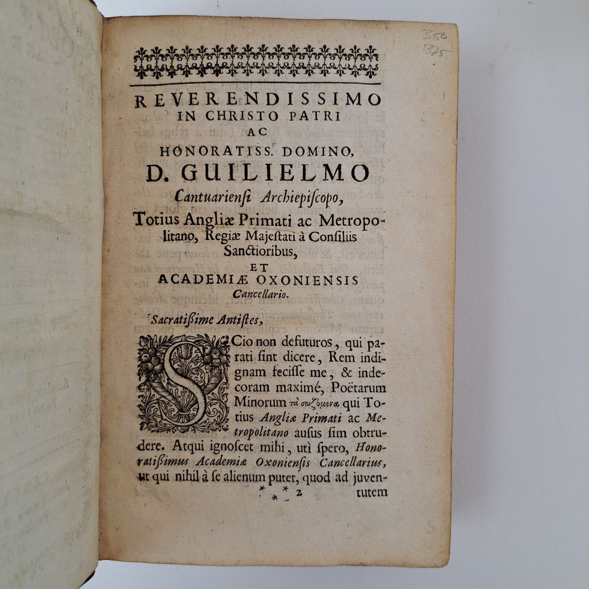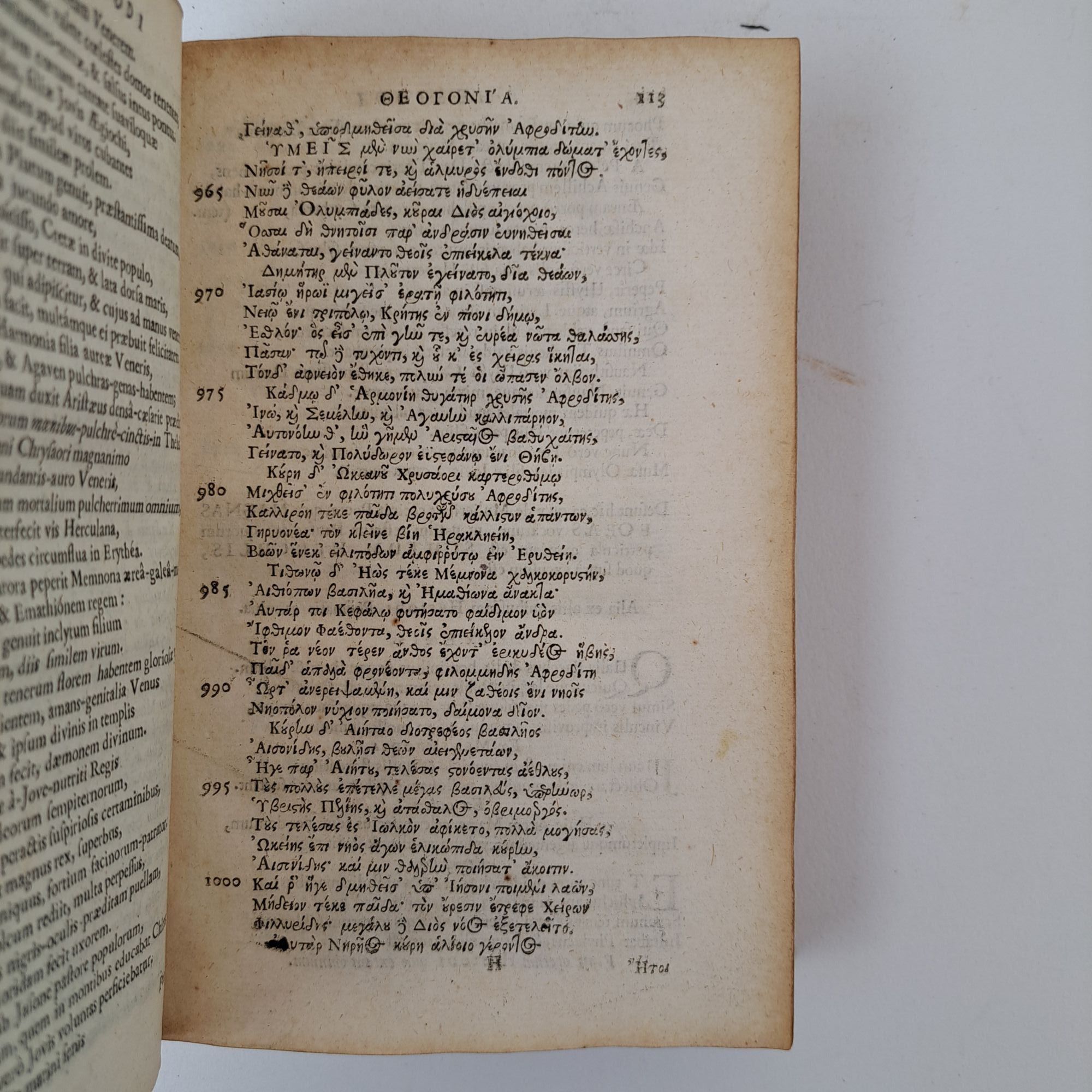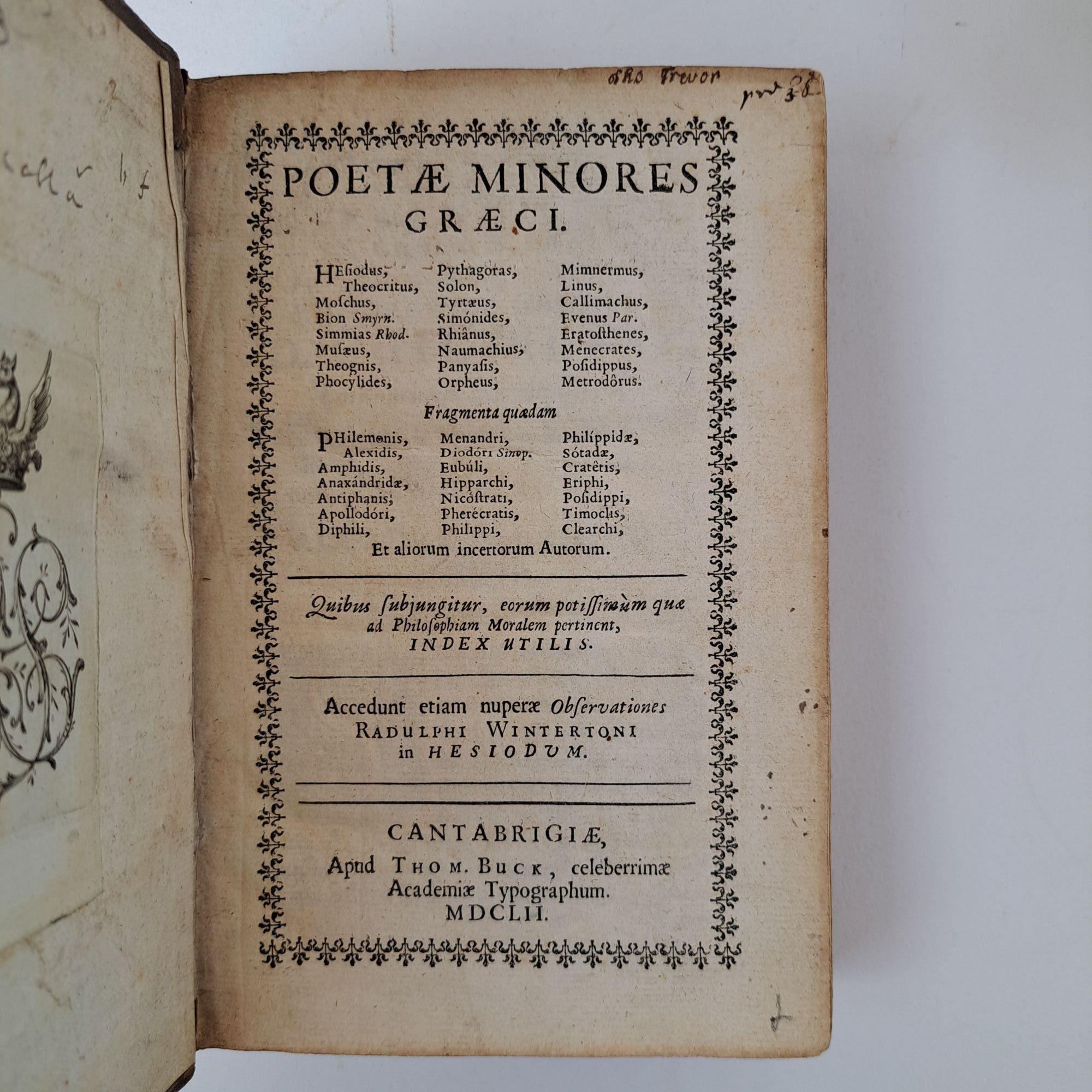 Cantabrigia [Cambridge]: Apud Thom. Buck [Thomas Buck], 1652. Second Cambridge Edition. Hardcover. Octavo, [8], 224, 227-533, [93] pages. In Good condition. Bound in full leather, has moderate cracking and chipping to spine, mild red rot along the spine, small gouge in the leather on the rear board, moderate rubbing wear and shelving wear. Textblock has a bookplate appearing to have initials "RCS" on the front pastedown, pen and pencil annotations on the front pastedown, splitting along hinges, lacking front free end paper and rear end pages, a small closed tear to top edge near the gutter of the 4th and 5th leaf. Textblock has scattered stains on some pages throughout, damp staining to fore edges of leaf mm7 to end of volume, and light age toning overall that is more visible along the edges. In Latin and Greek verse on facing pages. Shelved in Room A. Based on an edition prepared by Henri Estinne. 1395146. Special Collections.