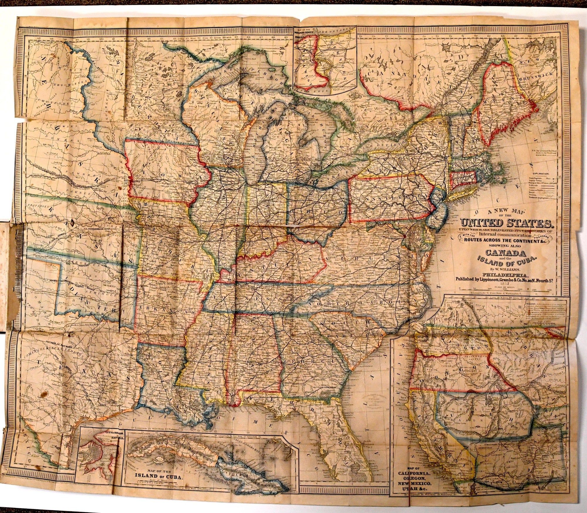 Philadelphia: J. B. Lippincott & Co, 1856. Hard Cover. Very Good binding. 18mo; blind-stamped cloth covers titled in gilt. With “A New Map of the United States Upon Which are Delineated its Vast Works of Internal Communication With the Proposed Routes Across the Continent &c. Showing Also Canada and the Island of Cuba”. (ii) iii-iv 5-246 pages including the Index.~~With insets of The City of Havana, Map of the Island of Cuba, and Map of California, Oregon, New Mexico, Utah &c. With some splits at the fold, and minor loss to edge where the map is attached. Very Good binding.