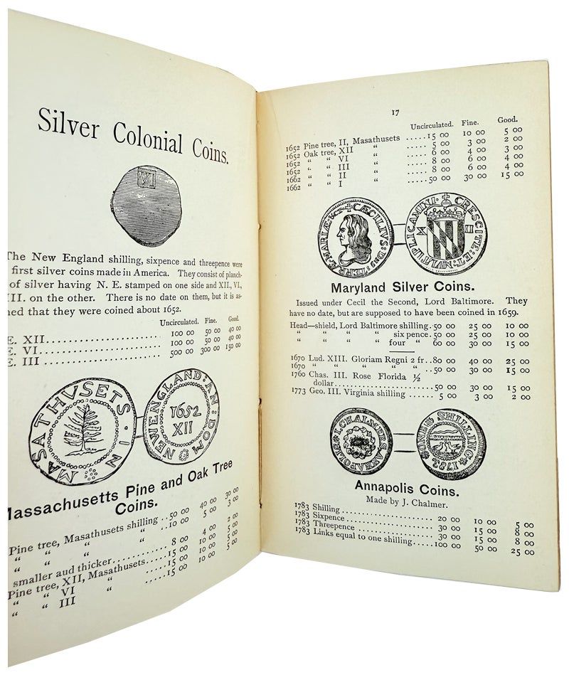 [n.p.]: William von Bergen, 1889. Very Good. [n.p.]: William von Bergen, 1889. First Edition. 12mo (16 cm); 106pp+4 memo. Illus. throughout. Boards full bound in maroon cloth with gilt stamping and blind decoration to front cover only. All edges gilt. Two-tone floral endsheets. Board extremities shelfworn with bumping and wear to corners and spine ends. Scuffing and minor soiling to boards with scratches to page edges. Previous owner pencil to front flyleaf on both sides, including a name, and brief pencil on a few pages. Purple rubber stamp to title page warns the reader that the amount each coin is quoted to be worth is based on large collections sold at public auction, and that any small collections or single coins will go for less when sold to coin dealers. OCLC has no previous editions stated and neither does the title page. OCLC notes the place of publication as Cambridge, MA.