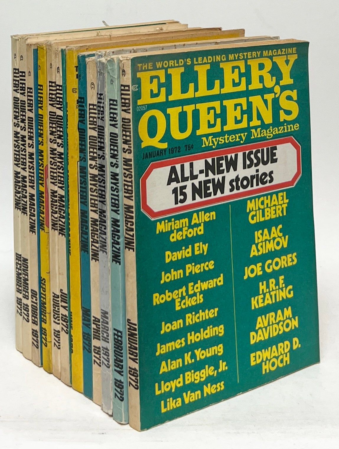 New York: Davis Publications Inc, 1972. First Edition. Paperback. Very Good. Twelve issues. Very Good. Wraps generally toned and rubbed, the most wear on the spine of the March issue. Square and firmly bound, clean internally. These issues feature writings from the likes of Isaac Asimov, Joe Gores, Michael Gilbert, John Christopher, Christianna Brand, Patricia Highsmith, Agatha Christie, Cornell Woolrich, among others.