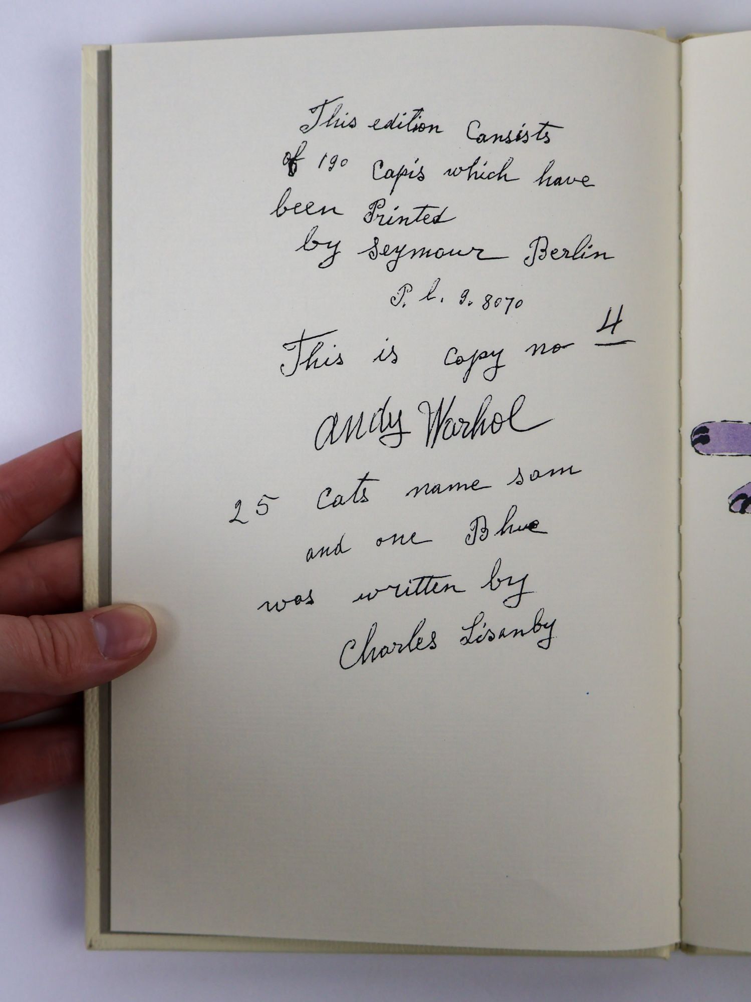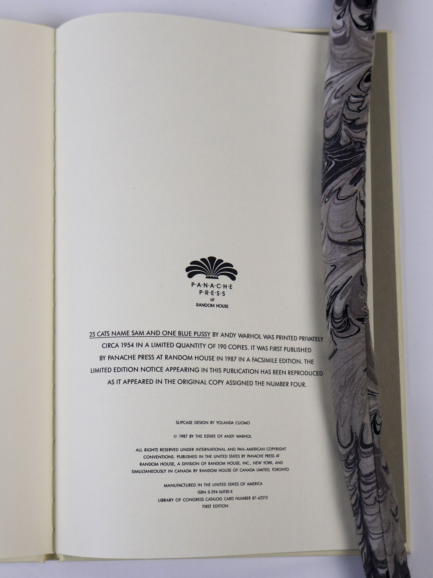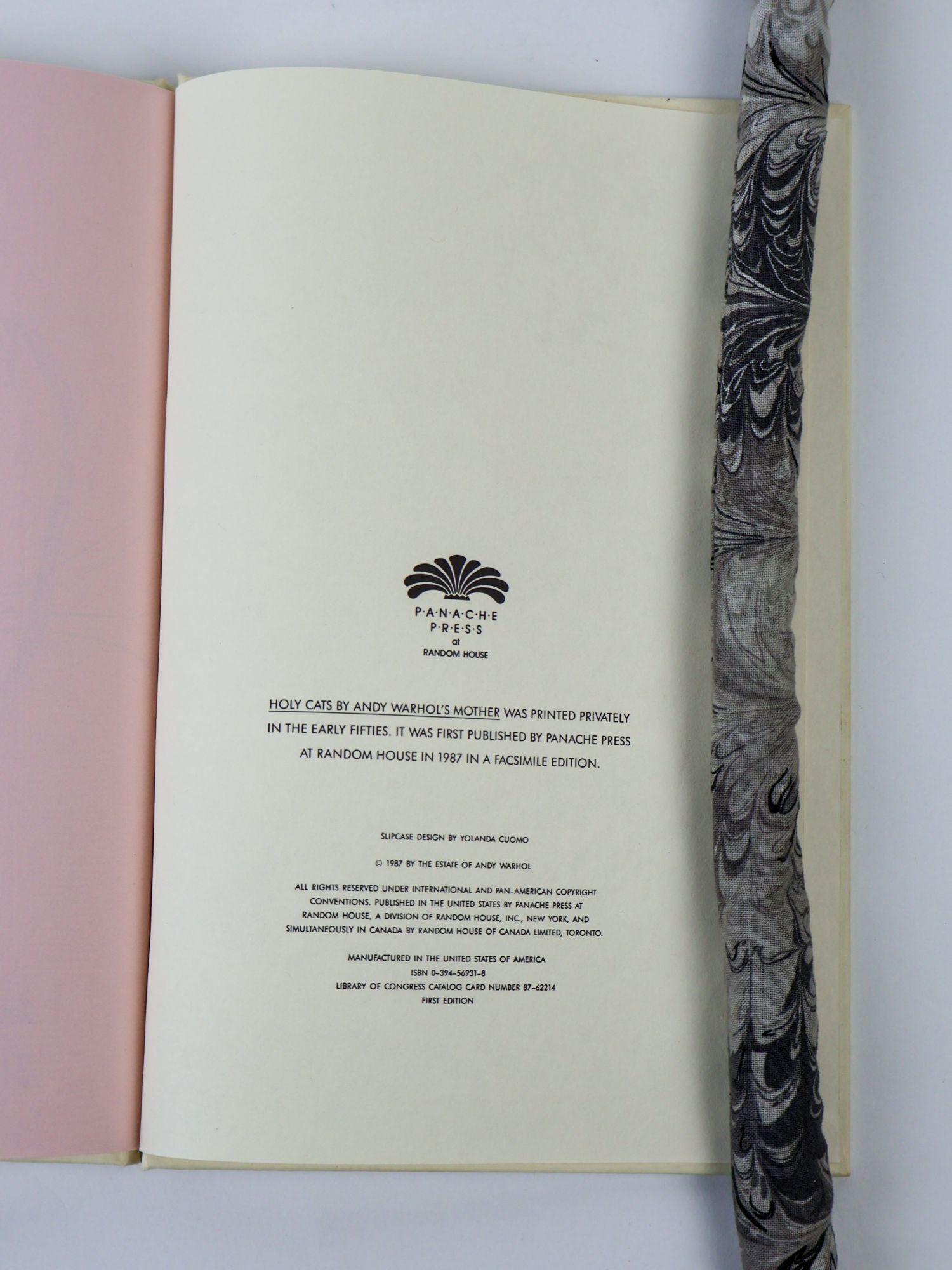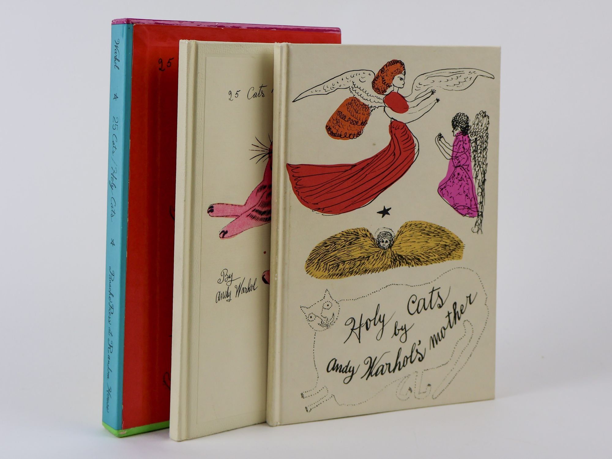 New York: Panache, 1987. First Edition Thus. Hardcover. Octavos. In Very Good condition with a Very Good slip case. Spines off-white, no lettering, in multi-color slip case. Mild general shelf wear and scuffing to each. Minor stain to front cover and mild soiling to spine of Holy Cats. Text blocks clean. Minor pen mark to rear of copyright page of 25 Cats. Mild wear to slip case. Shelved Case 11. Facsimile first editions of privately printed originals from the early 1950s. 25 Cats Name Sam and One Blue Pussy facsimile of copy #4 of 190. 1395247. Shelved Dupont Bookstore.