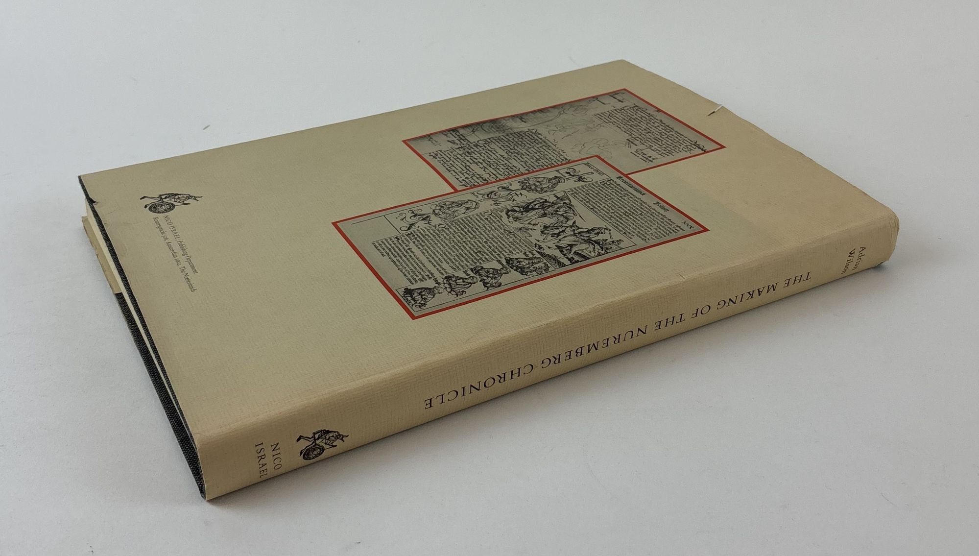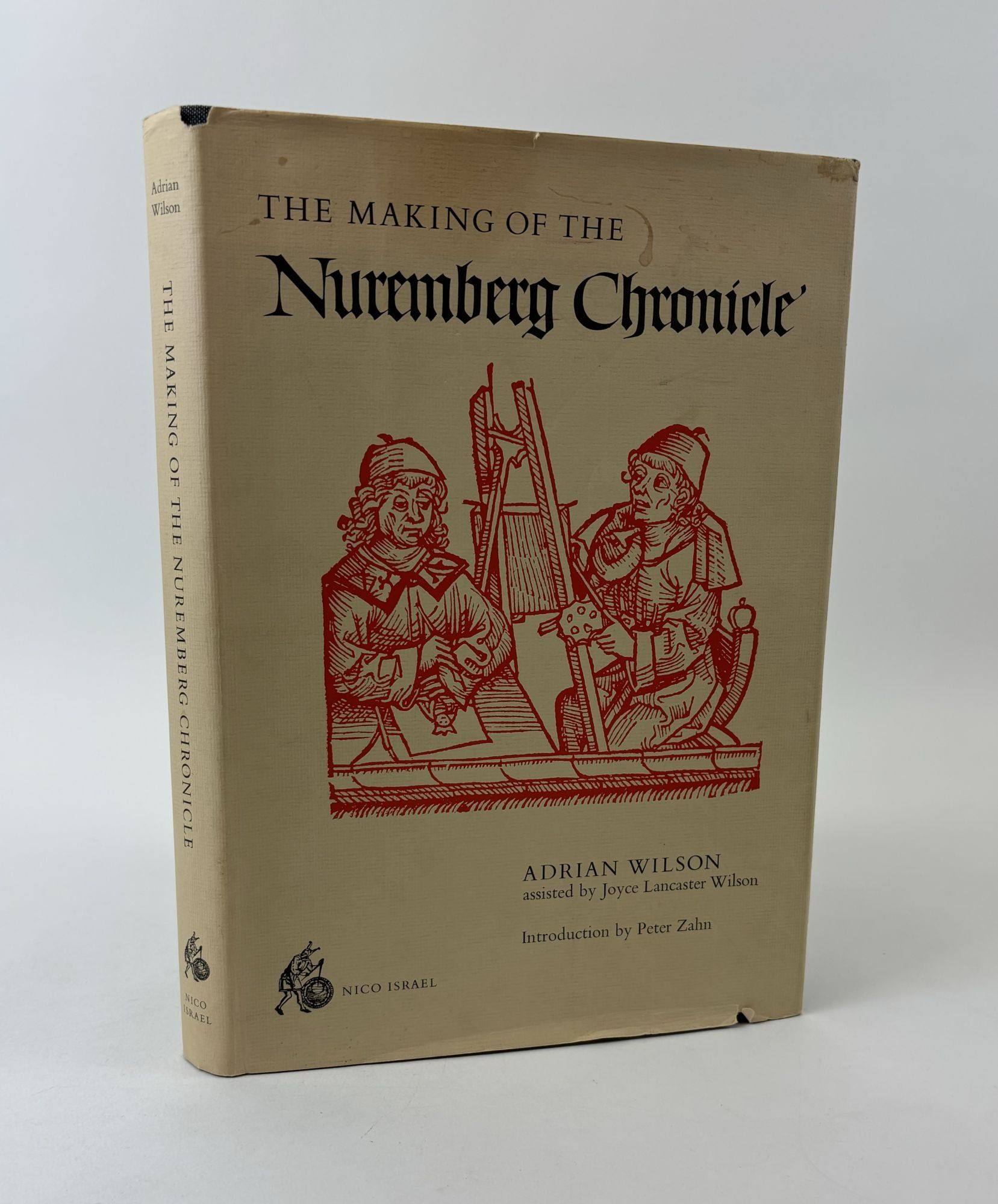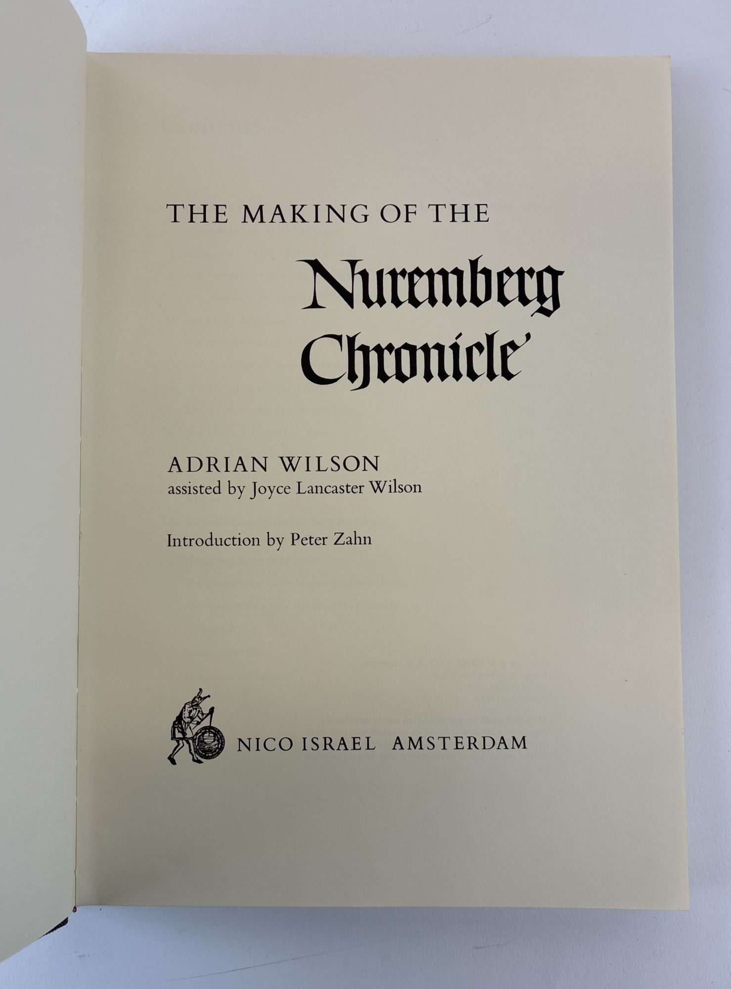 Amsterdam, Netherlands: NICO ISRAEL, 1978. First Edition, Second Printing. Hardcover. Tall quarto, 255 pages. In Very Good condition with Very Good minus condition dust jacket. Spine is beige with black lettering. Dust jacket has mild soiling and staining along head of front cover, an open chip along the front head joint, small tears along tail edges and corners, and a 1 in. closed tear along the rear head edge. Boards fully bound in charcoal cloth with mild shelving wear along spine head. Mild bending wear along tail fore corner of front free endpaper. Contains a letter from Adrian Wilson [Author] to William Gardiner, signed in his hand, bound with adhesive to the front free endpaper verso. Between the front endpapers are two letters of correspondence between Wilson and Gardiner: a carbon copy of Gardiner's letter to Wilson and Wilson's reply, written entirely in his hand. Shelved in Rm. A. The Nuremberg Chronicle (also known as the "Liber Chronicarum") "is, after the Gutenberg Bible, probably the most celebrated of early printed books. It is a compendium of history, geography and the wonders of the world as viewed from medieval Nuremberg, with some 1800 illustrations provided by the multiple use, for different subjects, of 645 beautiful woodblocks..." (n.b., quote from "The Nuremberg Chronicle Designs" by Adrian Wilson, printed for The Roxburghe Club of San Francisco and the Zamorano Club of Los Angeles, 1969).