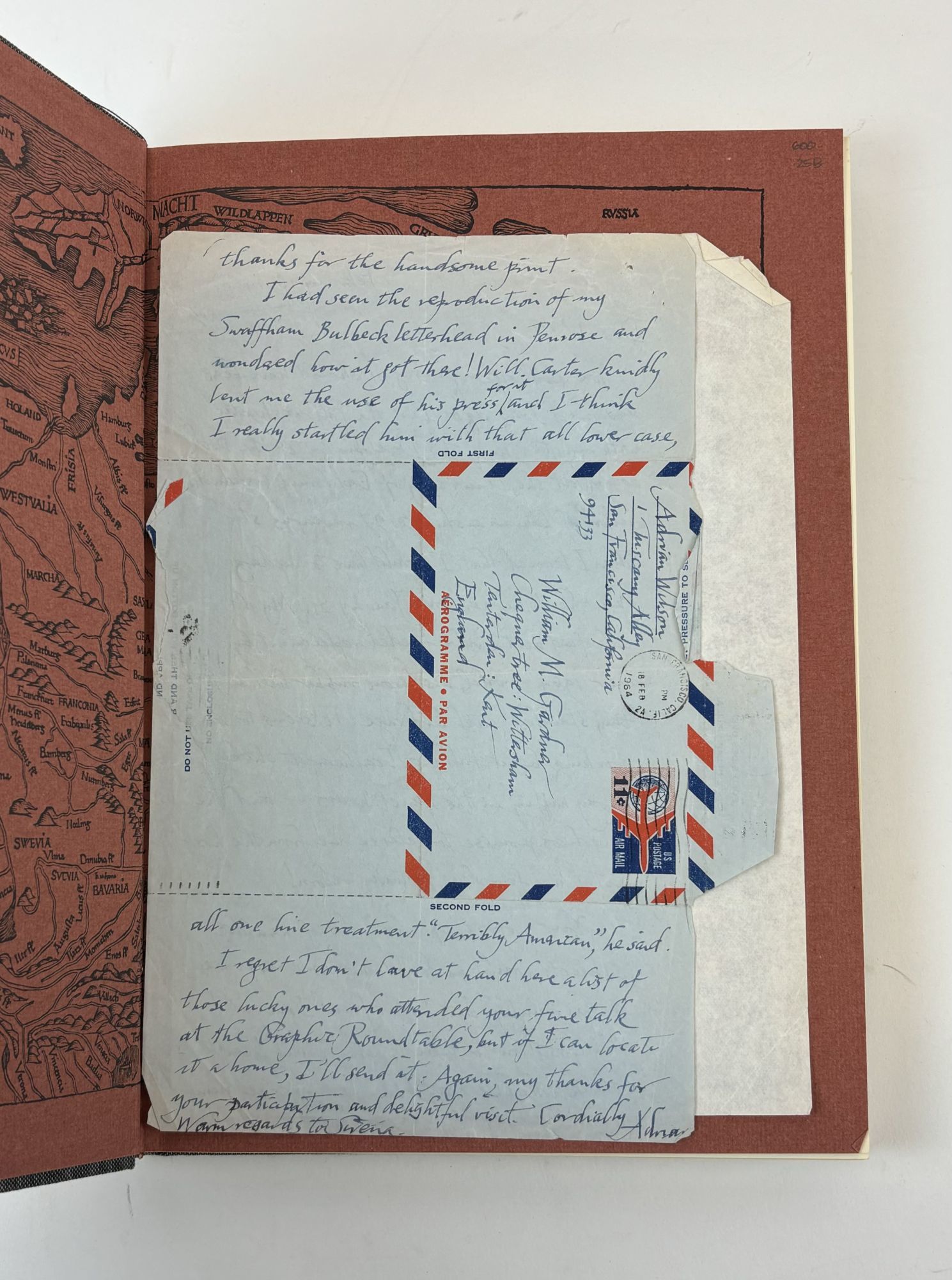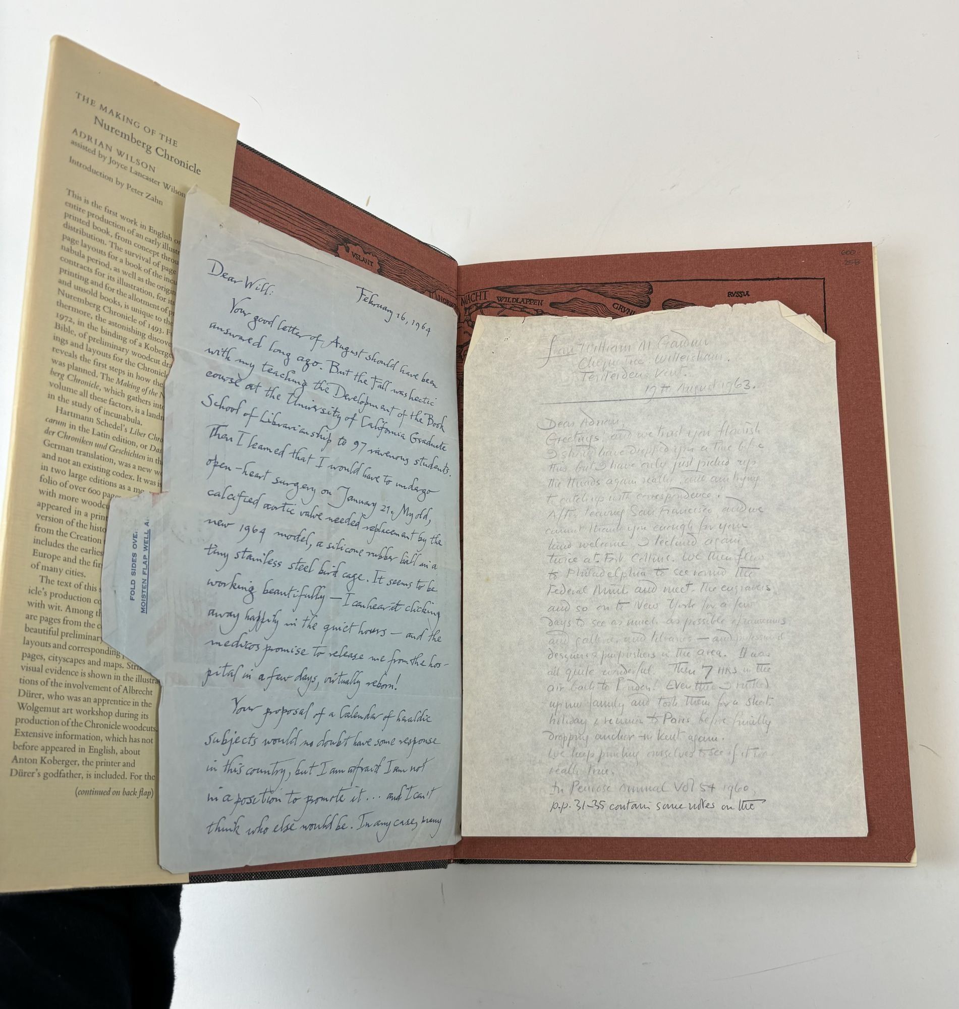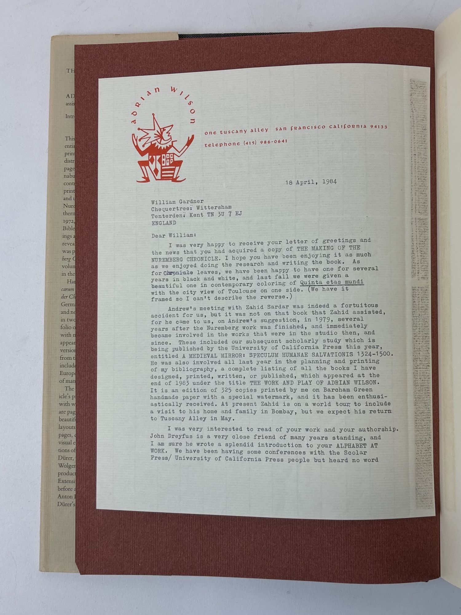Wilson became renowned for his printing and book design work at his San Francisco printing operation, The Press at Tuscany Valley, throughout the 1960s and 70s. In 1967, he released influential title in the genre of Books on Books, THE DESIGN OF BOOKS. Book making perforated the entirety of Wilson's life. With the help and interest of his wife, Joyce Lancaster Wilson, Wilson invested his attention in studying the entire production process of THE NUREMBERG CHRONICLE, the first known book to include a rudimentary map of Europe, a plethora of woodcuts, and a history of the world beginning at creation. The book that came out of it, Wilson's THE MAKING OF THE NUREMBERG CHRONICLE, is an astute and thorough study on one of the earliest examples of exemplary book making. This particular copy includes correspondence between William Gardiner, an English author, and Adrian Wilson. 1395292. Special Collections.