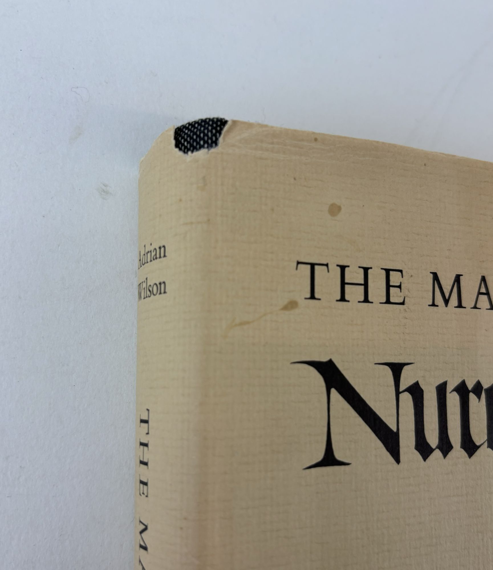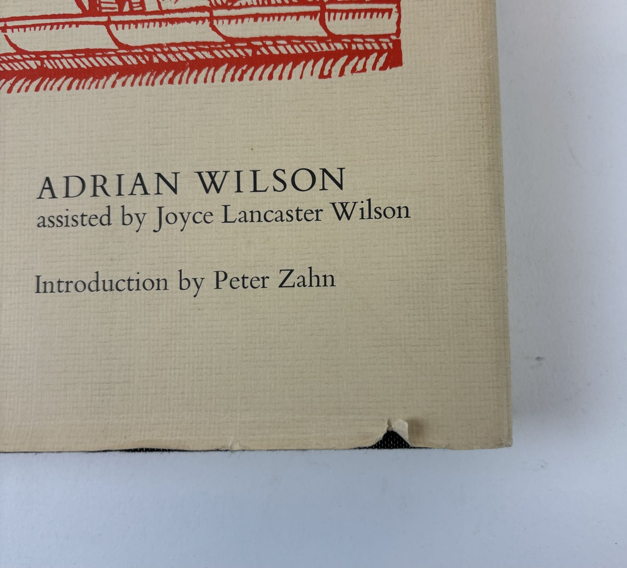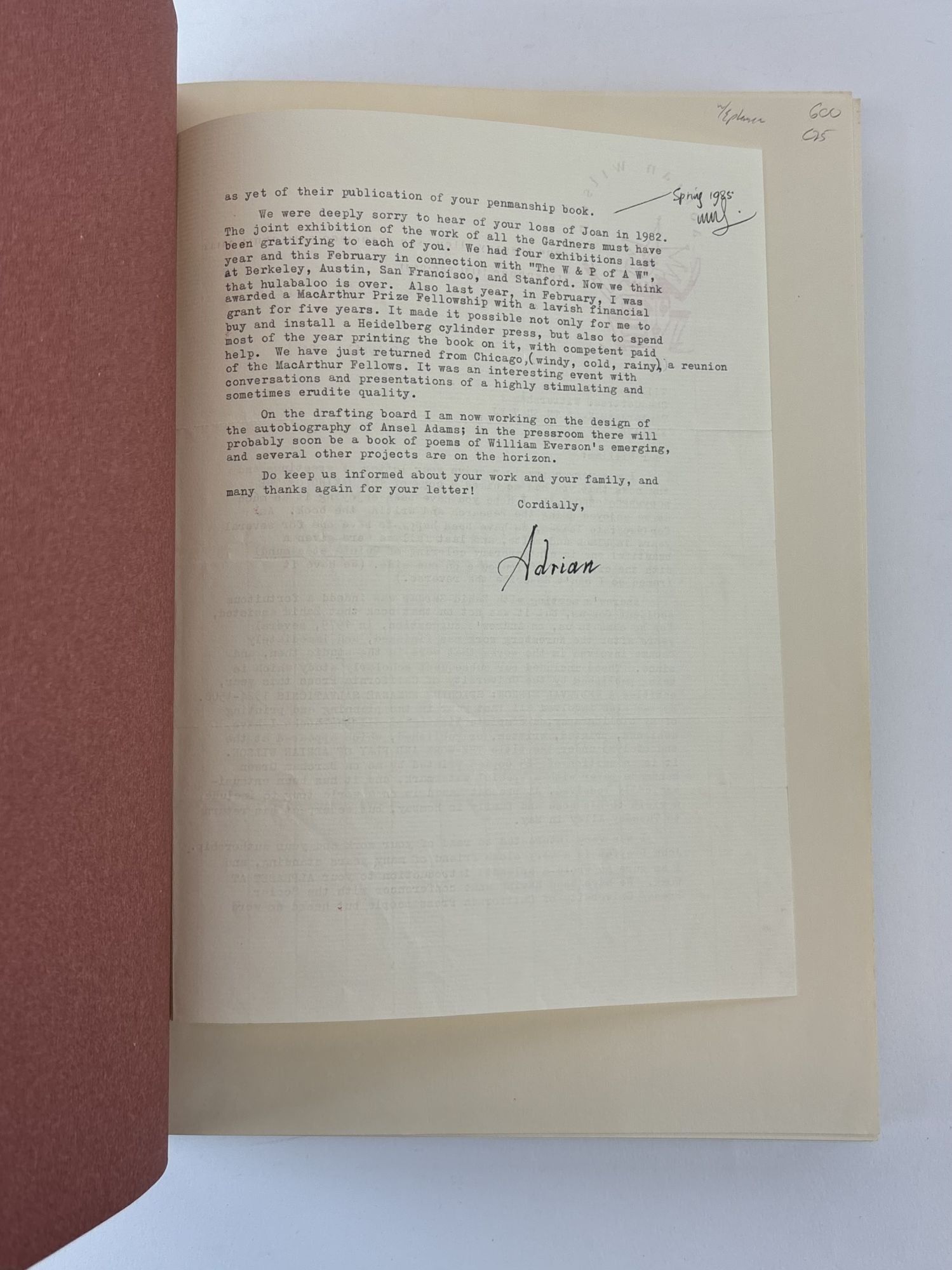 Wilson became renowned for his printing and book design work at his San Francisco printing operation, The Press at Tuscany Valley, throughout the 1960s and 70s. In 1967, he released influential title in the genre of Books on Books, THE DESIGN OF BOOKS. Book making perforated the entirety of Wilson's life. With the help and interest of his wife, Joyce Lancaster Wilson, Wilson invested his attention in studying the entire production process of THE NUREMBERG CHRONICLE, the first known book to include a rudimentary map of Europe, a plethora of woodcuts, and a history of the world beginning at creation. The book that came out of it, Wilson's THE MAKING OF THE NUREMBERG CHRONICLE, is an astute and thorough study on one of the earliest examples of exemplary book making. This particular copy includes correspondence between William Gardiner, an English author, and Adrian Wilson. 1395292. Special Collections.