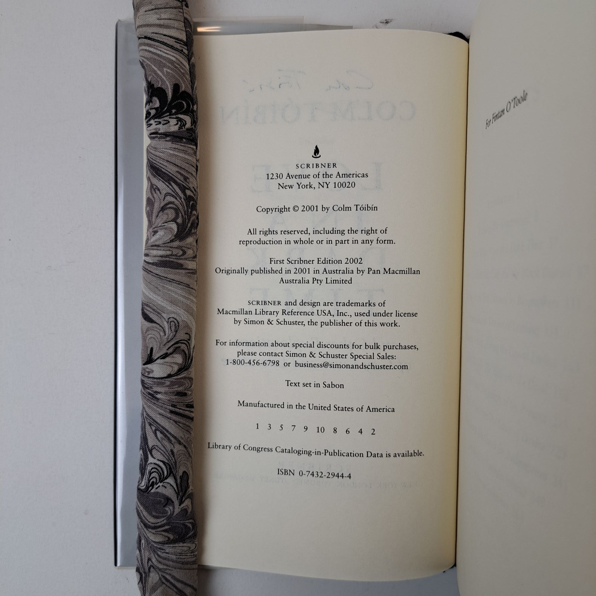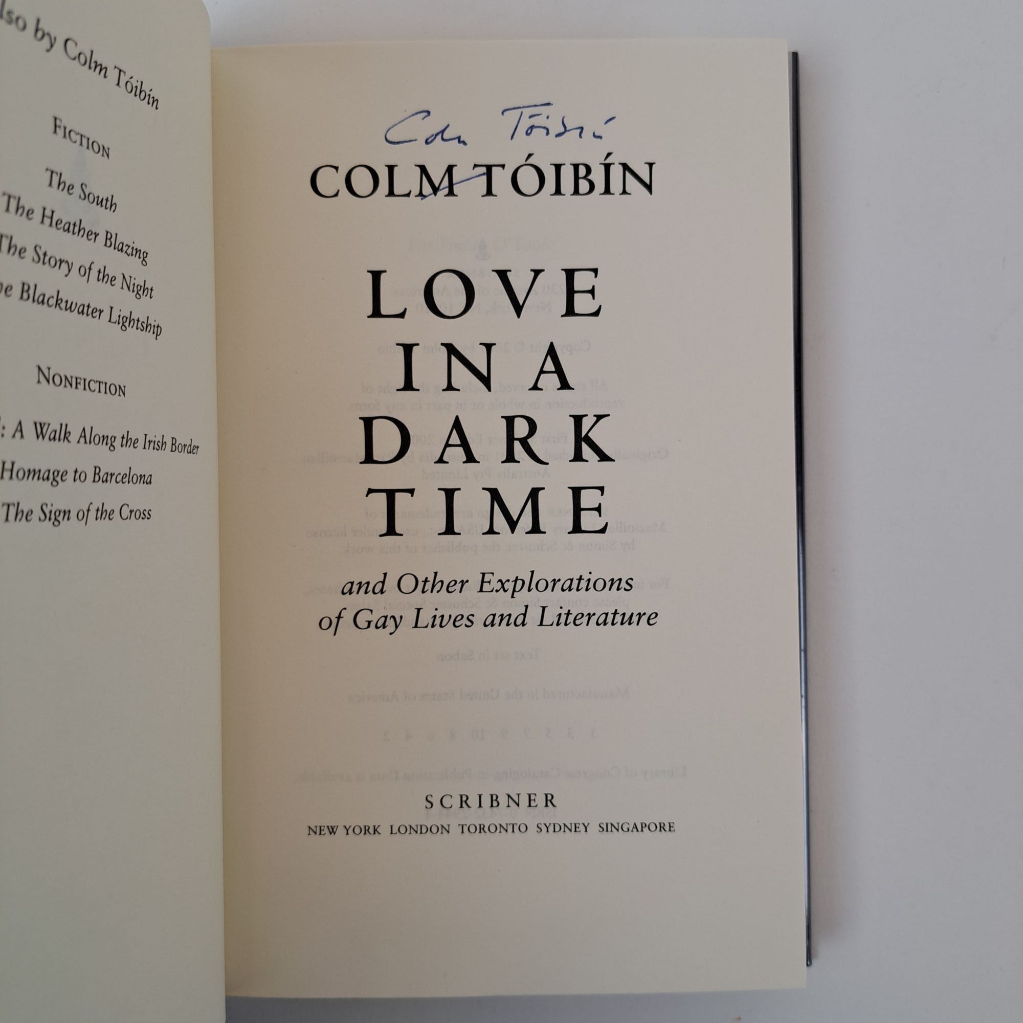 New York, NY: Scribner, 2002. First Scribner Edition, First Printing. Hardcover. Octavo, 259 pages. In Very Good minus condition with a Very Good condition dust jacket. Black spine with white lettering. Dust jacket is wrapped in a mylar covering, price uncut "$24.00", has mild shelving wear. Boards have light bumping along the front head fore corner, age toning along the head and tail edges and mild shelving wear. Textblock has light pink scuff marks on the head fore end of the front end-page, creasing on page 247, minor soiling on the rear end-page, and light stains along the edges. Signed flat by Colm Tóibin on the title page. Shelved in Room C. 1395311. Special Collections.