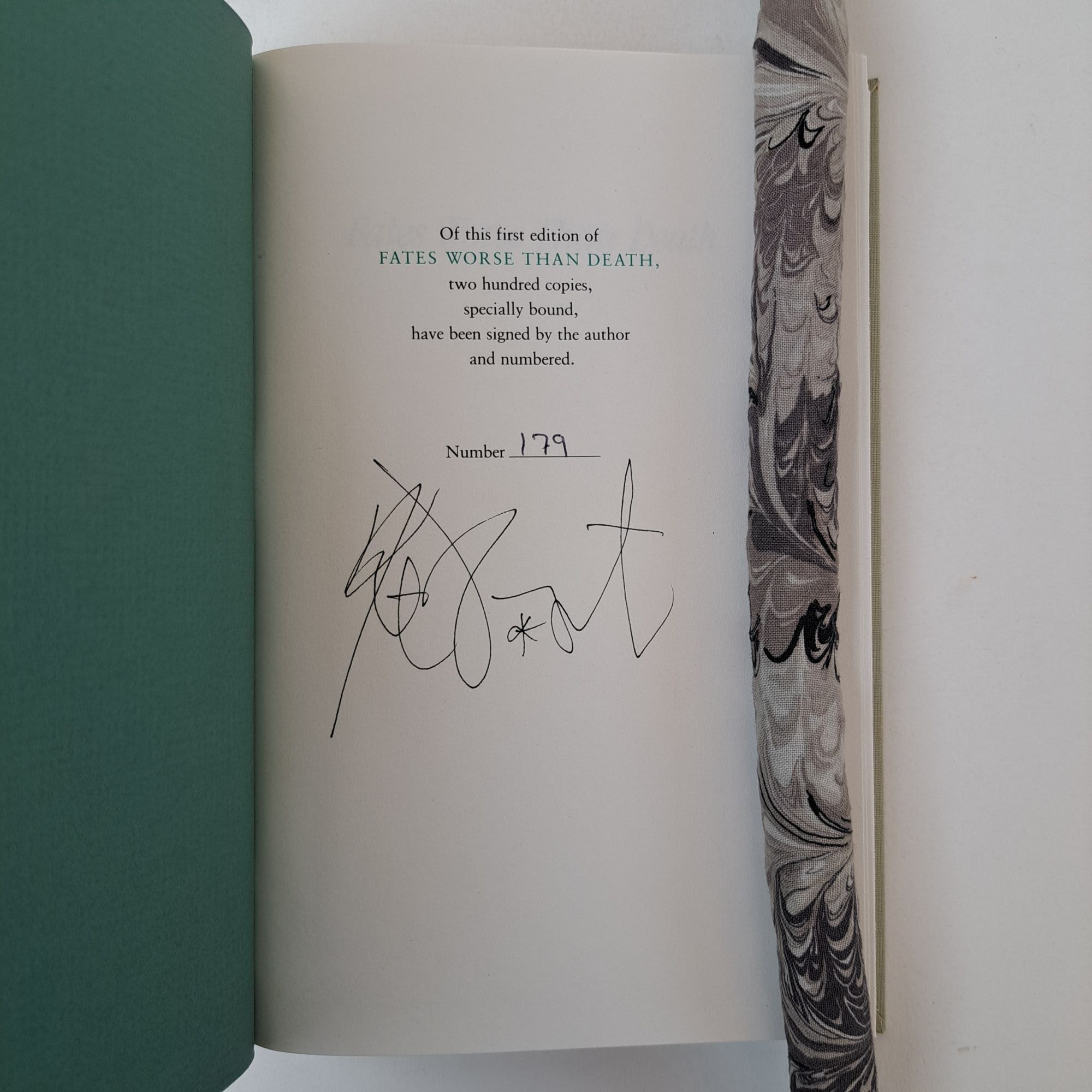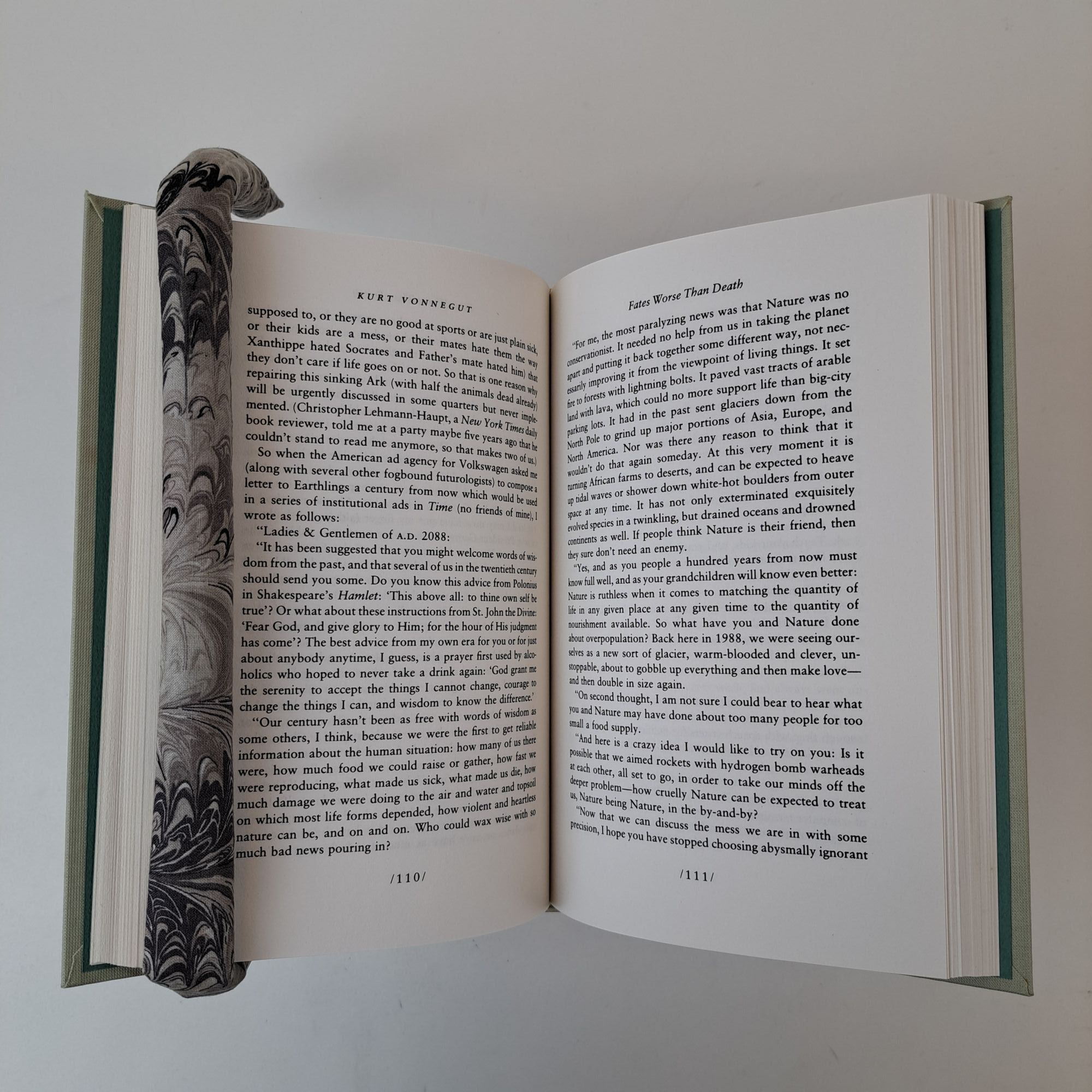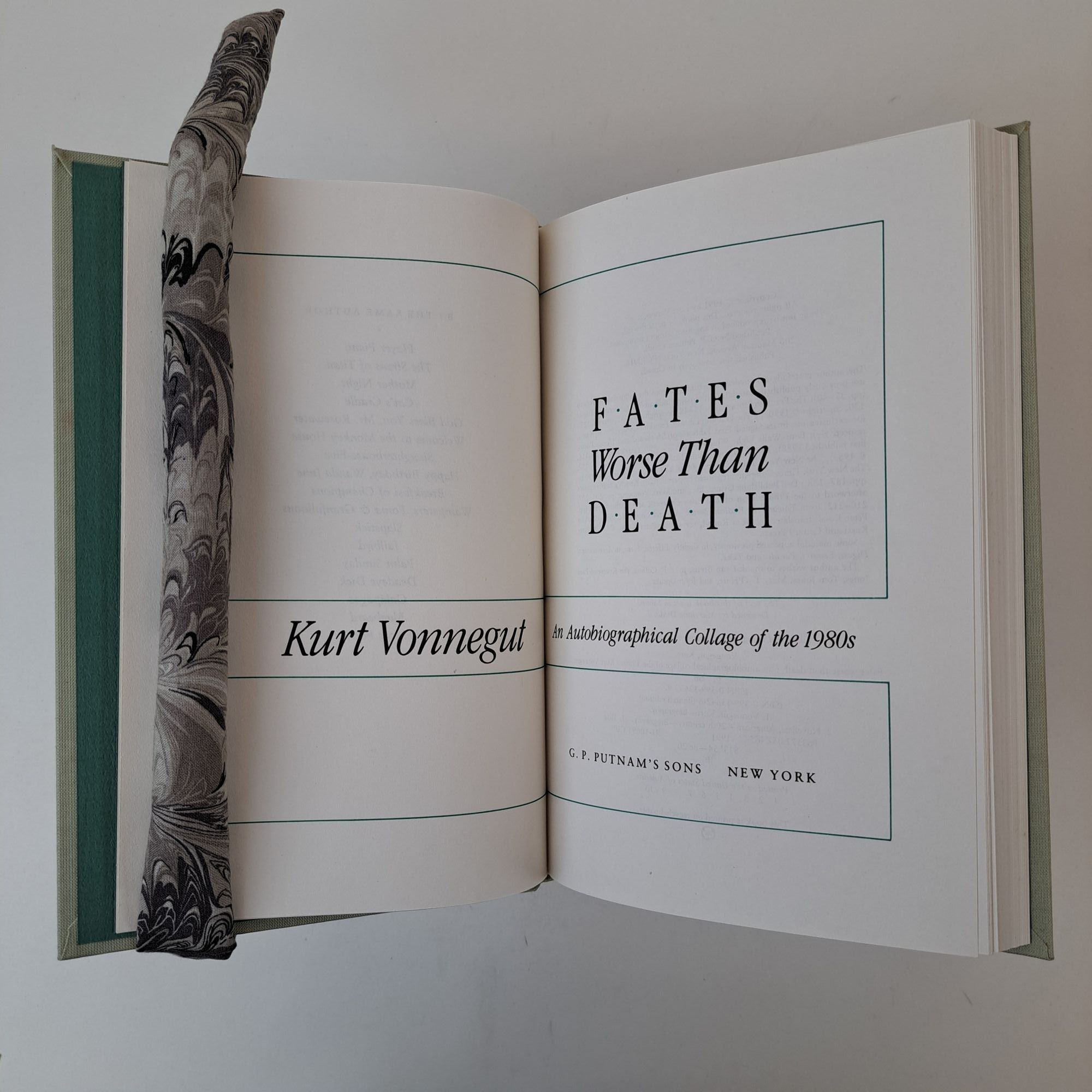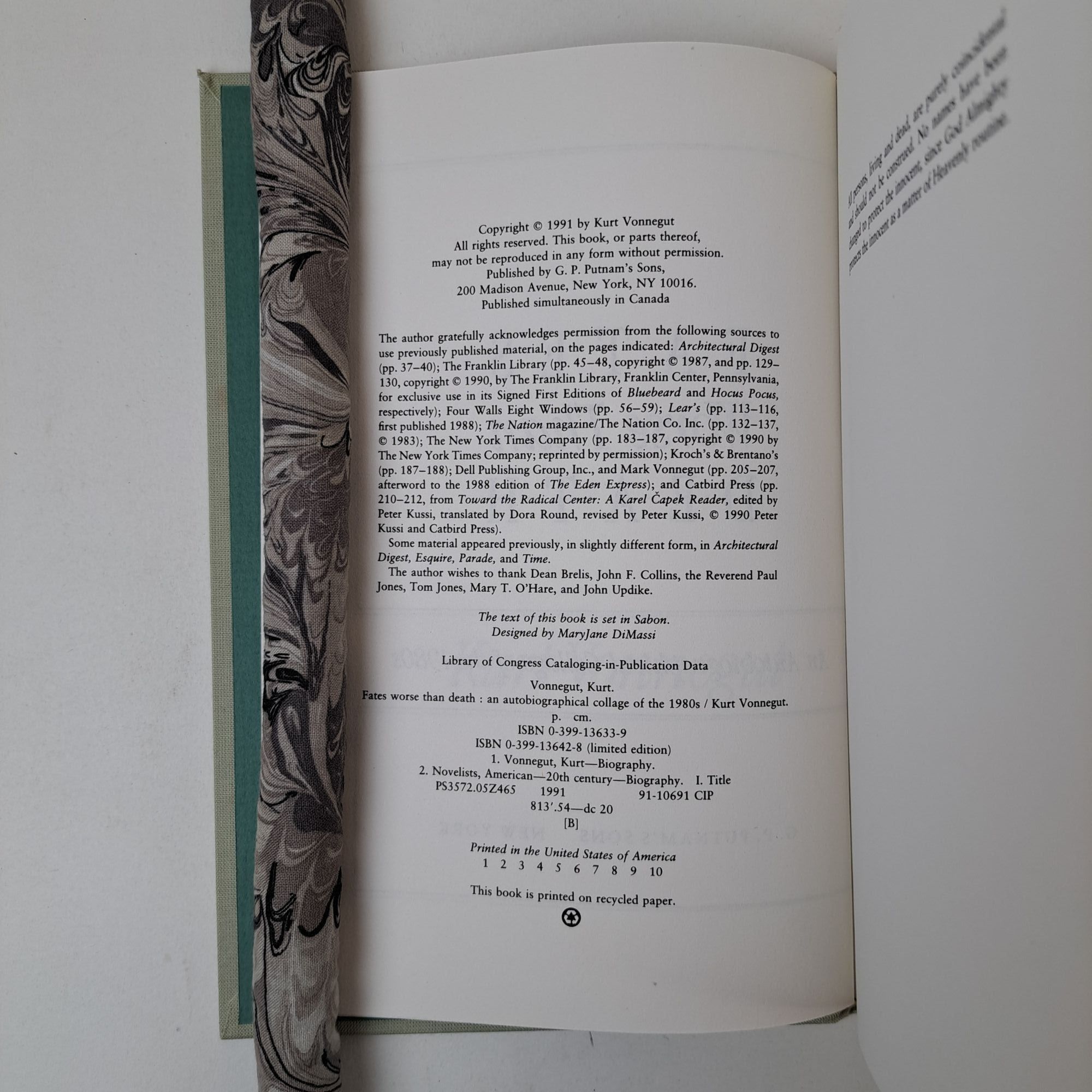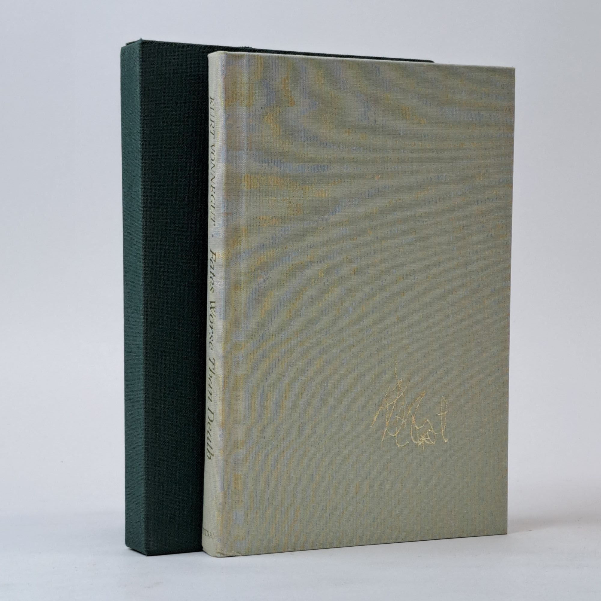 New York, NY: G. P. Putnam's Sons, 1991. Limited Edition, #179/200. Hardcover. Octavo, 240 pages. In Very Good minus condition with a Very Good condition slipcase. Light gray spine with gold lettering. Contained in a green cloth slipcase with minor scuff marks and shelving wear. Boards are slightly warped with minor shelving wear. Textblock has small stains on the fore and tail margins of page 100, and mild foxing along head edge. Signed flat by Kurt Vonnegut on the publisher's limitation page. DL consignment. Shelved in Room C. 1395388. Special Collections.