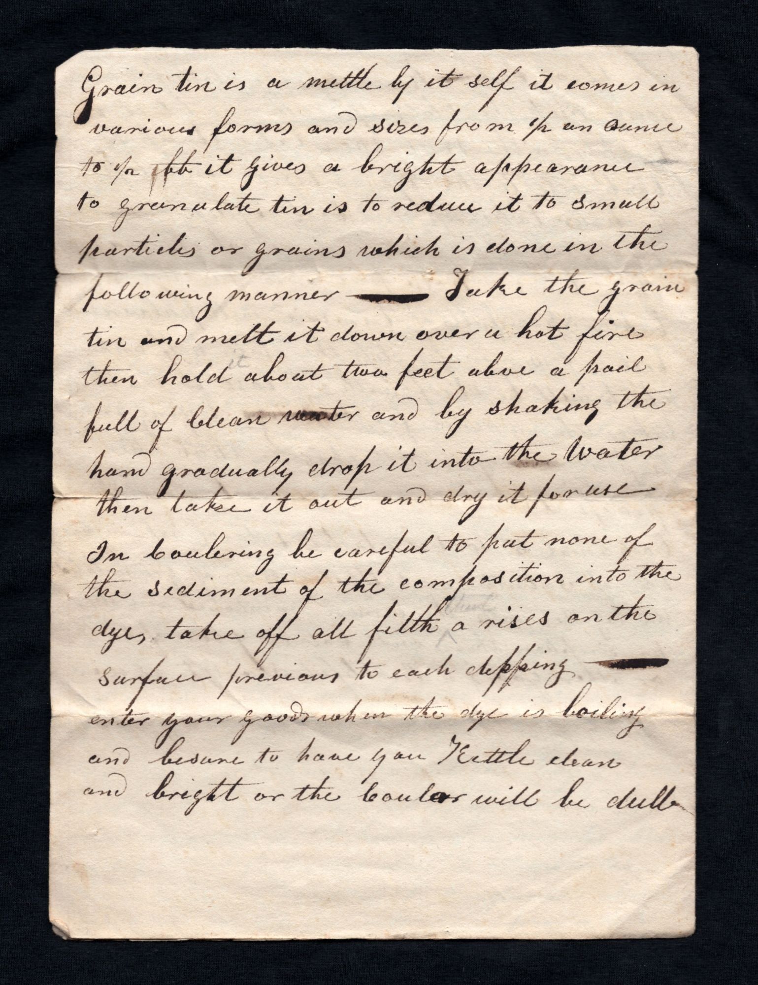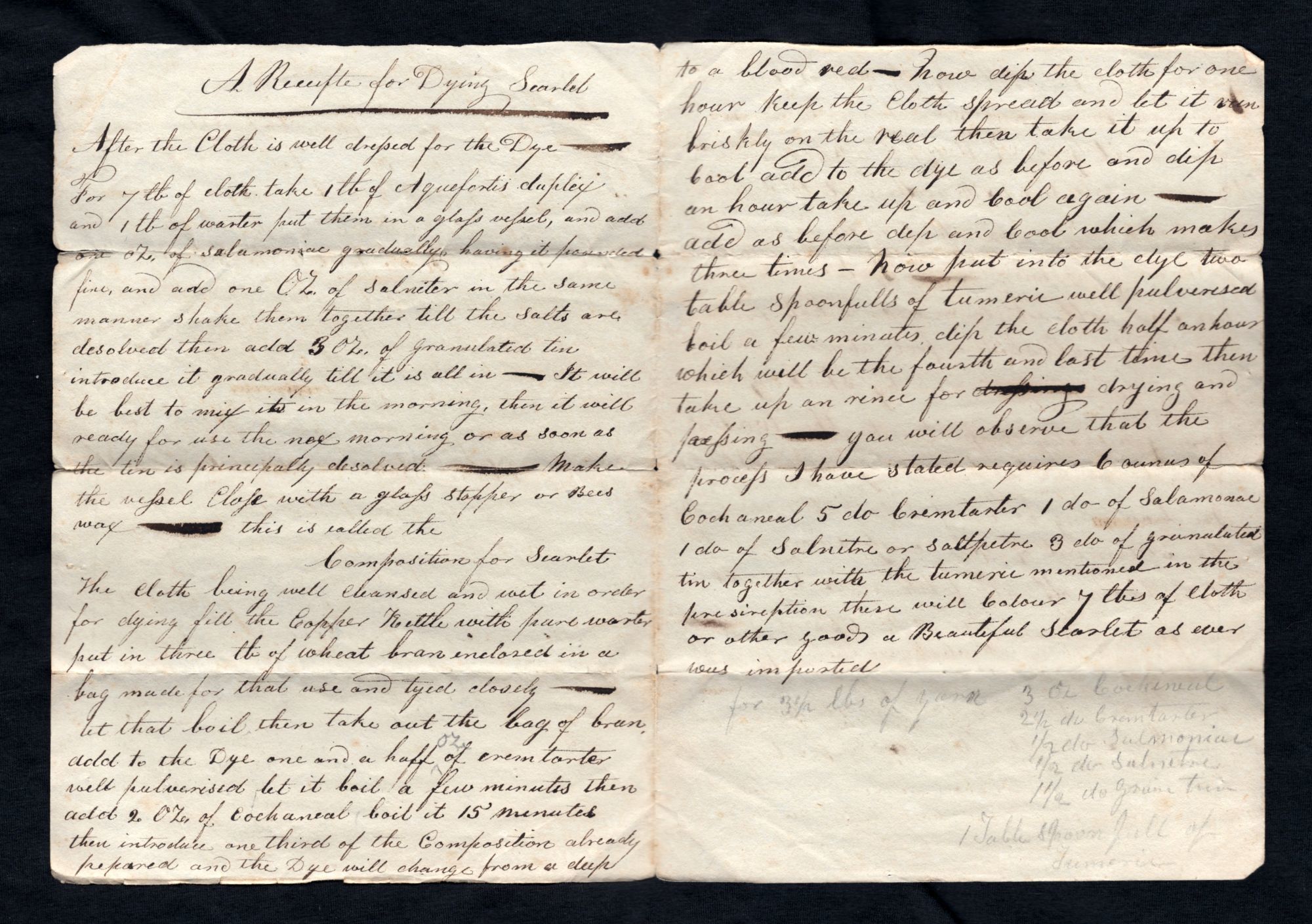 1800. Crease folds. Minor toning and soiling due to age.. A handwritten recipe for dyeing cloth scarlet. The unknown author refers to the instructions as a "receipte" which is a misspelling of the word 'receipt', which historically was used instead of the more relatively modern word of 'recipe'. Both words are derived from the Latin verb 'recipere' which means to 'receive or take'. The recipe provides detailed instructions on how to dye "7 lbs of cloth or other goods a beautiful scarlet as ever was imported". It uses a variety of traditional ingredients such as aqua fortis duplex, cochineal, and turmeric. While the majority of the recipe is written in pen, there is a addendum in pencil which provides an alteration in the recipe for dying yarn. Single fold page. Handwritten. Measures 8 3/4" x 6 1/4" (folded), 12 1/2" x 8 3/4" (unfolded).