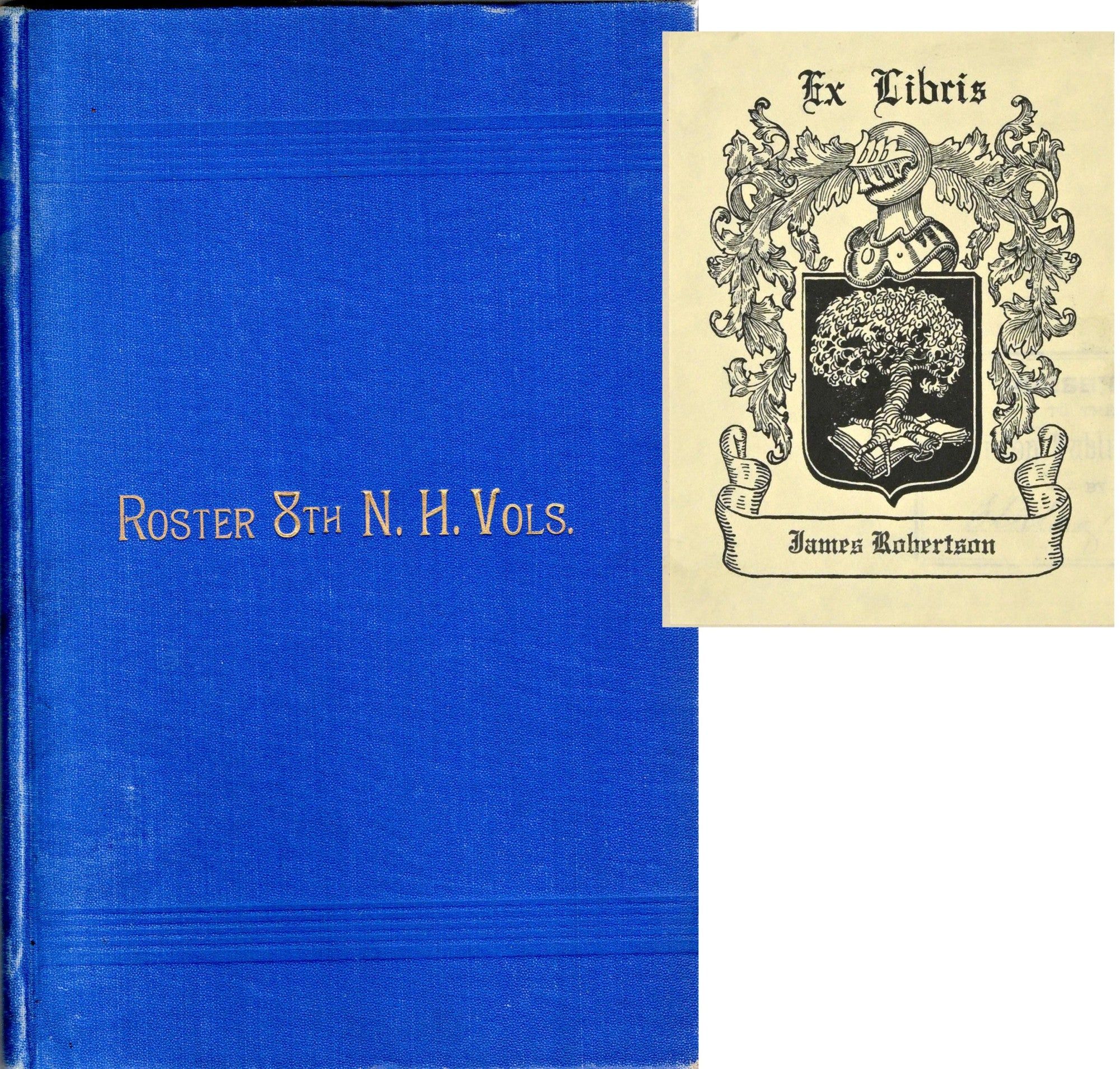 1895. Hard Cover. Very Good+ binding. Large 8vo.; in the publisher’s blue cloth binding, with titling in gilt; 106 pages; from the personal library of Bud Robertson, with his bookplate on the front pastedown; with the plate of the Wilton Library as well, dated 1895.~~A bright copy of this 106 pages roster, which lists abbreviated service records and concludes with a Statistical Summery of the service of the Eighth Regiment. Apparently reprinted from the” Revised Register of the Soldiers and Sailors of New Hampshire in the War of the Rebellion”, Concord, 1895. Very Good+ binding.