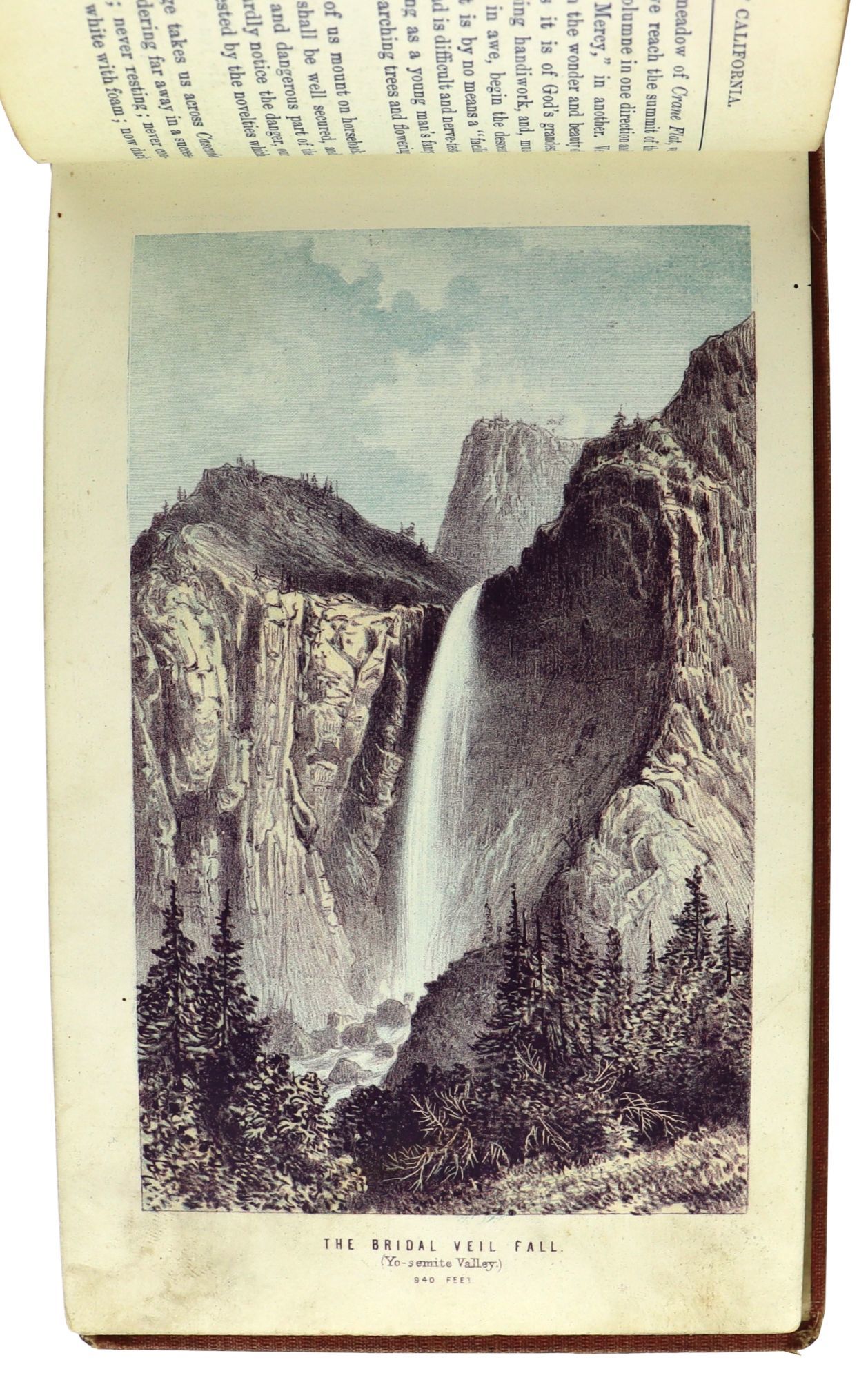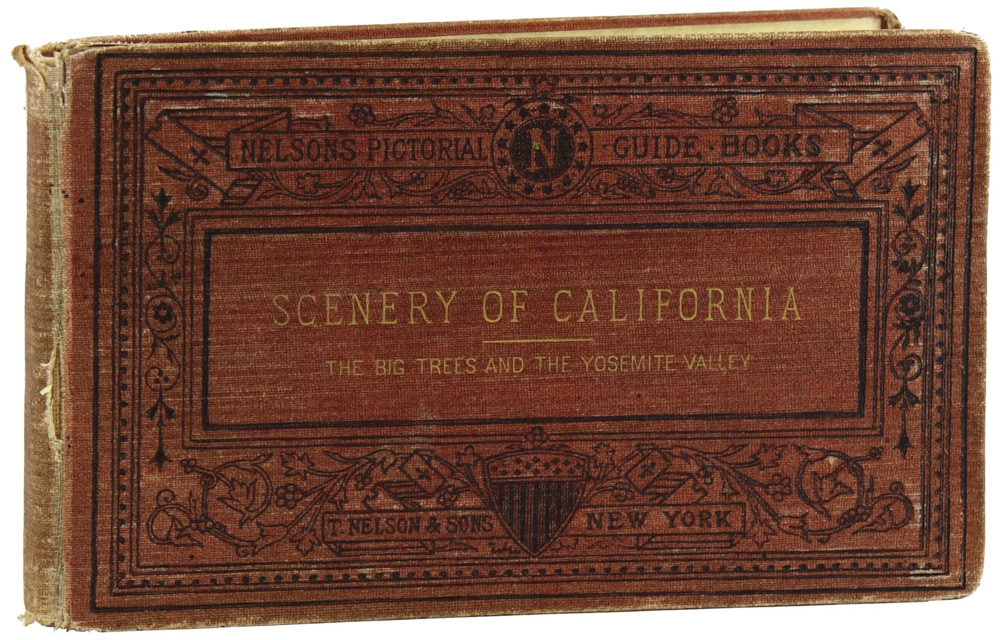 New York: T. Nelson and Sons, 1871. Very Good -. New York: T. Nelson and Sons, [c. 1871]. Oblong 12mo (10 cm); 40pp. 12 chromolithographic plates, collated complete. Boards full bound in light red cloth with black pictorial and gilt stamping. Boards scuffed and worn with most wear at spine with fading to all edges. Binding shaky but firm. Pages smudged and lightly soiled with news agency stamp to first free endsheet and previous owner name to last free endsheet. A Very Good copy of Nelson's Pictorial Guide Book for the scenery of Yosemite, printed as a companion to their similar guidebook on the National Pacific Railroad.