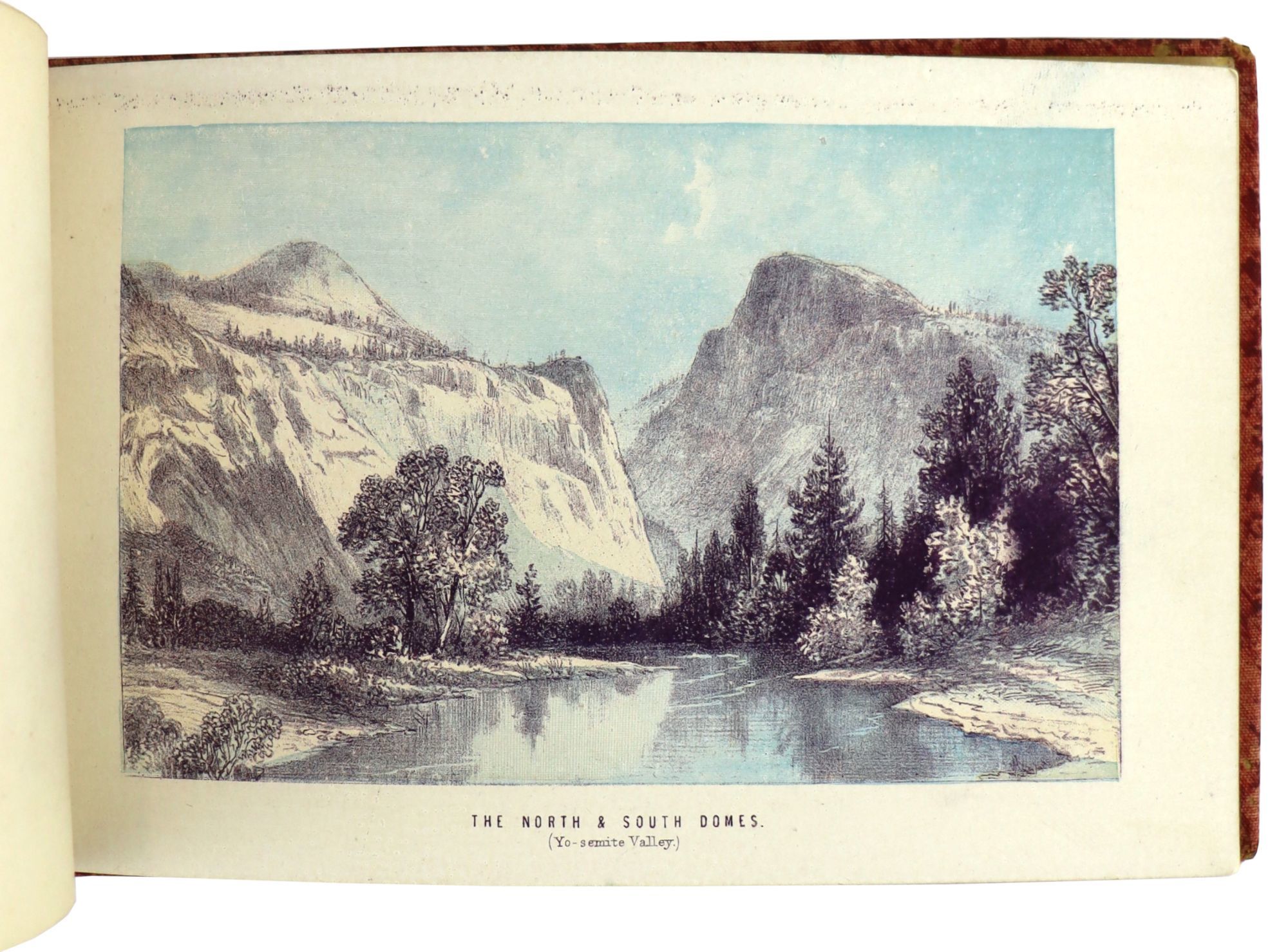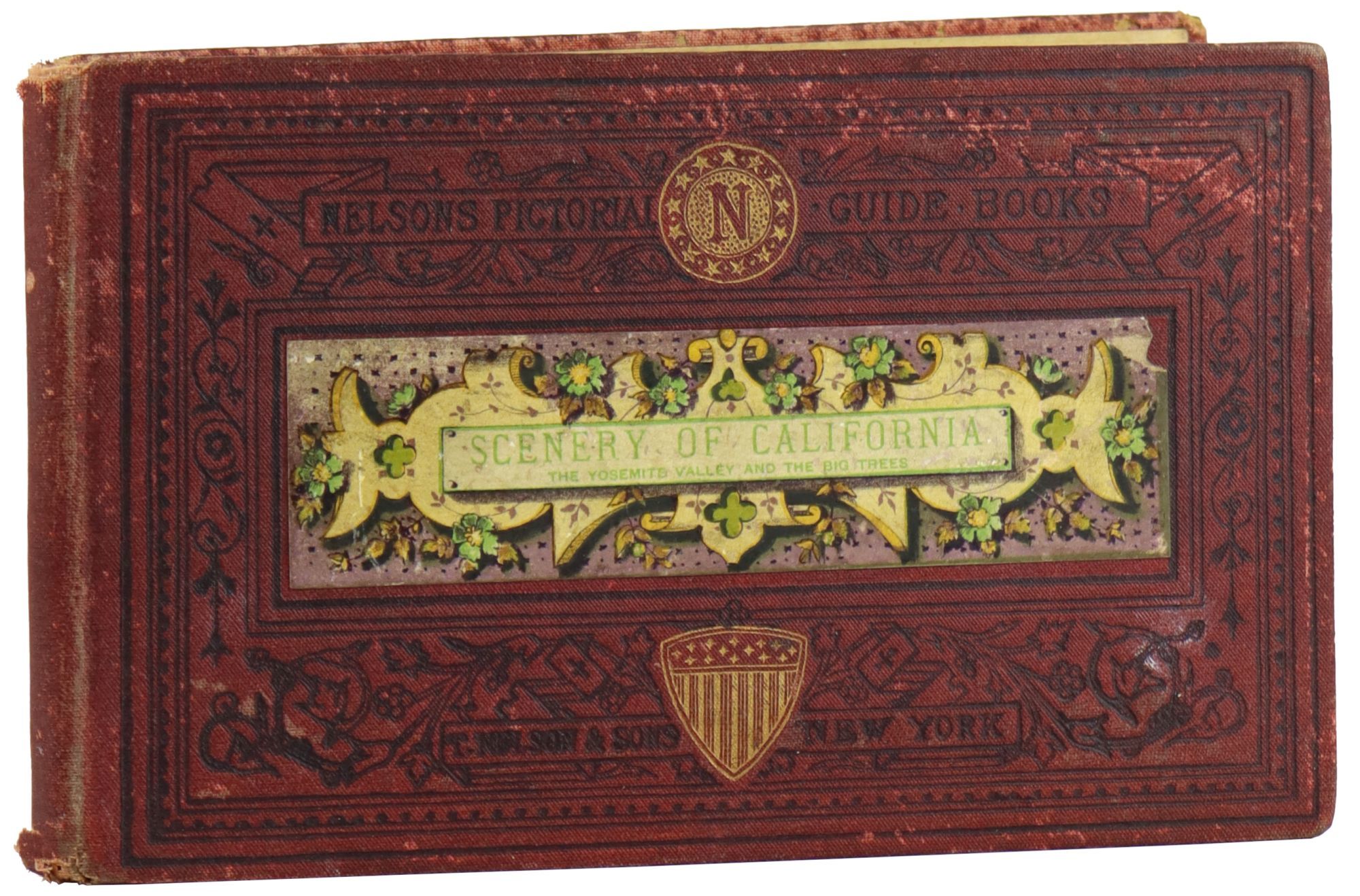 New York: T. Nelson and Sons, 1871. Very Good. New York: T. Nelson and Sons, [ca. 1871]. Oblong 12mo (10 cm); 40pp. 12 chromolithographic plates, collated complete, bound at end of book. Boards full bound in light red cloth with black and gilt pictorial stamping and pasted printed paper of title. Boards scuffed and worn with most wear at spine with fading to all edges. Binding shaky but firm with starting to both endsheet hinges. Pages lightly smudged but mostly clean with some toning to endsheets. A Very Good copy of Nelson's Pictorial Guide Book for the scenery of Yosemite, printed as a companion to their similar guidebook on the National Pacific Railroad.