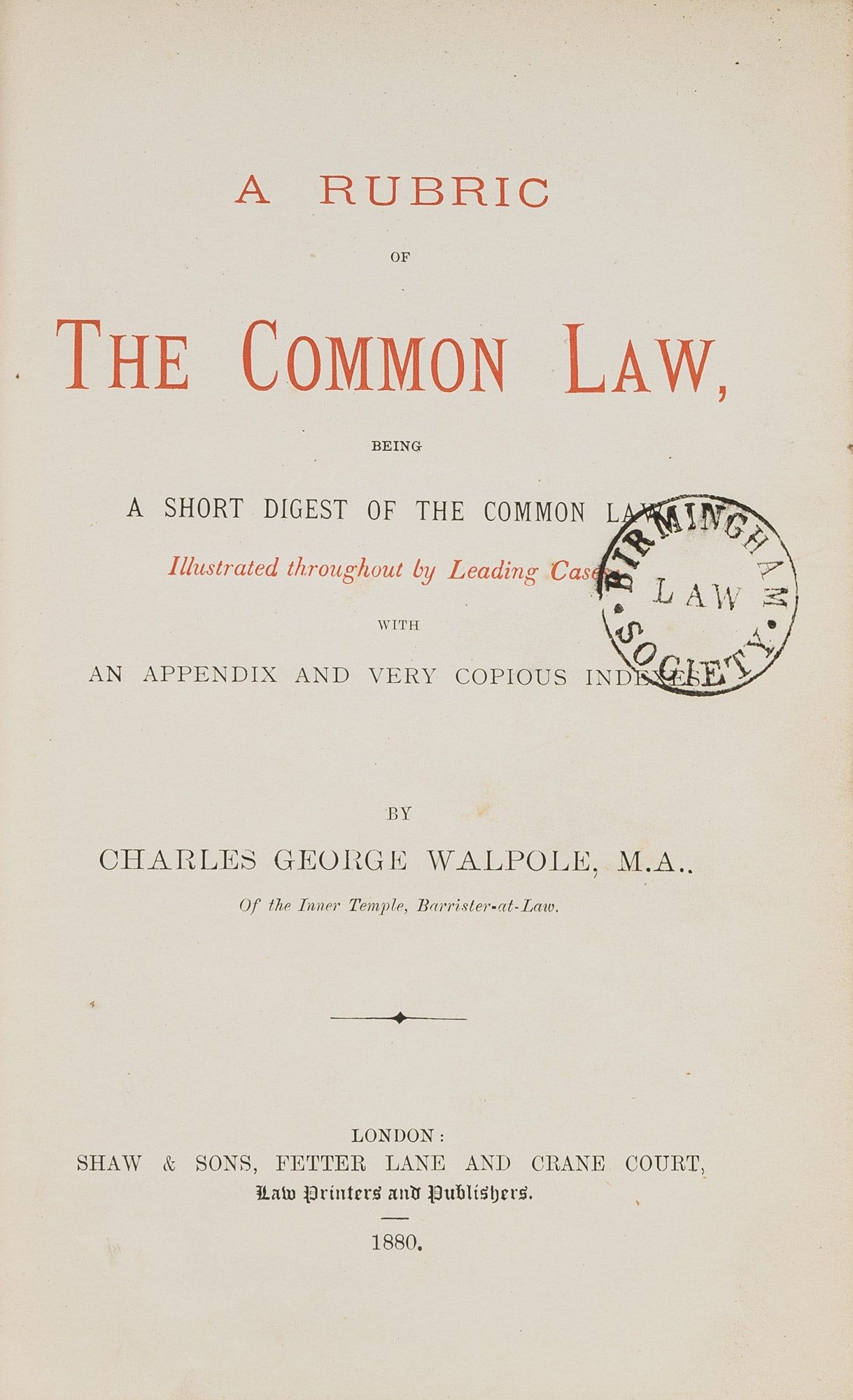 1880. London: Shaw & Sons, 1880.. London: Shaw & Sons, 1880. Walpole, Charles George. A Rubric of the Common Law: Being a Short Digest of the Common Law: Illustrated Throughout by Leading Cases, with an Appendix and Very Copious Indexes. London: Shaw & Sons, 1880. xxi, 350 pp. Original red cloth with gilt stamped spine and boards. Worn and soiled. Rubbed and darkened spine and extremities. Red and black ink title page. Ex-library with property stamps to title page, preface, table of contents and table of cases cited, otherwise internally clean. $85. * "This book it is hoped may be of use to students; and is intended to serve as a kind of skeleton, whereon may be subsequently adjusted the various ramifications, details, and distinctions, which are to be sought for and found in the great textbooks" (Preface, [v]).