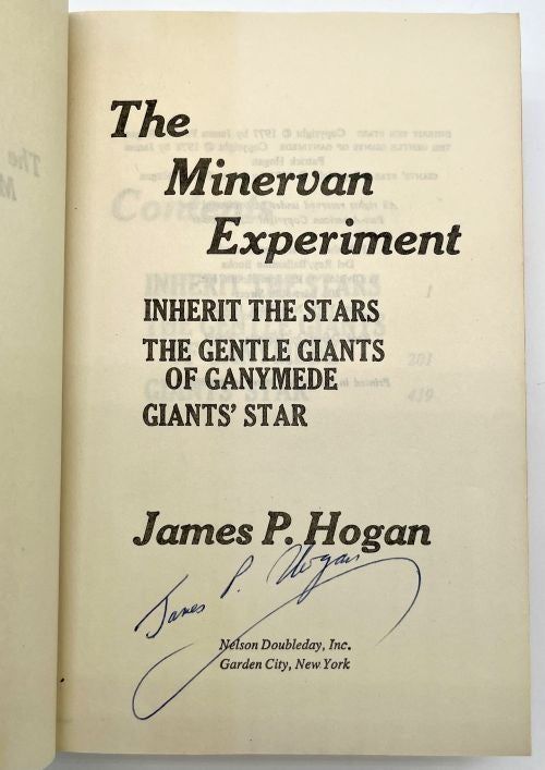 Garden City: Nelson, Doubleday, Inc, 1981. Book Club. Hardcover. Near Fine/Very Good. SIGNED. 728pp. Octavo [21.5cm]. 1/4 black paper with mustard yellow boards. Title stamped in pink ink on spine. Dust jacket is toned, and the edges are mildly chipped. Signed by James P. Hogan on the title page.