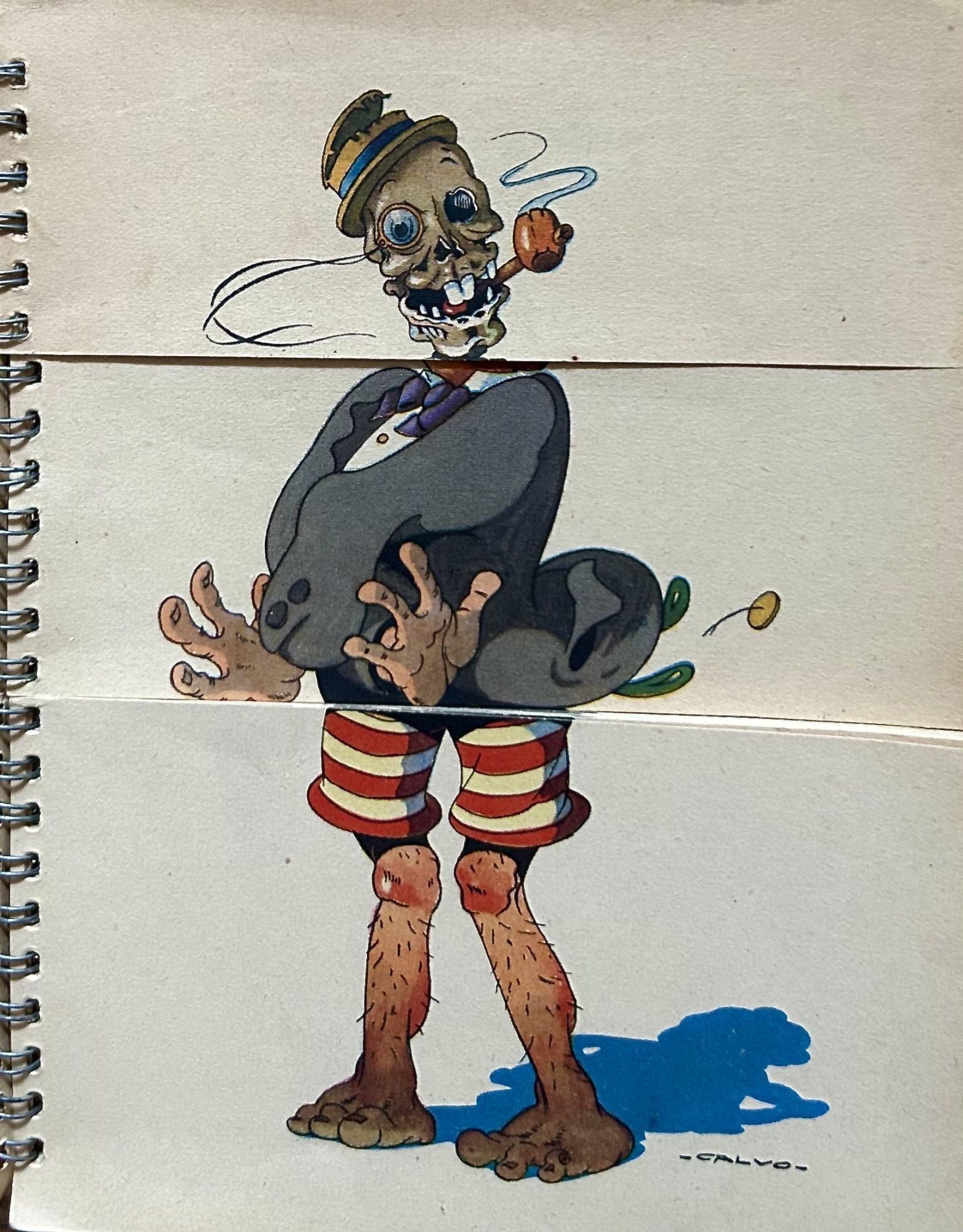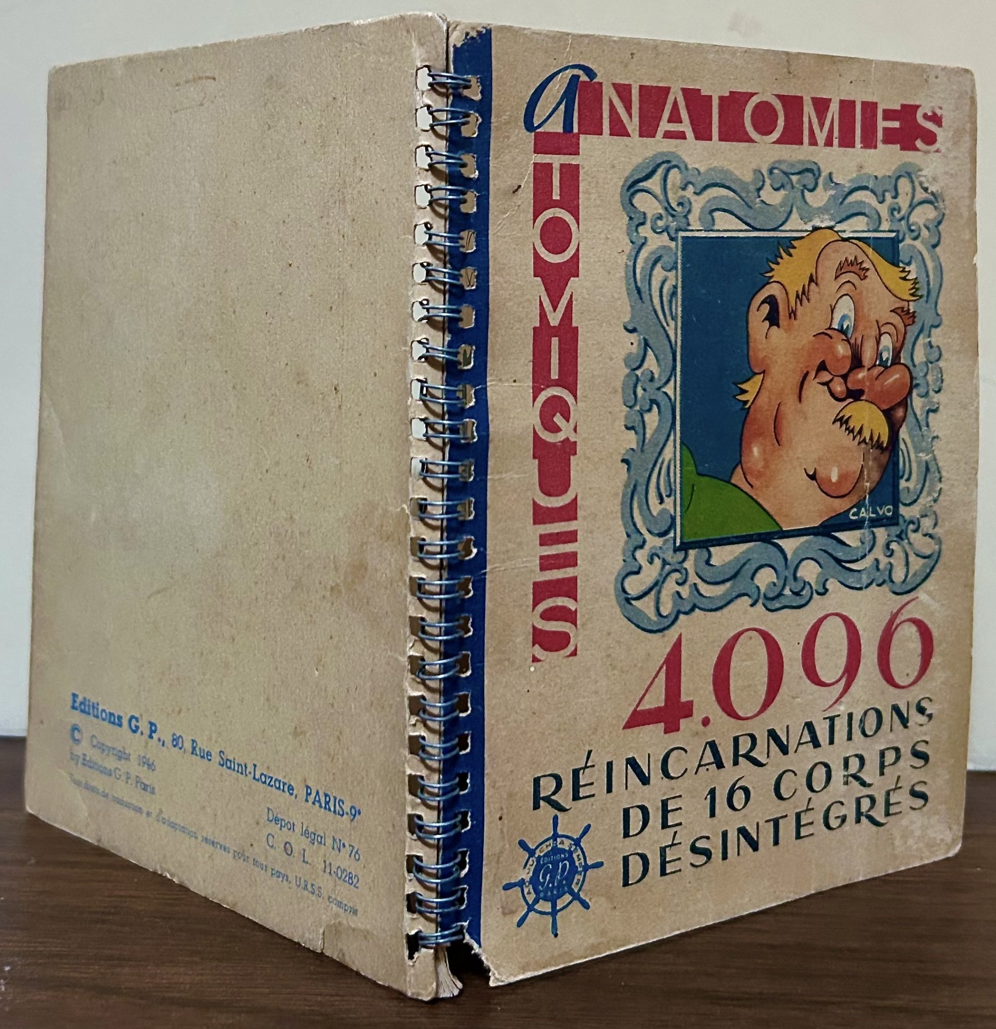 Paris: First Edition, 194. Editions G.P.. Hardcover. Orig. illustrated boards in a host of colors with a spiral metal spine. Very good. Unpaginated. 16 x 12 cm. No text, a series of images, color lithographs, each page in three parts to allow manipulation to create a host of different images at the will of the manipulator. "Ce livre à système de 48 volets permet de combiner les têtes, bustes et jambes de 16 personnages en 4096 combinaisons différentes." OCLC: 969823755. Calvo, a French comics artist was called the French Disney.