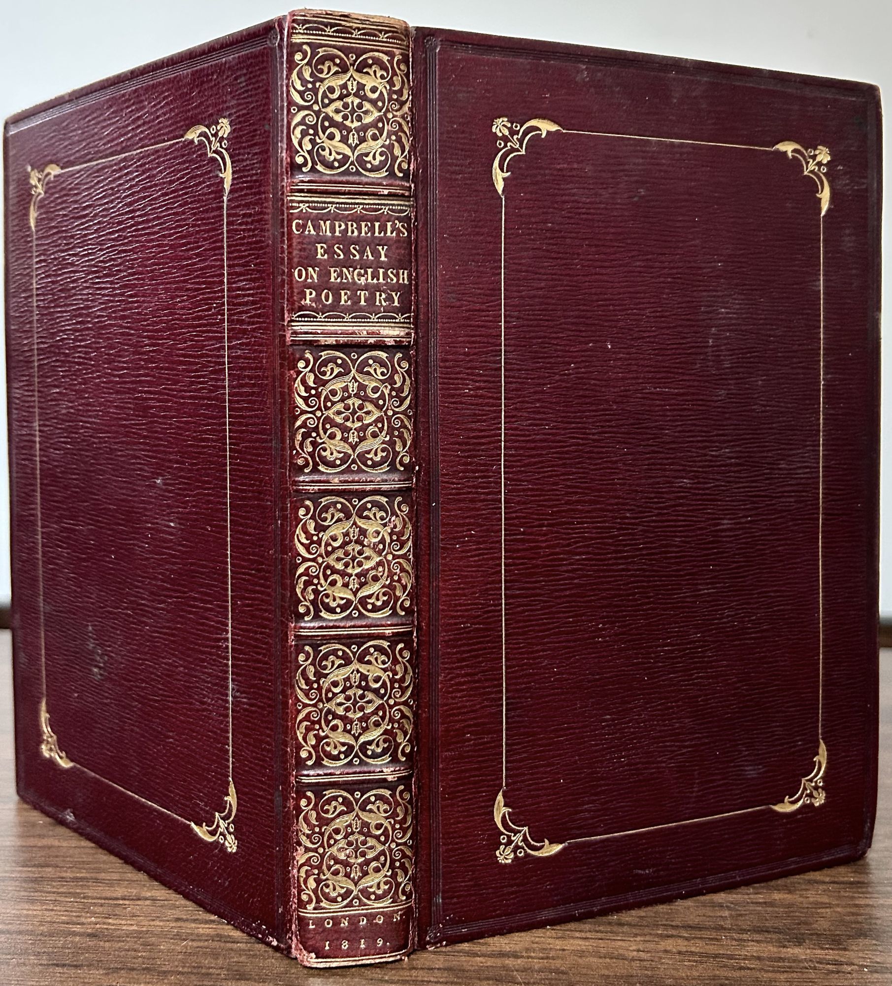 London: John Murray, 1819. First edition. leather_bound. Later full maroon morocco. Aeg. Fine. 271 pages. 19 x 12.5 cm. Presentation copy from the Publisher to Honorable Douglas Kinniaird on half title. The Honourable Douglas James William Kinnaird (26 February 1788 – 12 March 1830) was an English banker, politician, friend of Lord Byron and amateur cricketer. Byron’s old friend from Cambridge University, Kinnaird acted as Byron’s banker who acted as his literary agent once the poet left England in 1816. Interior contents very clean and fresh. Raised bands, spine panels decorated in gilt arabesques, lettered in gilt. Decorated cover border panels.