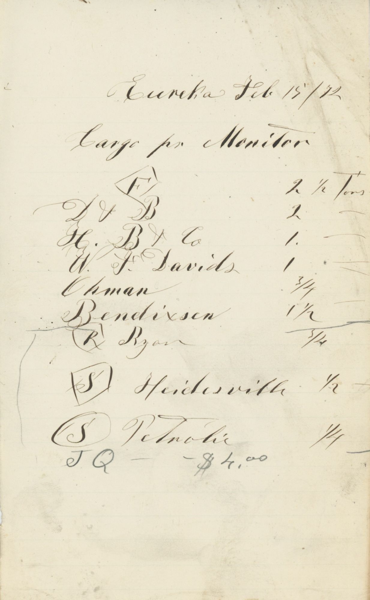 Eureka, California, 1873. Single 5 ½ x 12 inch ledger book with five small pages of notes and one short letter. Forty-two pages of the ledger filled out with many more blank. Some damage to spine on exterior, otherwise very good to excellent.. Offered here is a wharfage fee account ledger from Eureka, California, with dates between 1868 and 1873. The first Euro-American settlement at what is now Eureka, on the Humboldt Bay, was founded in 1850. It became a hub for bringing supplies to the Trinity, Klamath, and Salmon River mines, both by water and over land, and a major lumber manufacturing town with seven sawmills by 1858.[1] Lumber vessels sent lumber down the Pacific coast as far as Chile. By the 1860s and 70s, Eureka’s main exports were lumber and produce (including pork and seafood) via sailing vessels, and there was also regular steamer service taking people and goods between there and San Francisco. Wharfage would have been paid at the port at Eureka for loading or unloading cargo; the ledger tracks ship names alongside either the names of men who loaded the cargo or the cargo type, quantities, and prices.