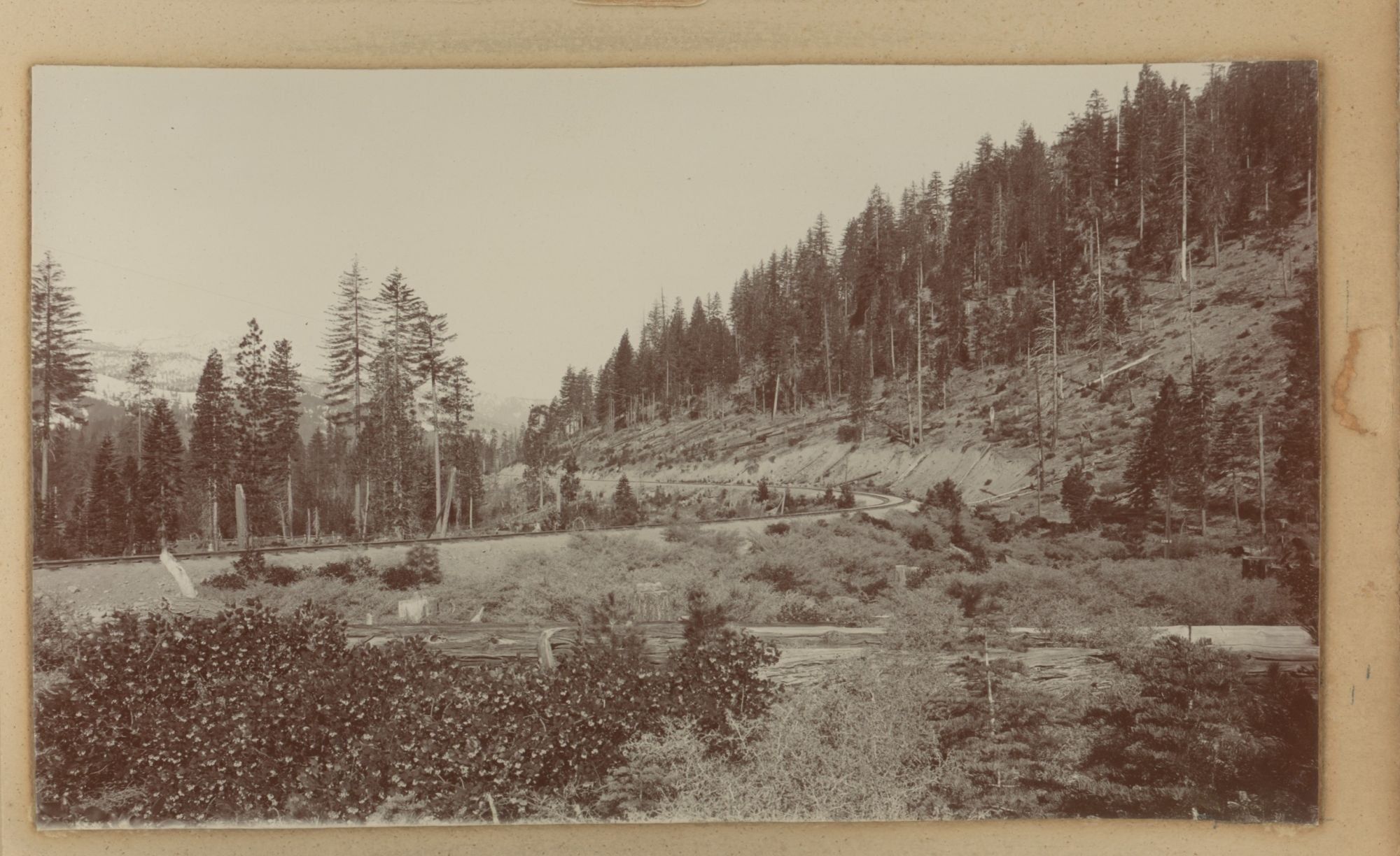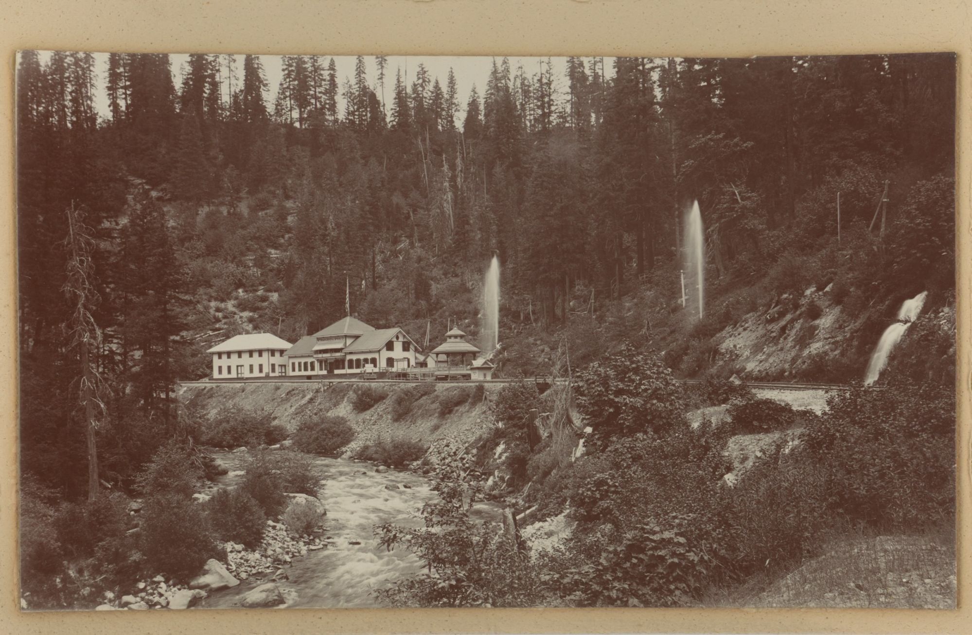 The photographs are mainly from places in Siskiyou County, where Mount Shasta is located, including shots of the towns of Sisson (now Mount Shasta) and Dunsmuir, Sisson and Dunsmuir are on the Siskiyou Trail, an ancient Native American footpath running from the San Francisco area to Portland, Oregon. The Central Pacific Railroad Company completed a train line along the Siskiyou Trail in 1887; one shot from an unknown location shows railroad tracks rounding a curve among felled trees. Just outside of Dunsmuir is the Shasta Springs resort (mislabeled here as Shasta Bottling Works), famous for its springwater – the fountains of water in the photograph are from pressurized pipes coming from the springs.