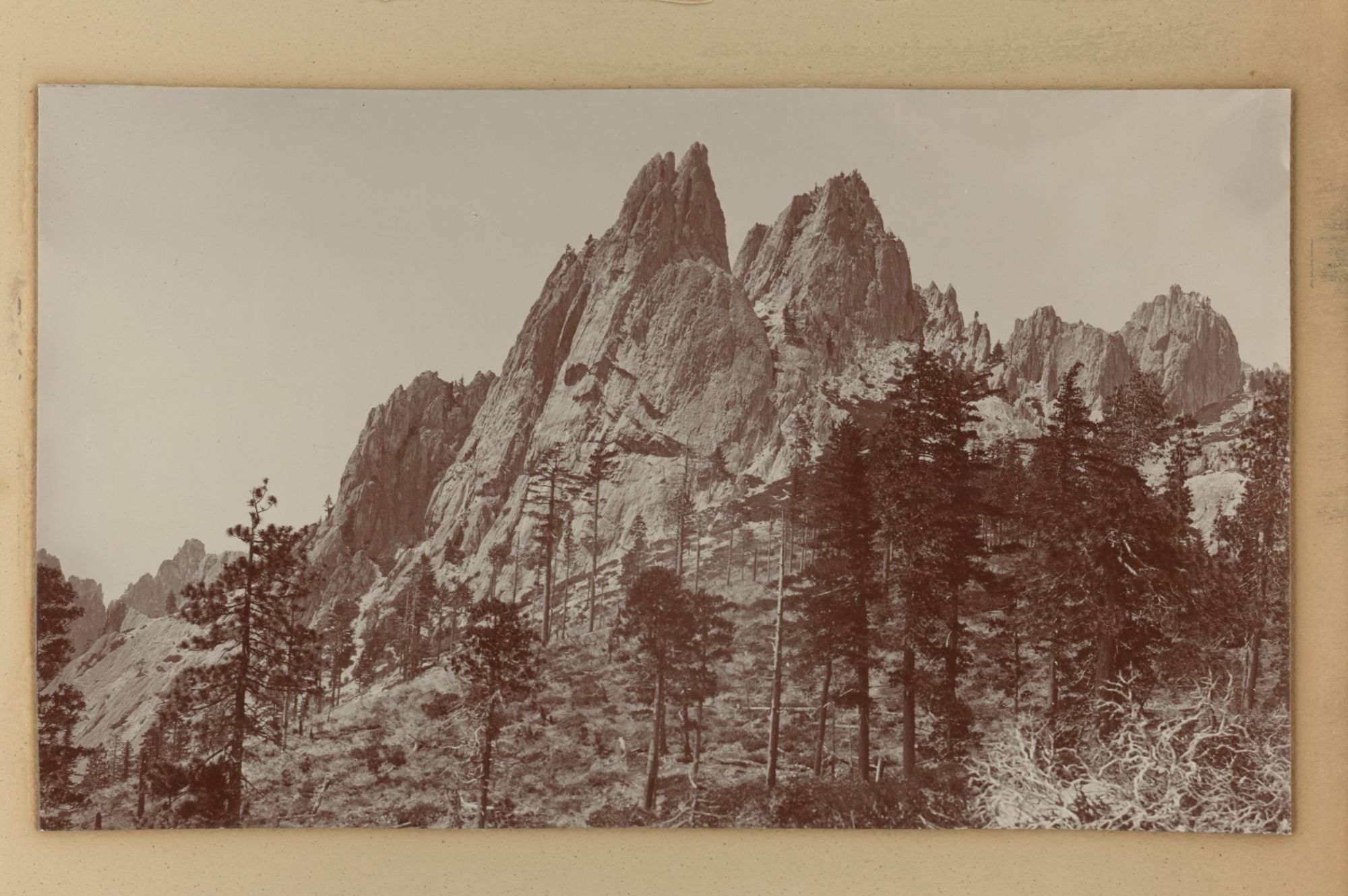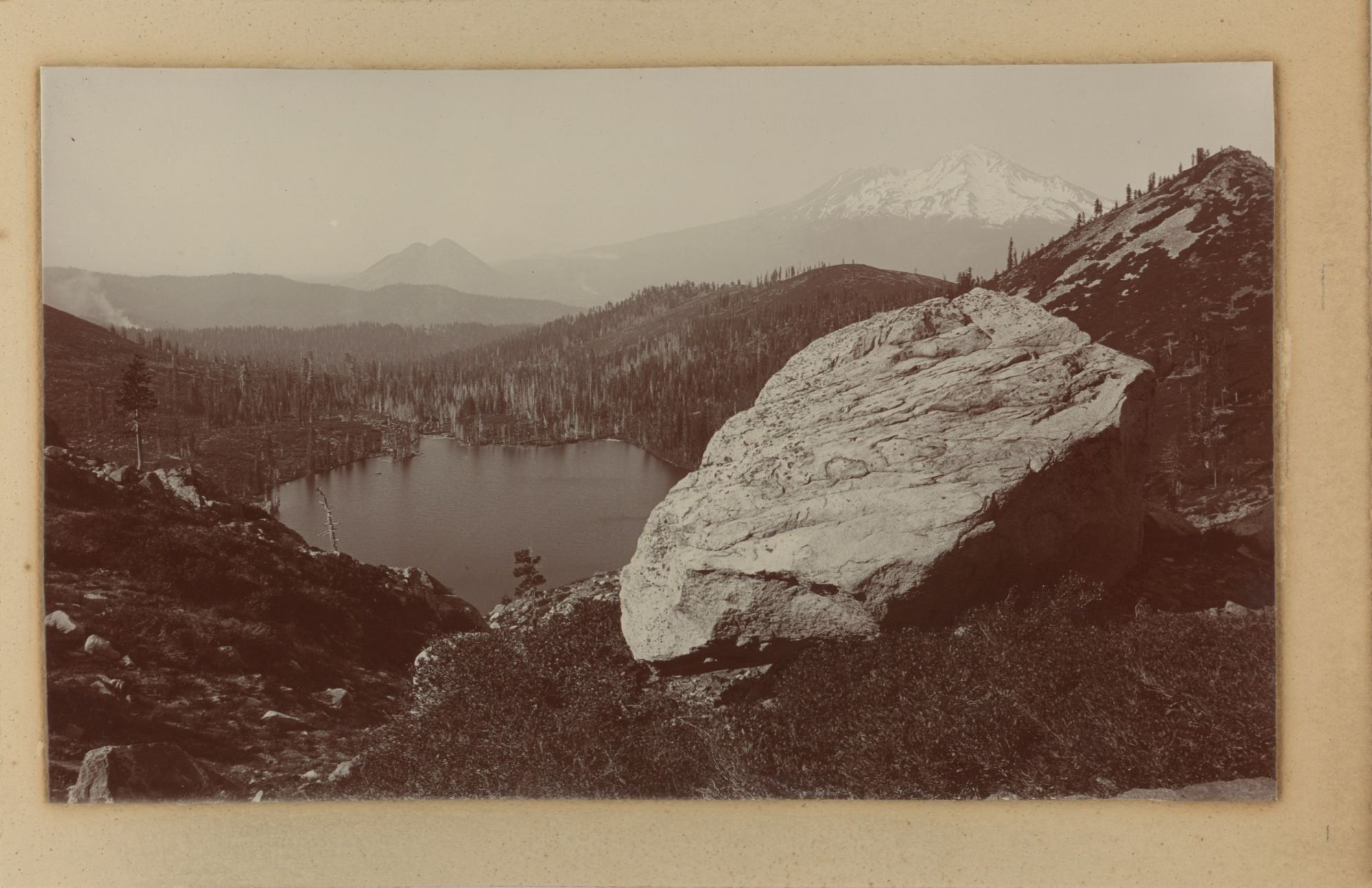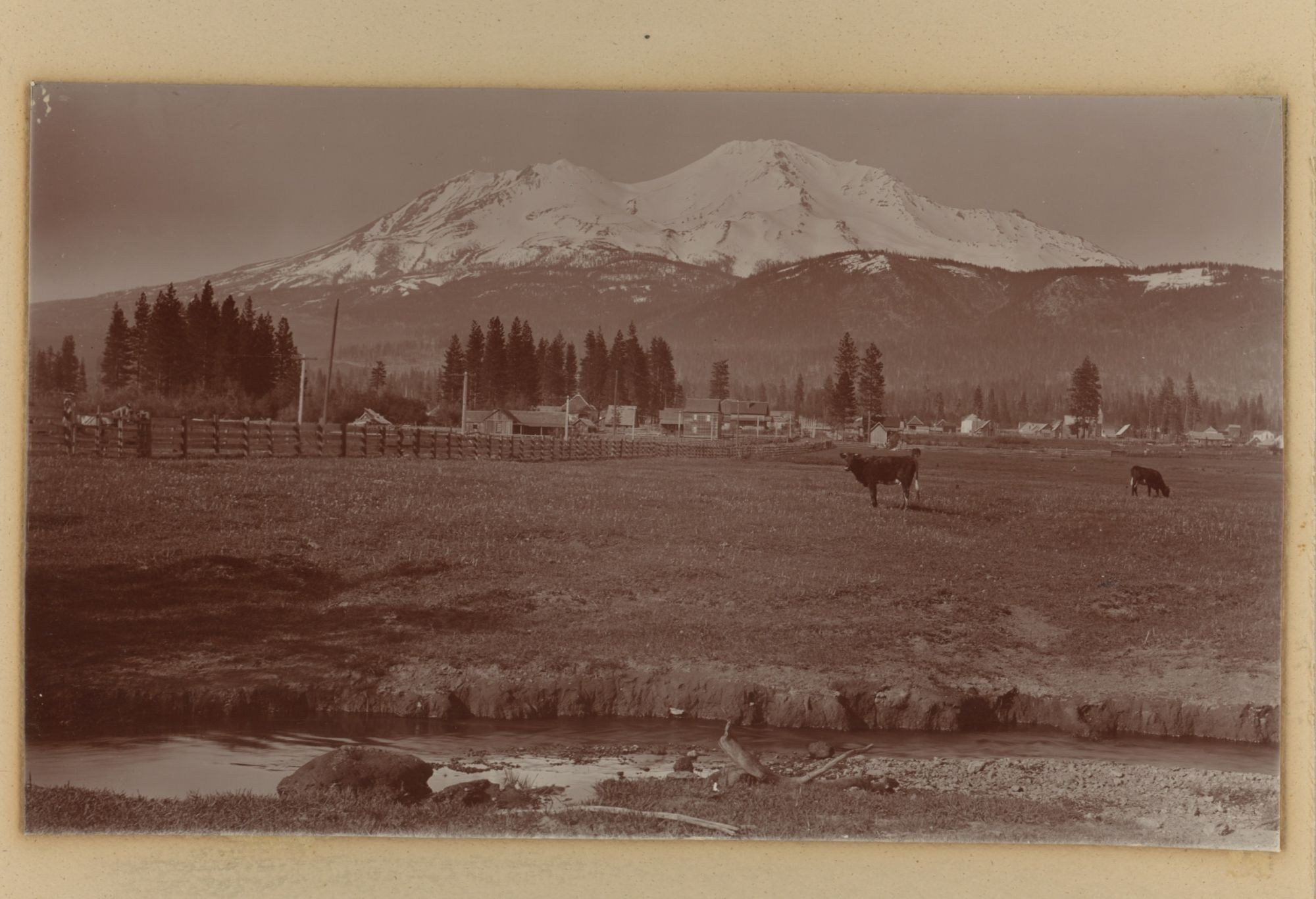 Shasta County and Siskiyou County, 1890. Fifteen photographs, approximately 4 ½ x 7 ½ inches. Each mounted on heavy cardboard backing approximately 5 ½ x 8 ½ inches, which is mounted on heavy cardboard of approximately 8 x 10 ½ inches. Unknown if photographs are stamped verso due to mounting. Some with recent captions on the largest mount; some captions likely incorrect (see description). Fine contrast, overall fine condition.. Raper James Waters (1856–1937) was a professional photographer from Sacramento, California. He was first active as a photographer in Gold Hill, Nevada, in the 1880s. Following this, he returned to California, and had studios in Berkeley and San Francisco between the late 1880s and mid-1920s. Offered here is a collection of fifteen of Waters’ photographs from around Mount Shasta, likely from the late 1880s or 1890s.