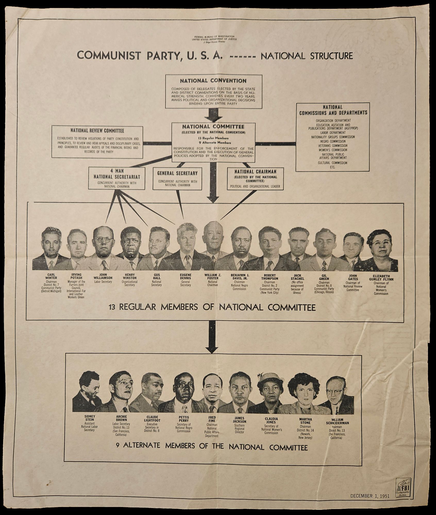 Washington, D.C., 1951. 10 x 12 inch sheet. Folded; slightly crumpled towards bottom. Very good to excellent.. A 1951 poster produced by the FBI explaining the national structure of the Communist Party USA, including names and photographs of the thirteen National Committee members and their nine alternates. During this time—slightly predating the formation of COINTELPRO—Hoover’s FBI was already engaged in surveilling, burglarizing, and otherwise persecuting alleged Communists, and forcing them out of government jobs. Represented among CPUSA leadership on this poster are all those convicted in 1949 of violations of the Smith Act – on Hoover’s recommendation and with the help of several FBI informants.