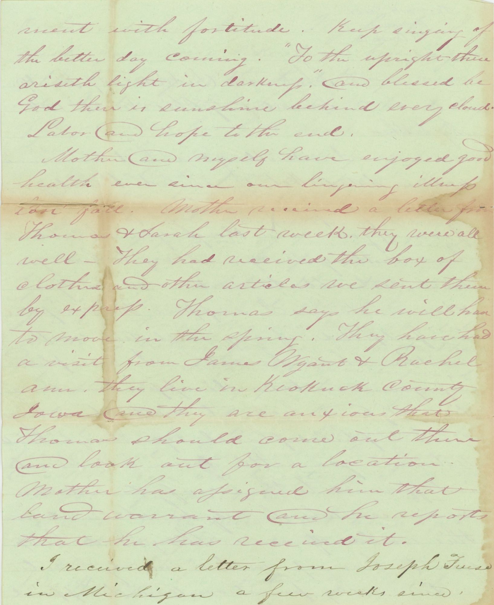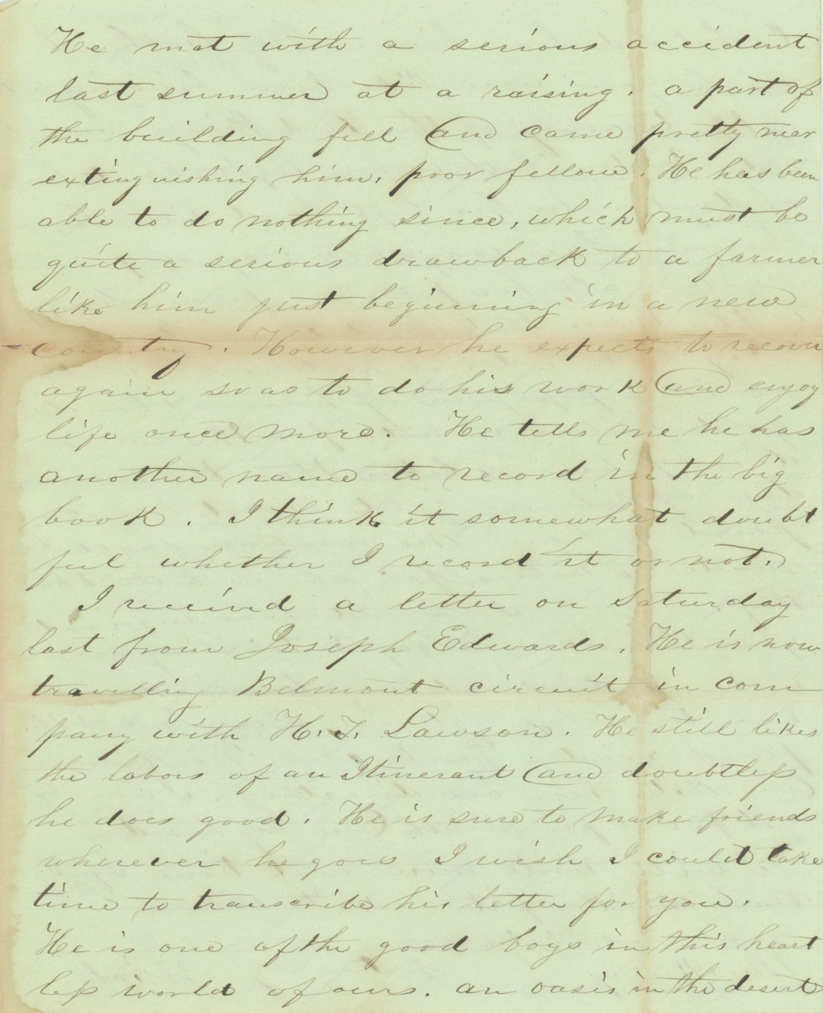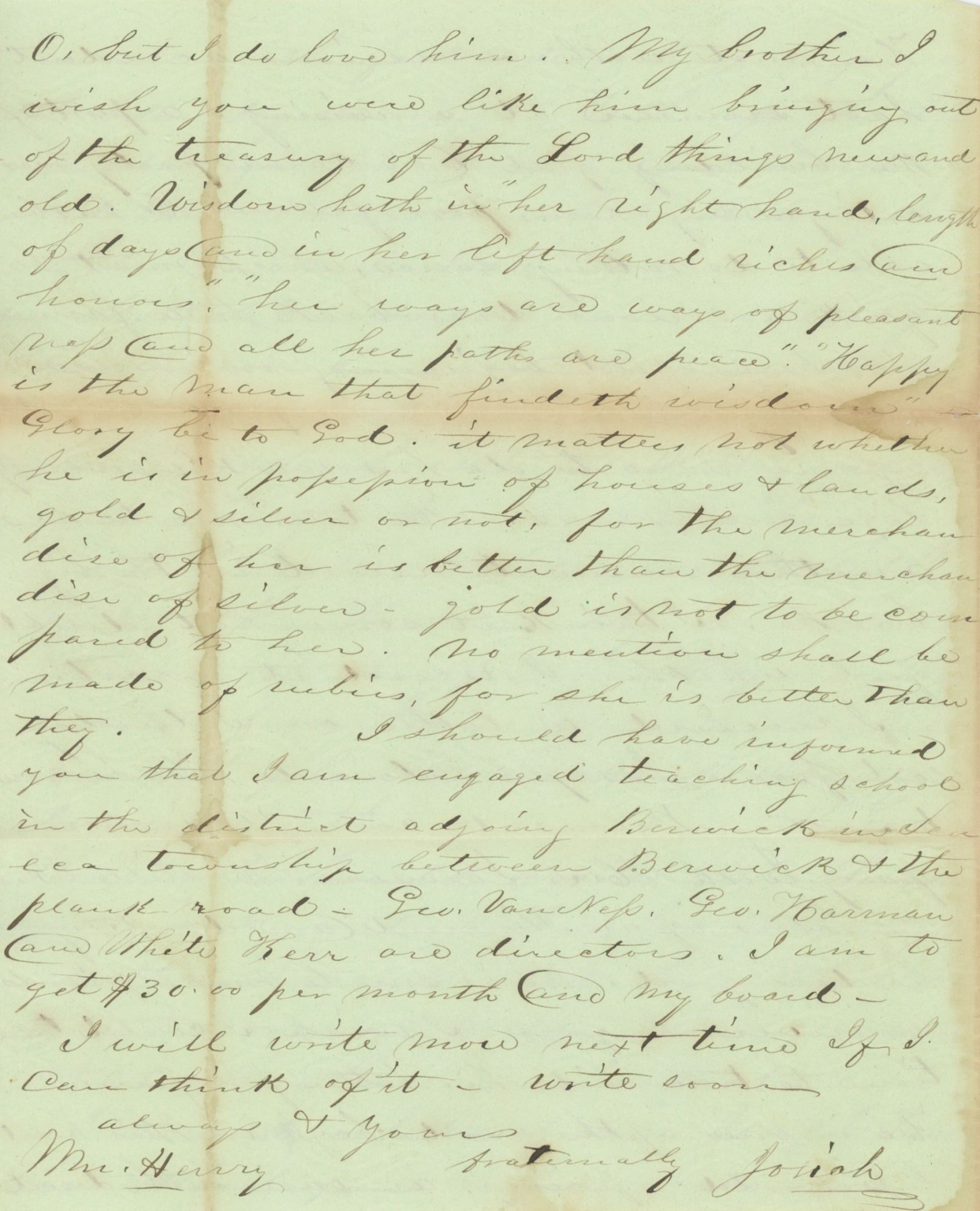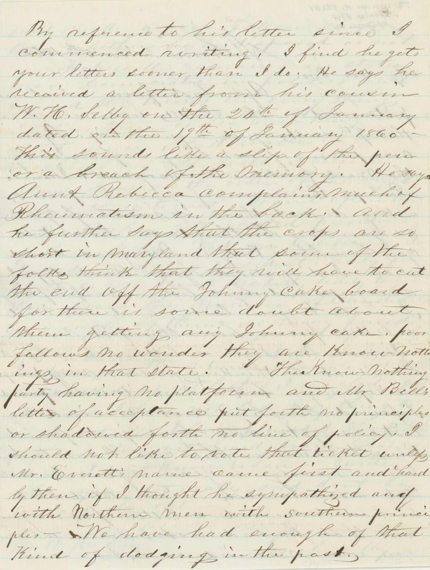 “says that the crops are so short in Maryland that some of the folks think that they will have to cut the end off the Johnny Cake board for there is some doubt about them getting any Johnny cake. Poor fellows no wonder they are know-nothings in that state. The Know Nothing party having no platform and Mr Bell’s letter of acceptance put forth no principles or shadowed forth no line of policy. I should not like to vote that ticket unless Mr. Everett’s name came first and hard by then if I thought he sympathized with any Northern men with southern principles – We have had enough of that kind of dodging in the past.” (November 15, 1860)