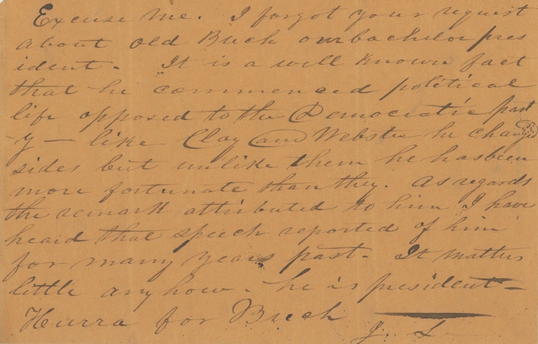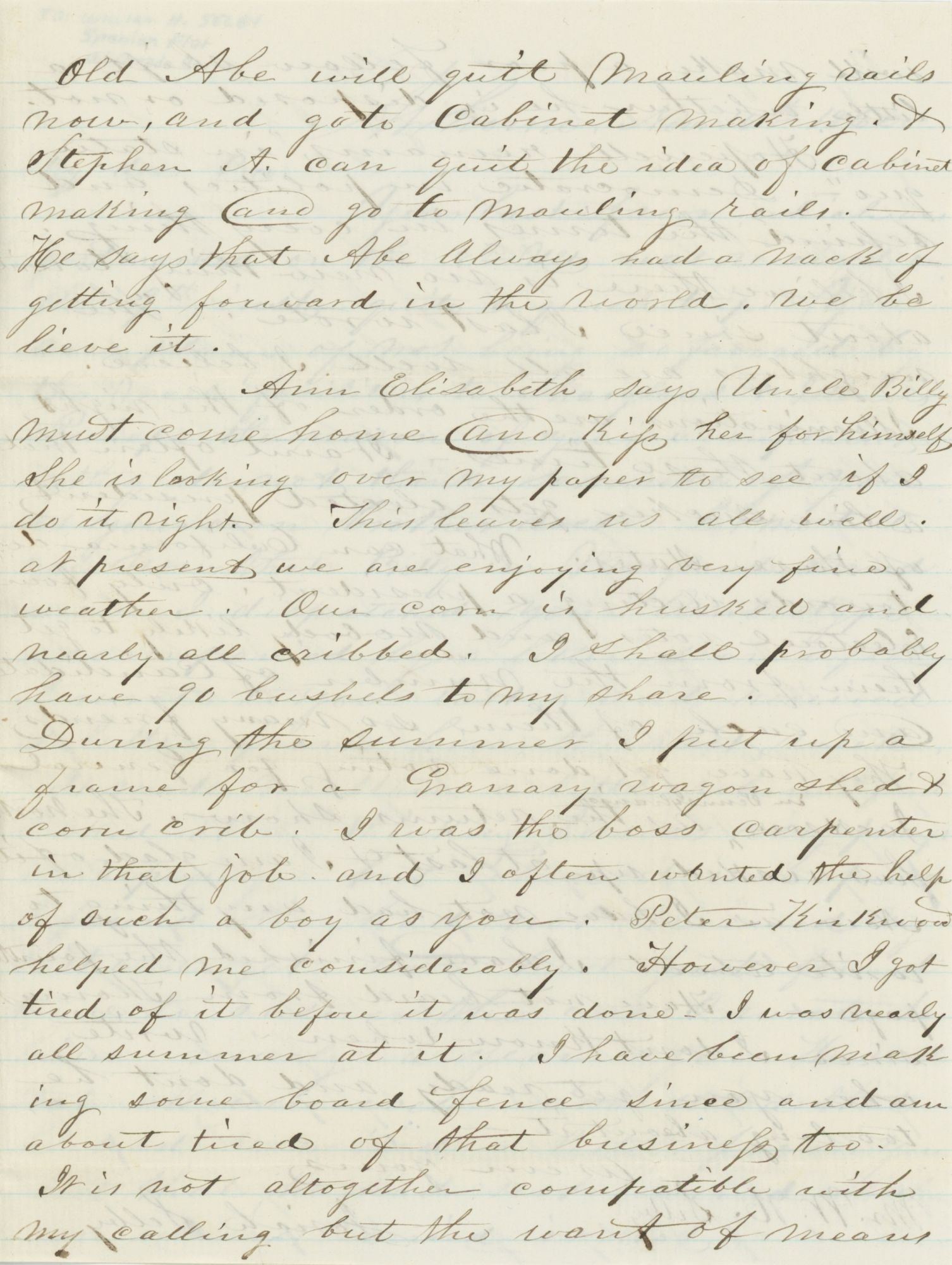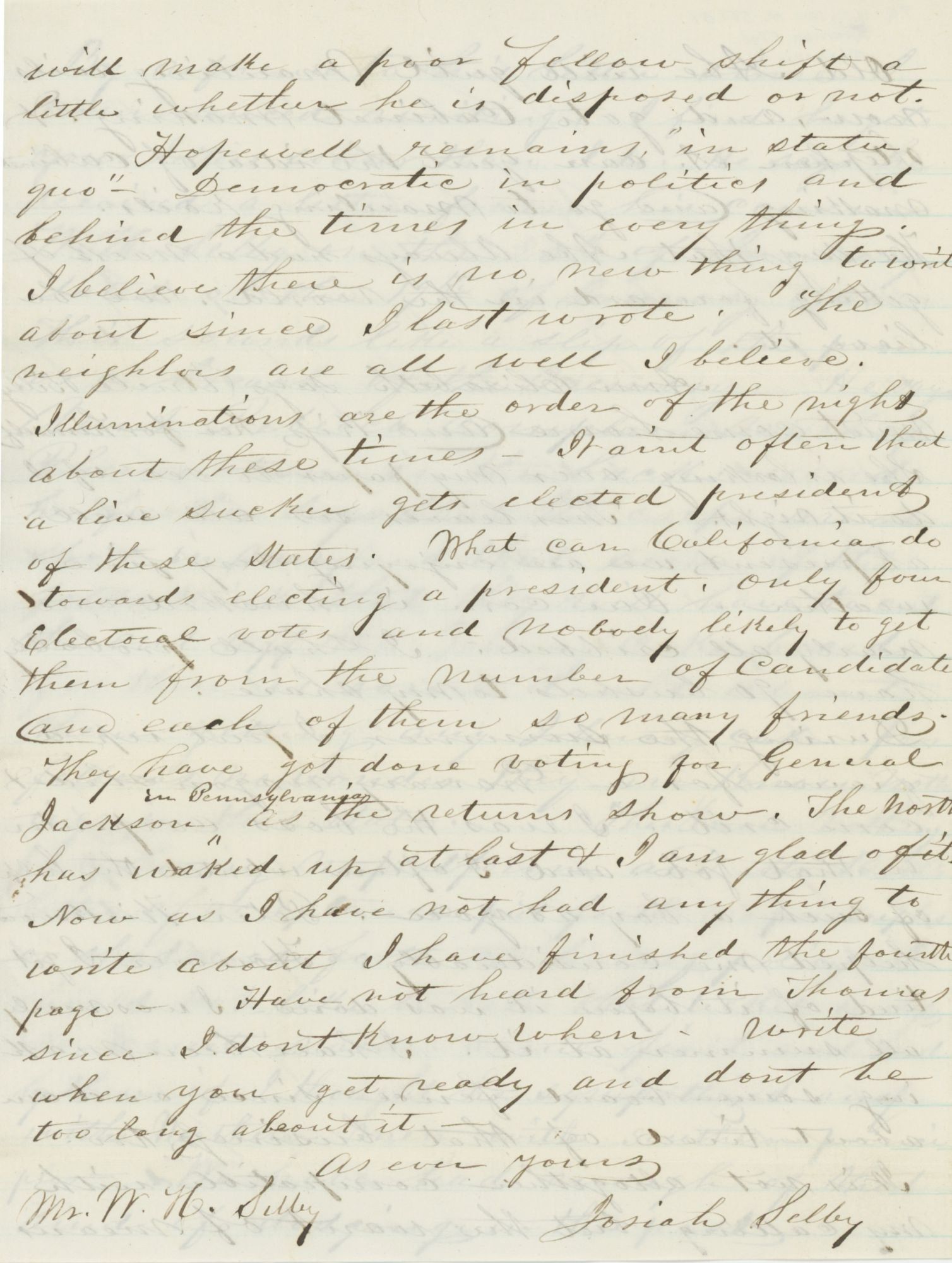 “Old Abe will quit mauling rails now, and go to Cabinet making. & Stephen A. can quit the idea of cabinet making and go to mauling rails. He says that Abe always had a [k]nack of getting forward in the world. We believe it. [...] They have got done voting for General Jackson in Pennsylvania as the returns show. The north has waked up at last & I am glad of it.”