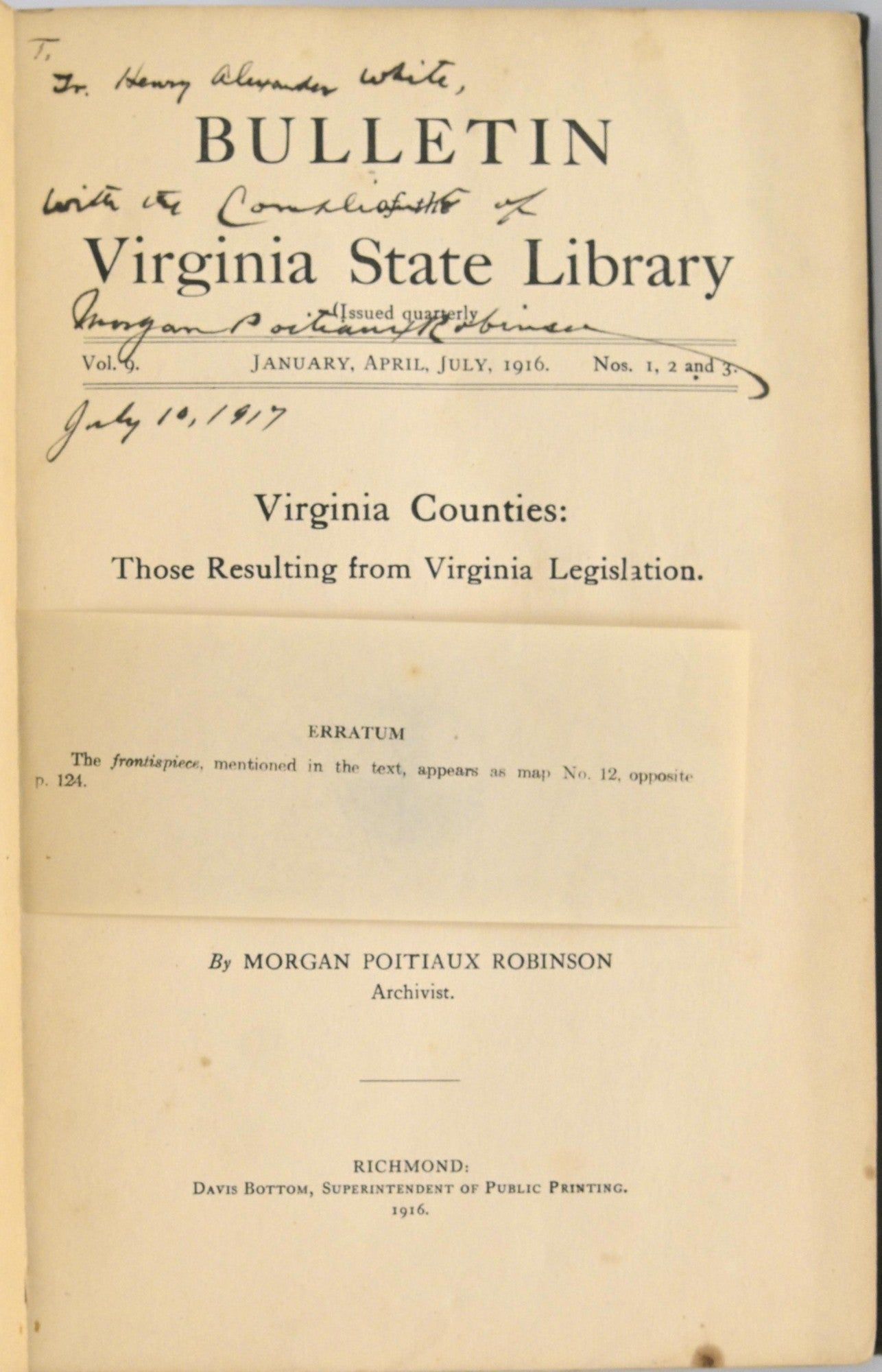 Richmond: Davis Bottom, 1916. Hard Cover. Very Good binding. Signed. Large 8vo; in period brown cloth; with a paper label on the spine; with twelve maps, four of which are folding; light sunning to the spine with a bit of fraying to the top.~~A bound issue of the Bulletin of the Virginia State Library, with wrappers bound in The bound in wrappers are soiled. This copy signed with a personal inscription by Morgan Poitiaux Robinson and dated July 10, 1917. Very Good binding.
