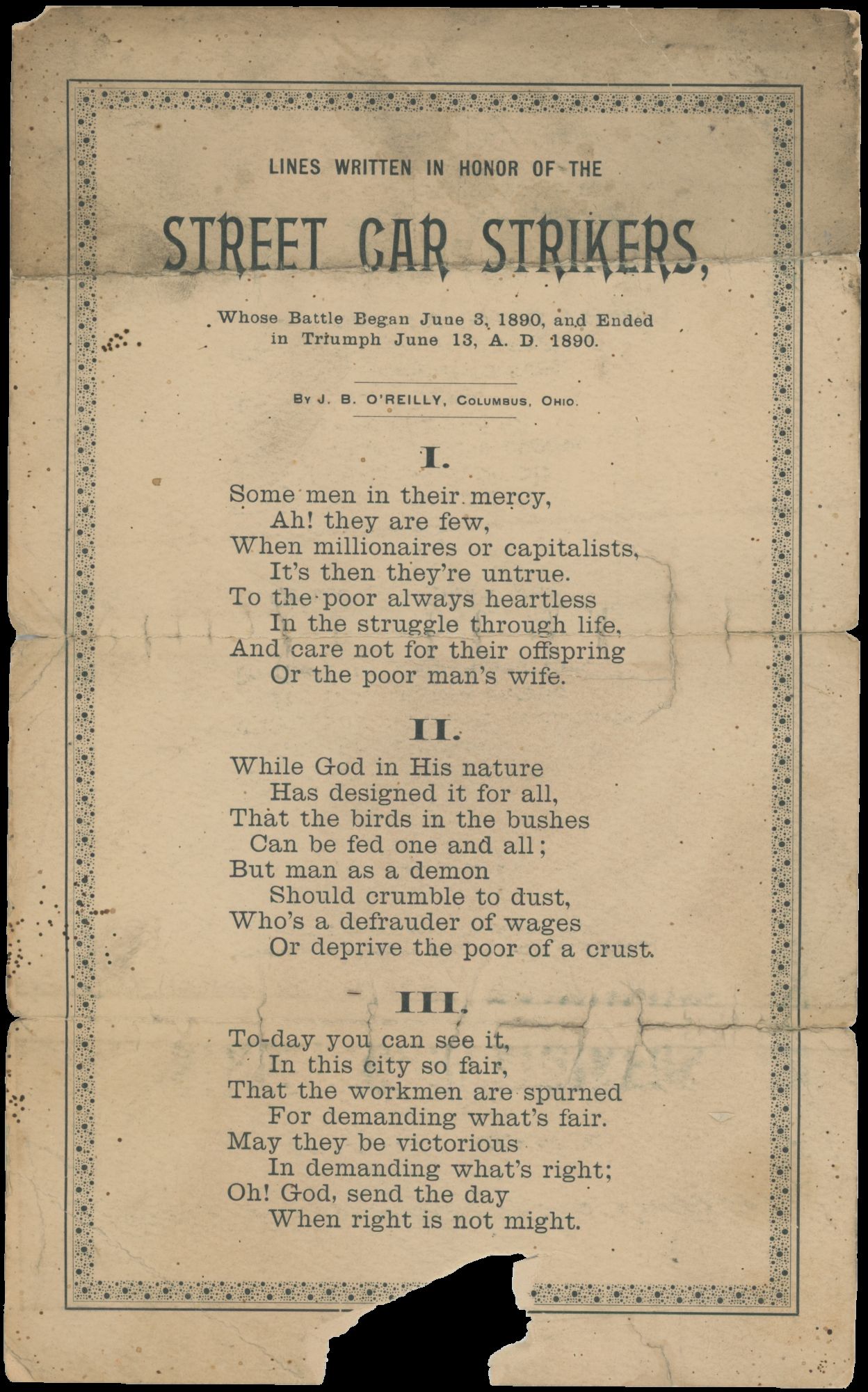 Columbus, Ohio, 1890. 7 x 11 inches. Folded with tears at folds, piece missing from center bottom, not intersecting with text. Overall good.. A handbill with a poem written by J.B. O’Reilly celebrating the victory of striking streetcar workers in Columbus, Ohio in 1890. On June 3, workers formed a union and commenced a strike, demanding shorter hours and higher wages. They successfully negotiated for both of these demands, bringing their workdays down from sixteen hours to a mere twelve.[1] O’Reilly writes: