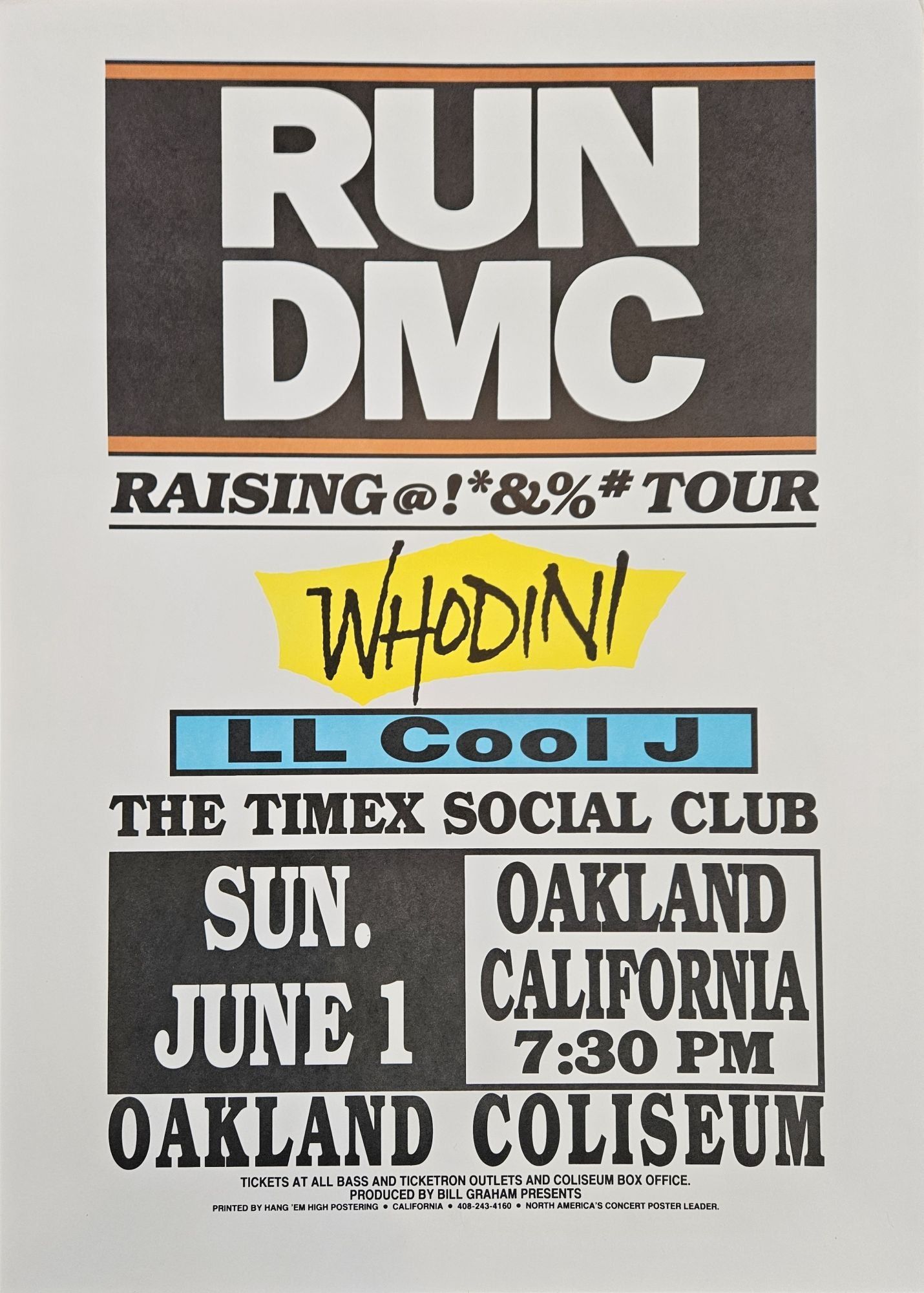 Oakland, California, 1986. 18 x 25 inch poster on heavy cardstock. Fine.. Poster for Run-DMC’S Raising Hell Tour featuring Whodini, LL Cool J, and R&B group Timex Social Club. Run-DMC were touring on their third studio album, Raising Hell, which went triple platinum. Later tour dates, including New York City, Pittsburgh, and Long Beach, were disrupted by alleged gang violence, causing Run-DMC to cancel at least one date. Nonetheless, the album and tour are variously credited with kicking off the so-called golden age of hip-hop and cementing the genre in popular culture, making the careers of LL Cool J and the Beastie Boys (who did not play at this particular date), and reviving the career of Aerosmith.