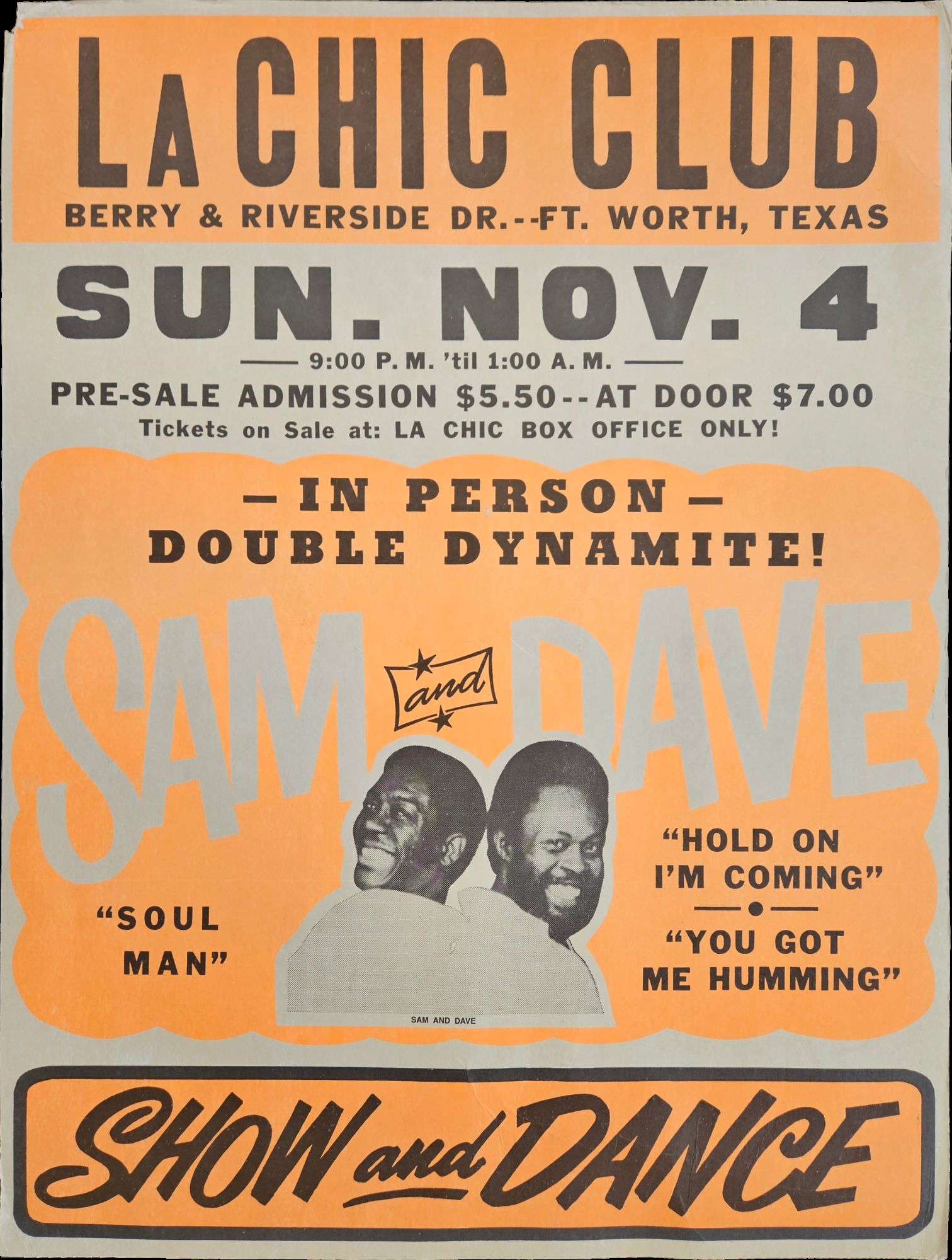 Fort Worth, Texas, 1973. 18 x 23 ½ inch poster on heavy cardstock. Some creasing and wear, chip at top left corner; excellent.. A poster advertising a 1973 concert and dance with celebrated R&B act and Rock & Roll Hall of Famers Sam and Dave (Sam Moore and Dave Prater) at La Chic Club in Fort Worth, Texas. The duo earned the nickname “Double Dynamite”, as they are called on the poster, from their legendary live performances.