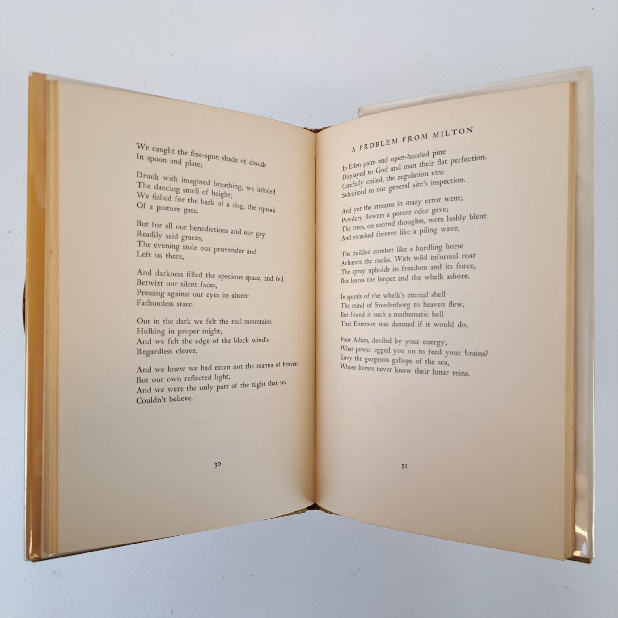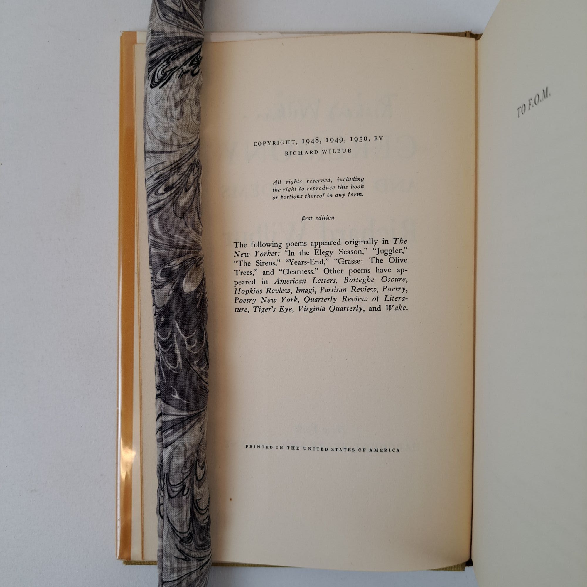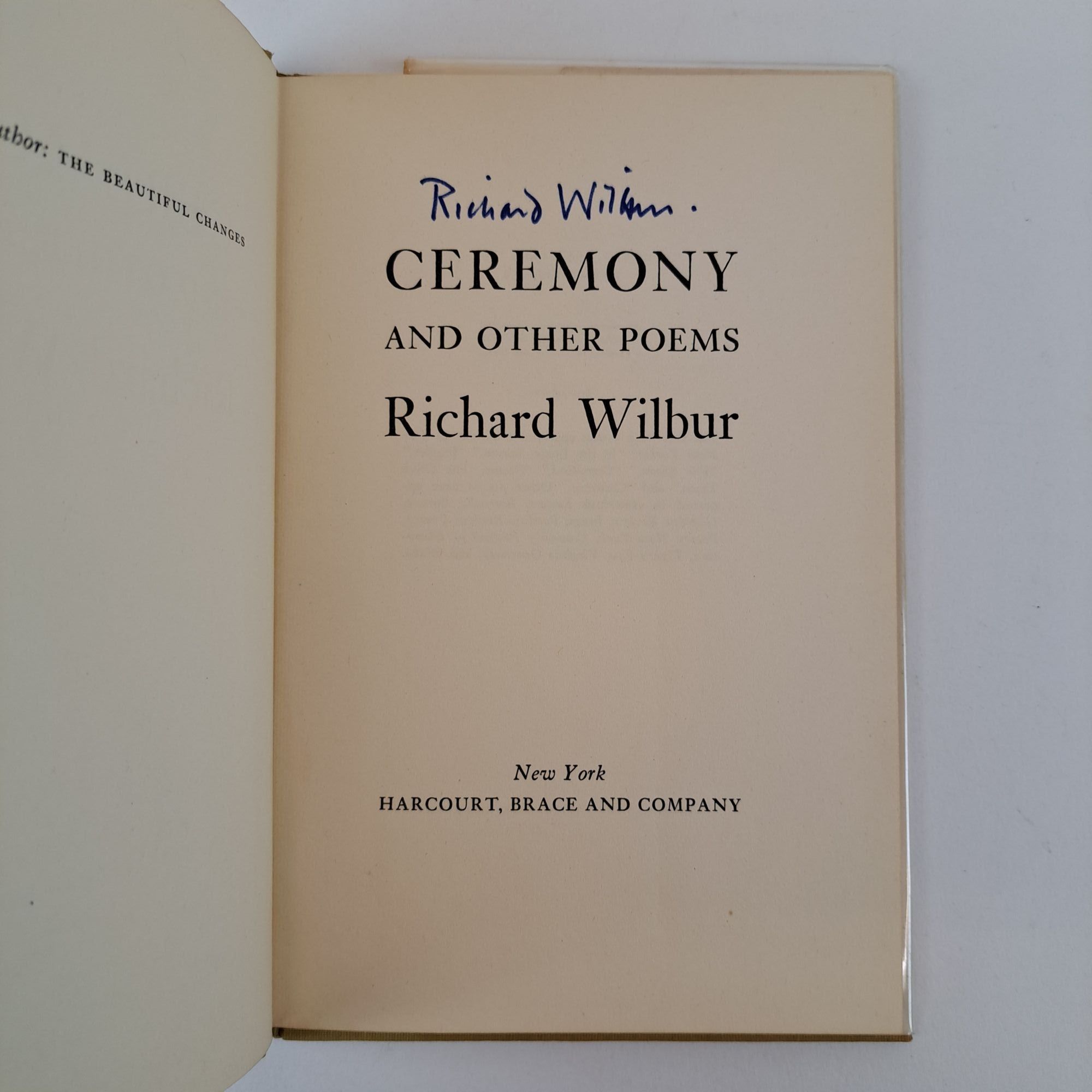 New York, NY: Harcourt Brace and Company, 1950. First Edition, First Printing. Hardcover. Octavo, 55 pages. In Very Good condition with a Good plus condition dust jacket. Faded to yellow spine with black lettering. Dust jacket is wrapped in a mylar covering, has liquid damage to the rear cover, a tear along the front tail edge, rear head edge and fore corner, chipping to the corners, and rubbing wear over the text at the bottom of the front flap. Boards have liquid damage and rubbing wear to the tail joint corners, a small dent along the rear fore edge, and mild age toning along the head edges. Textblock has mild age toning along the edges. Signed flat by Richard Wilbur on the title page. Shelved in Room C. 1395563. Special Collections.