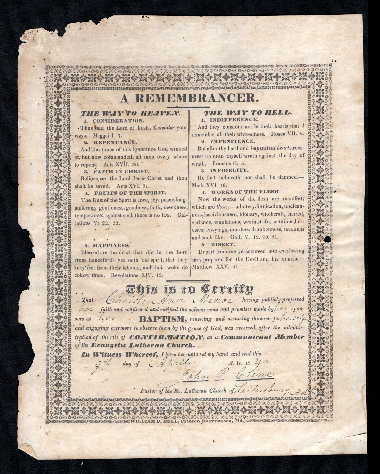 Leitersburg, MD: St. Paul's Evangelic Lutheran Church, 1842. General wear. Missing sections along the left and top edges, however it does not affect the text or decorative border.. A certificate commemorating Christina "Christi" Ann Minor's (1822-1912) confirmation and becoming a Communicant Member of the Evangelic Lutheran Church in Leitersburg, MD. The church was founded in 1826, and is still in existence today under the name "St. Paul's Evangelical Lutheran Church". The certificate has a large decorative border and has been filled out by John P. Cline, who the church's Minister from 1833-1846. The top half contains two sections, entitled "The Way to Heaven" and "The Way to Hell". Each section has five points, which are made by bible versus. For example, under the way to hell, 'Indifference' is the first item, and it states "And they consider not in their hears that I remember all their wickedness. Hosea VII. 2". Printer: William D. Bell from Hagerstown, MD. Single sided. Measures 10" x 7 3/4" Christina "Christi" Ann Minor was born on March 10, 1822 to John Minor (1790-1847) and Phoebe Burkhart (1793-1854) in Leitersburg, MD. She had numerous siblings: Francis "Frank" Minor (1813-1901), William Minor (1816-1889), John Burkhart Minor (1817-1896), George Minor (1819-1878), Catherine Minor (1821-1890), Jacob Minor (1824-1898), David Minor (1825-1905), Washington A. Minor (1827-1845), Henrietta Minor Hovis (1831-1882), Lewis C. Minor, 1832-1864, Oliver S. Minor (1835-1910), and Henry Clay Minor (1838-1870). She married William Anderson (1827-1892) and had three children: Mary E. Anderson (1852-1935), Freeland W. Anderson (1854-1929), and Flora A. Anderson Miller (1860-?). She died on October 11, 1912.