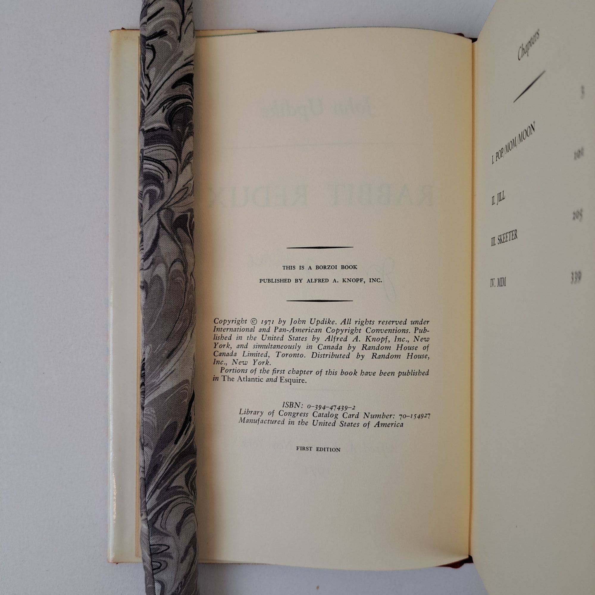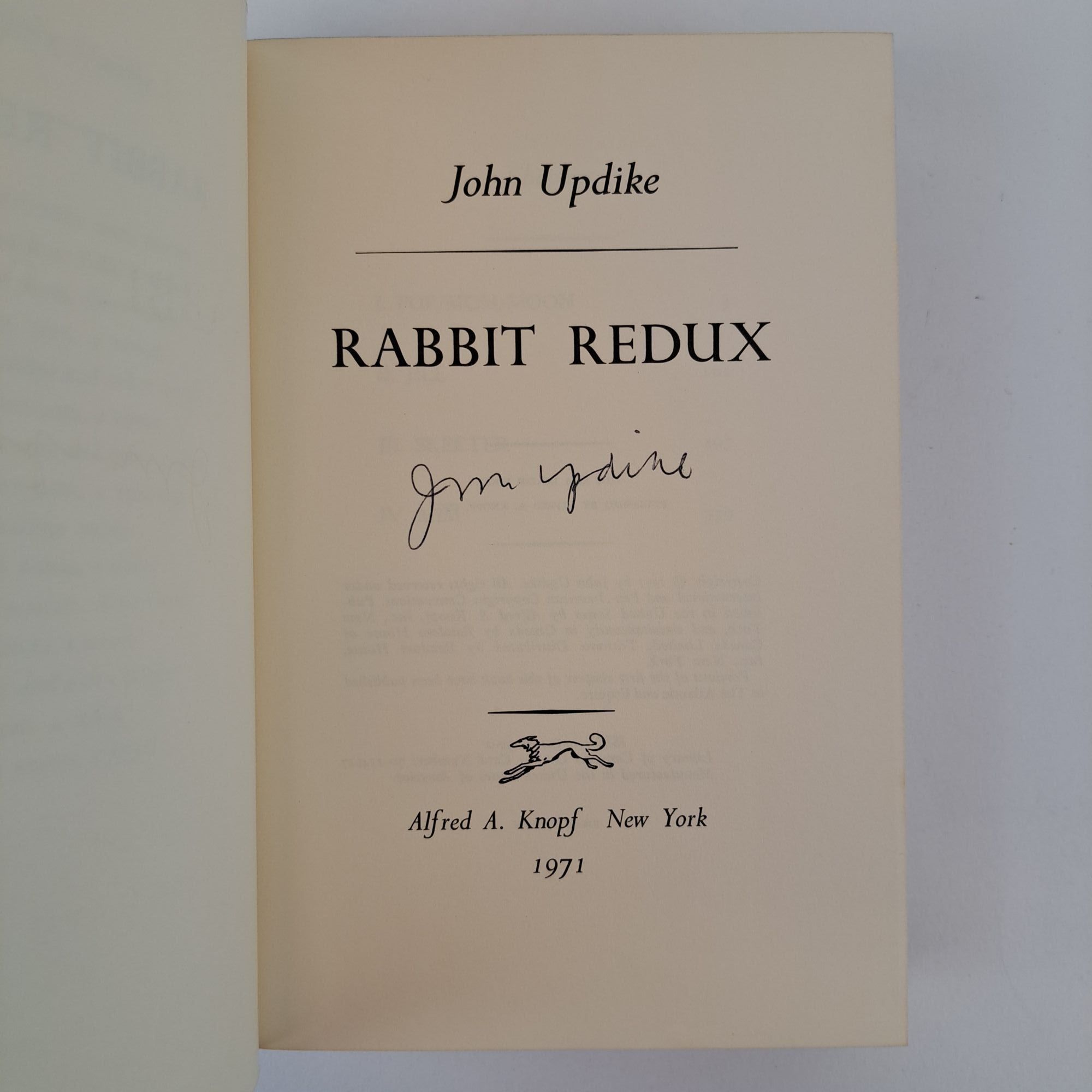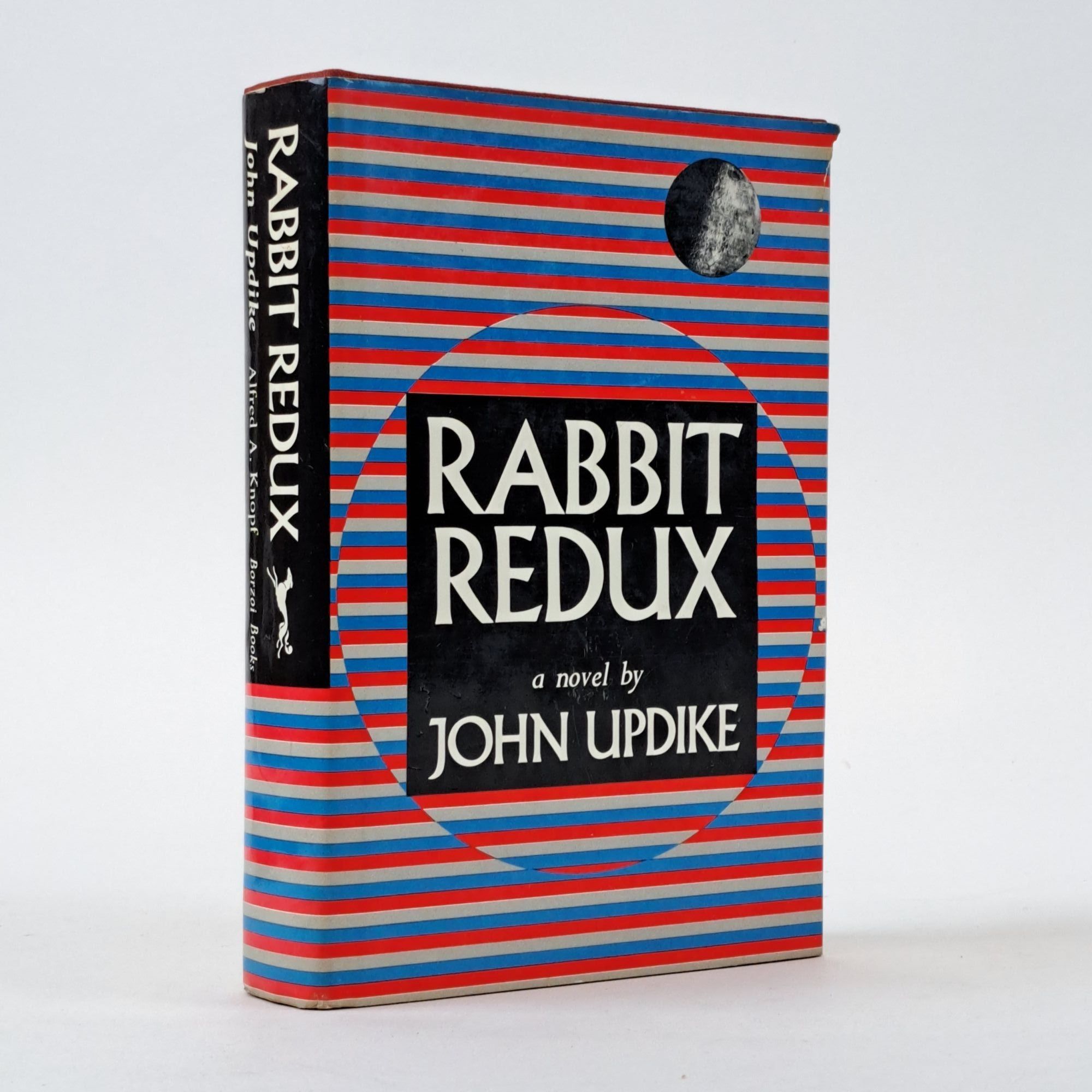 New York, NY: Alfred A. Knopf, 1971. First Edition, First Printing. Hardcover. Octavo, 406 pages. In Very Good condition with a Very Good minus condition dust jacket. Black, red, blue, and silver spine with white lettering. Dust jacket is wrapped in a mylar covering, price clipped, has a tear along the front head fore corner, bending wear along the rear head edge, mild age toning along the edges, and mild shelving wear. Boards have a stain on the front tail fore corner, and mild shelving wear. Textblock has pink stains on the pastedowns, rubbing wear along the rear hinge edges, and stains along the head edges. Signed flat by John Updike on the title page. Shelved in Room C. 1395566. Special Collections.