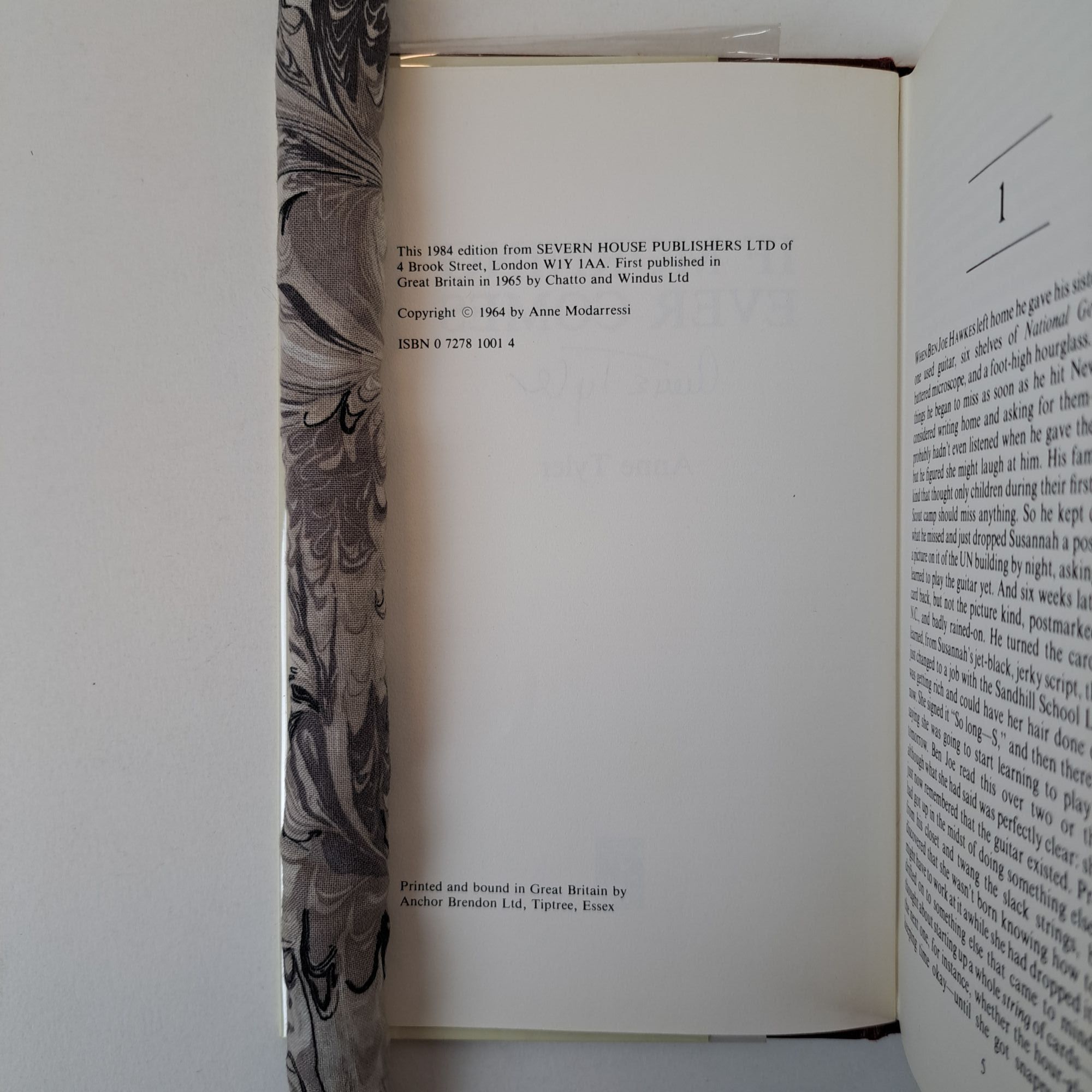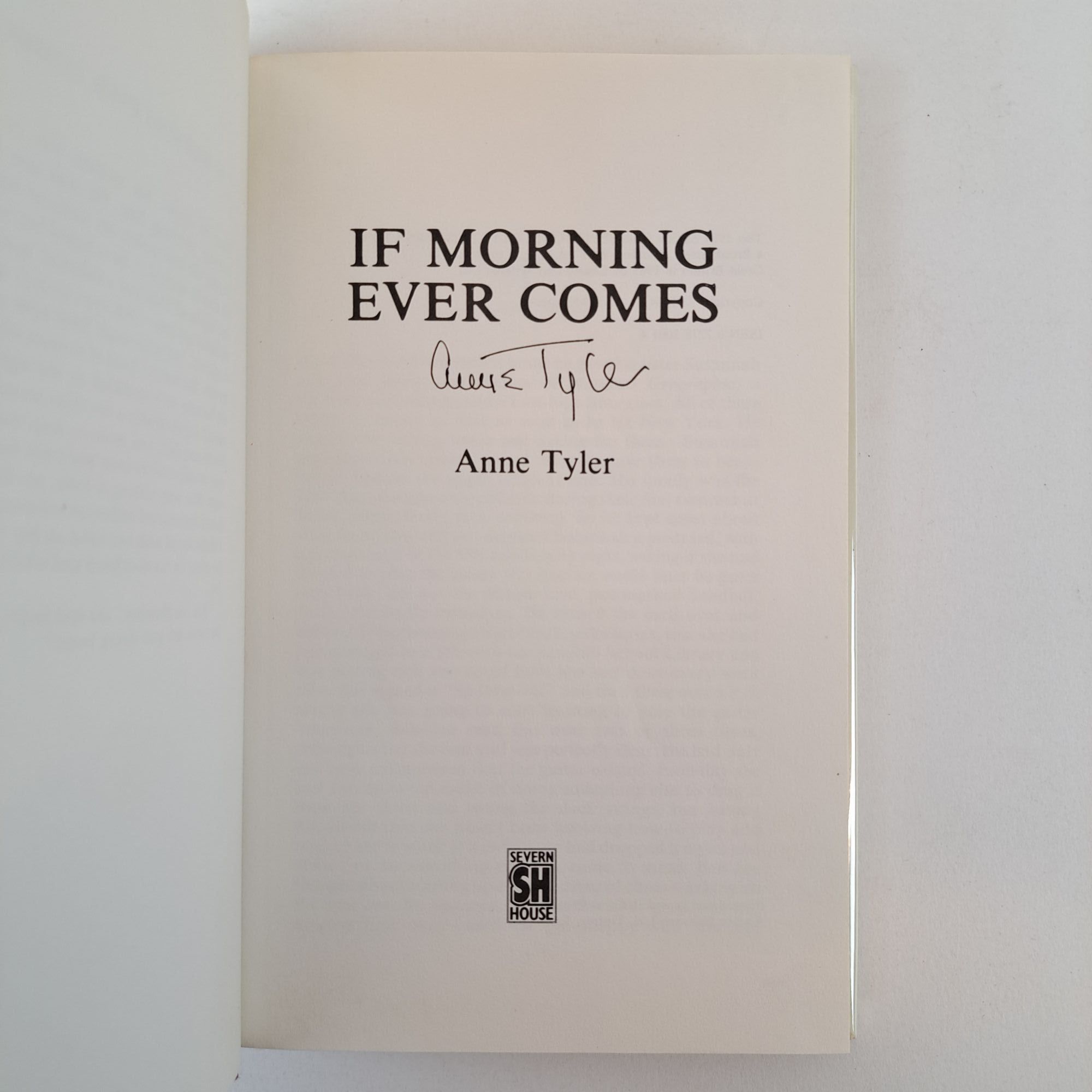 London, UK: Severn House, 1964. Hardcover. Octavo, 187 pages. In Very Good minus condition with a Very Good condition dust jacket. White spine with brown and gray lettering. Dust jacket is wrapped in a mylar covering, price uncut "£6.95", has mild shelving wear. Boards have mild shelving wear. Textblock has discoloration along the pastedowns, small pink stains along the hinge between the half title page and title page, and light foxing along the edges. Contains a postcard in the rear cover. Signed flat by Anne Tyler on the title page. Shelved in Room C. 1395567. Special Collections.