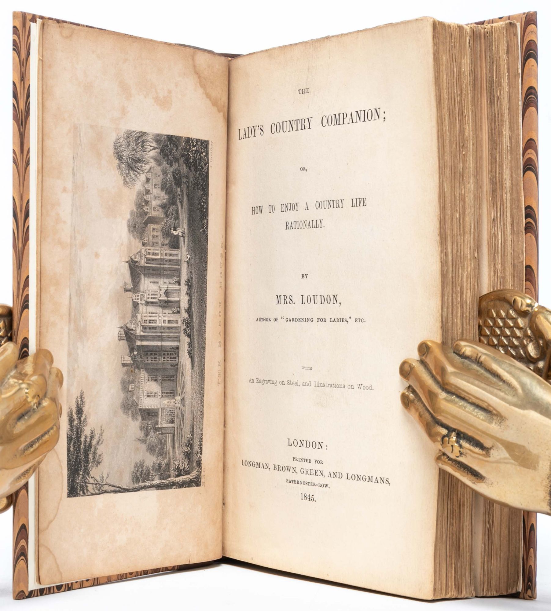 London: Longman, Brown, Green, and Longmans, 1845. First edition. Very Good. Presentation copy, inscribed "To Mrs. Norman with the kind regards of the author" on upper flyleaf. Rebound in modern half brown leather over marbled boards. Octavo. Dampstaining to frontispiece, but largely clean throughout. Octavo. xi, 396, 32 [publisher’s catalogue] pp. Complete with frontispiece and three full-page illustrations, plus text figures. Very Good. A scarce example of Jane Loudon's practical advice to women who find themselves living in the countryside, OCLC records only six copies in the United States.