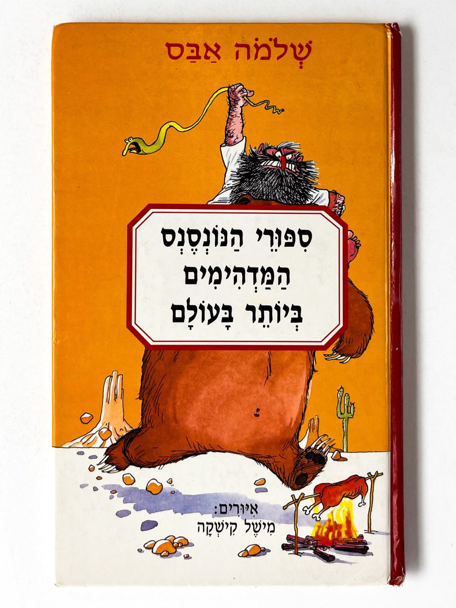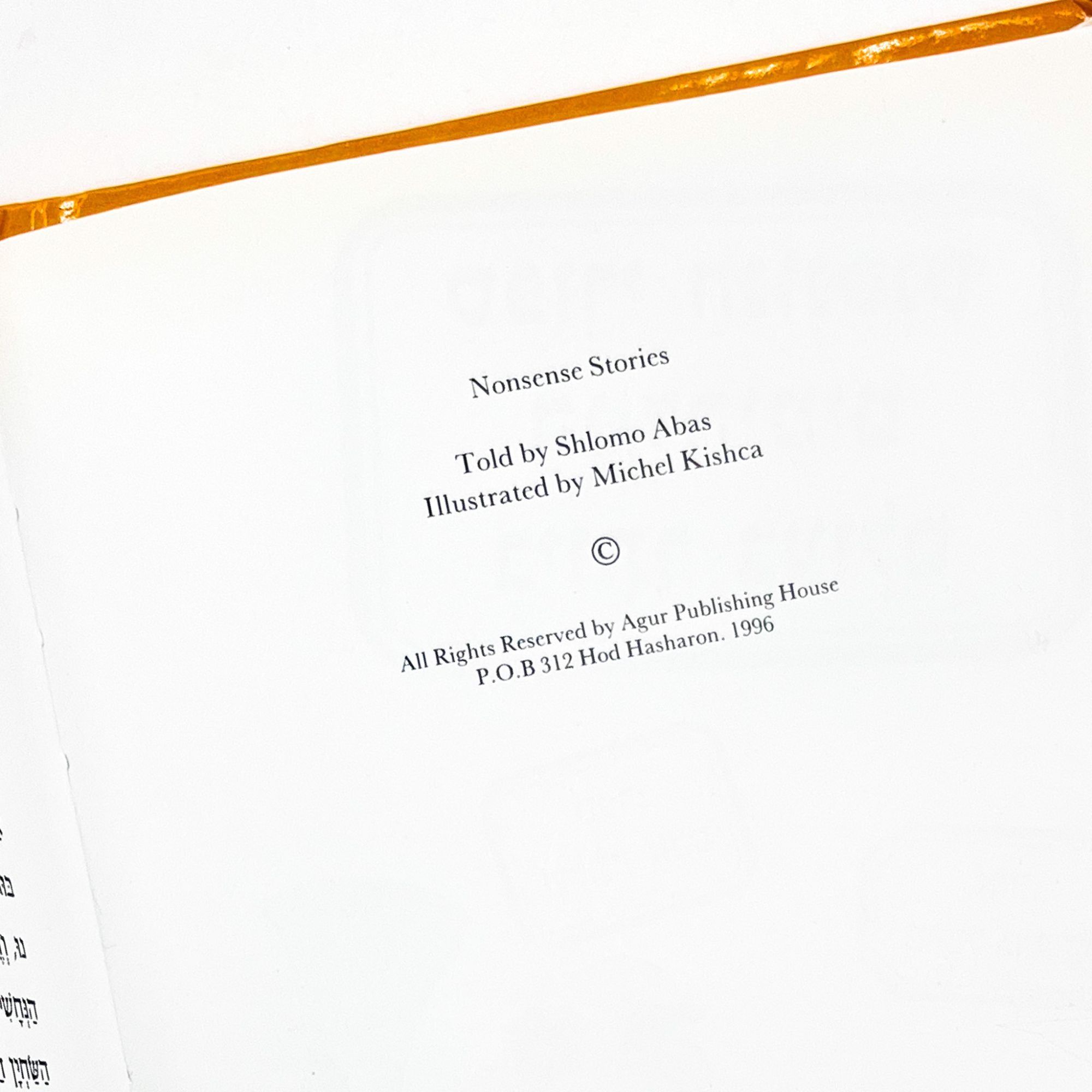 Hod Hasharon: Agur Publishing House, 1996. First edition. Very good plus.. Signed first printing of this Israeli collection of absurd and hilarious short stories for children in Hebrew, with equally humorous illustrations. 9.5'' x 5.75''. Original color pictorial boards. No dust jacket. Illustrated in color. 80 pages. Inscribed by Abas in Hebrew to front flyleaf. Scattered pencil underlining. Binding with light edgewear, bumping to corners and spine ends. Leaves with occasional mild wear to margins. Bright.